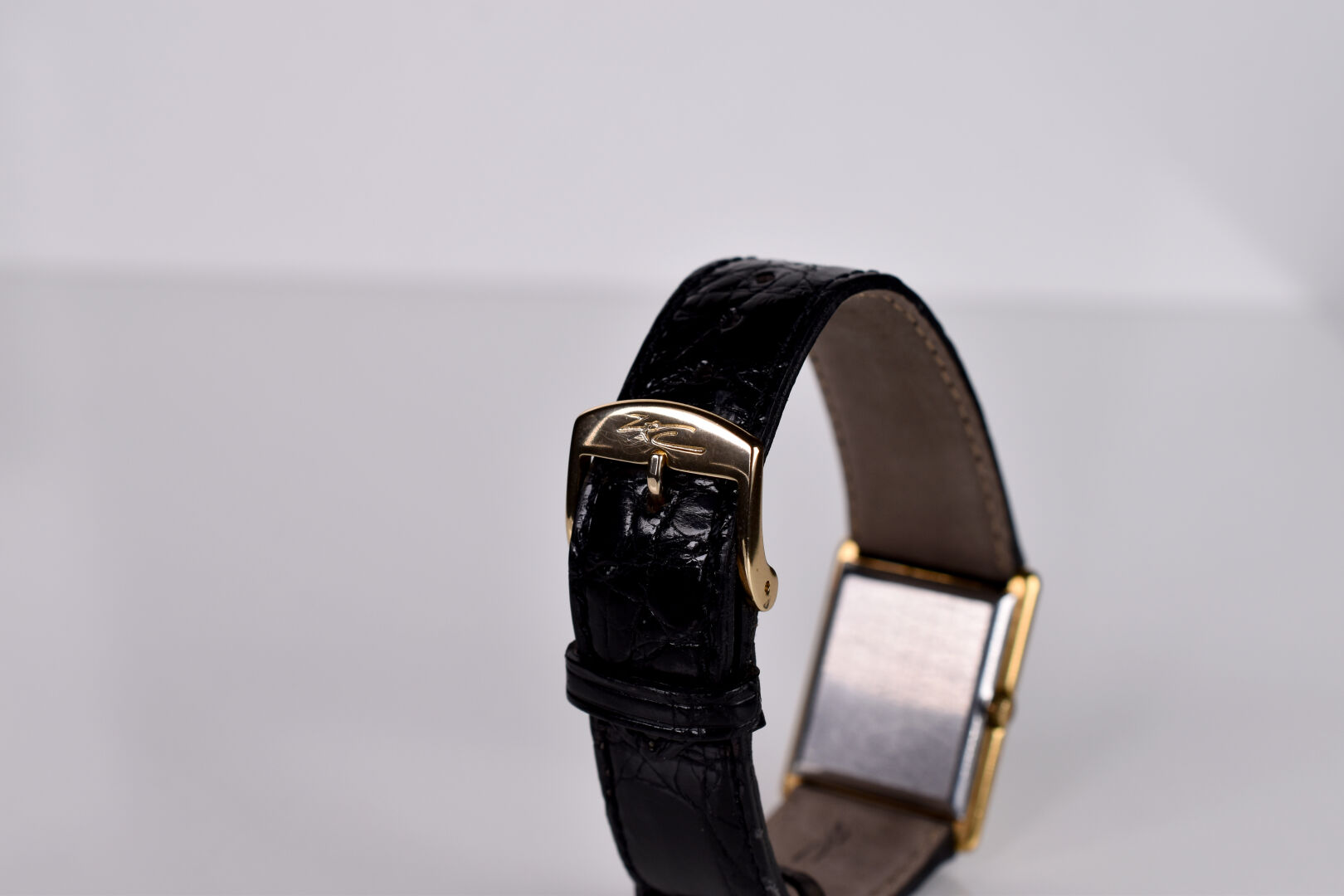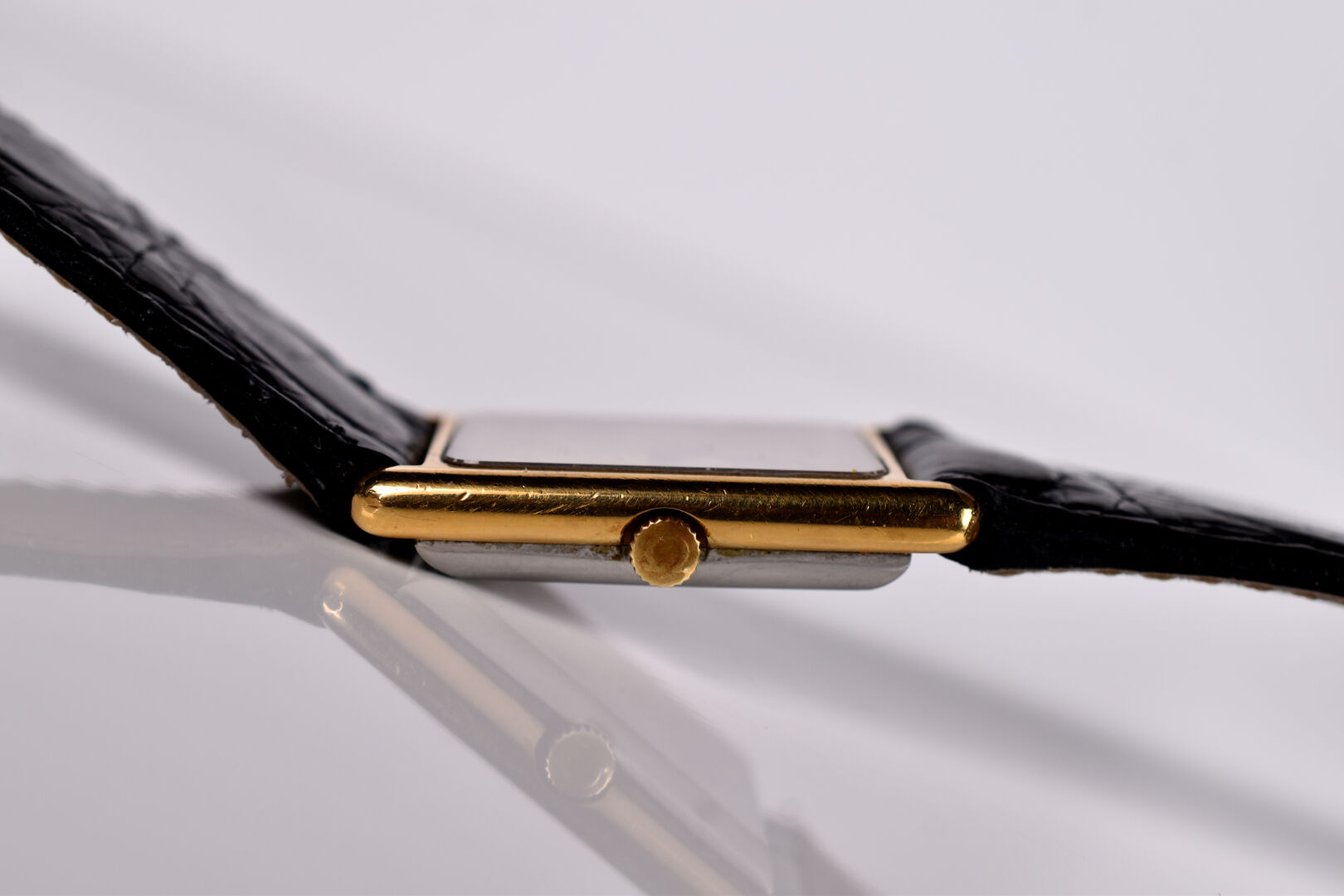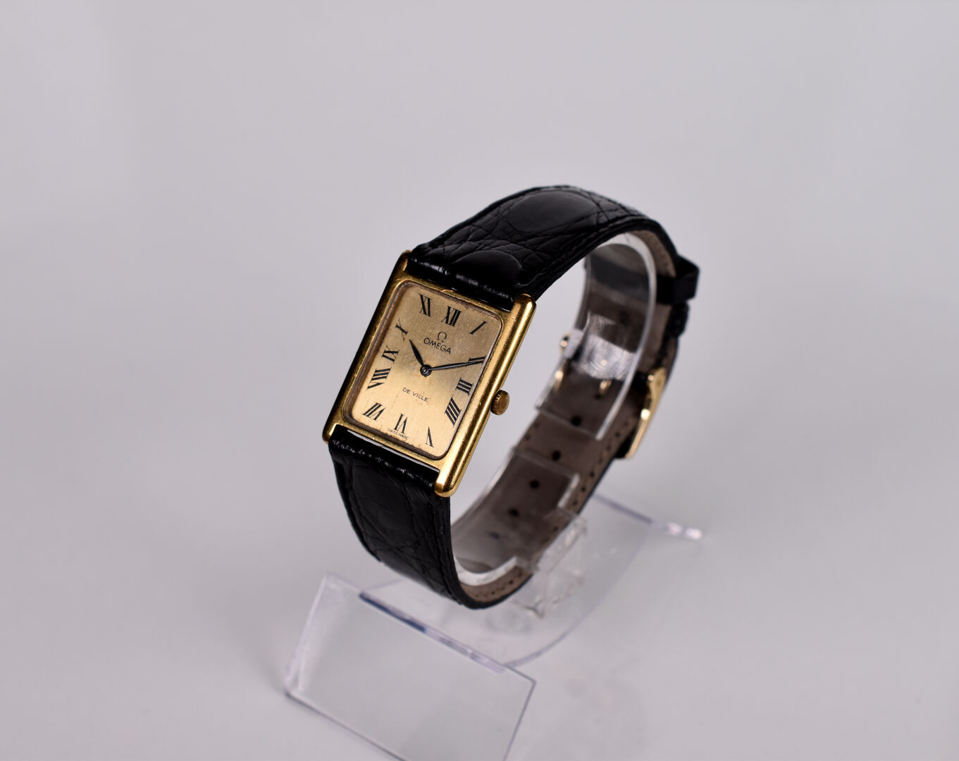 OMEGA DE VILLE. Montre vintage d’homme, boitier rectangle en acier doré et acier. Cadran signé à fond doré avec index des heures en chiffres romains (taches au cadran). Mouvement mécanique à remontage manuel (fonctionne). Bracelet en cuir noir façon crocodile (très légèrement frotté). Boucle ardillon dorée. Boitier 22 x 27 mm.