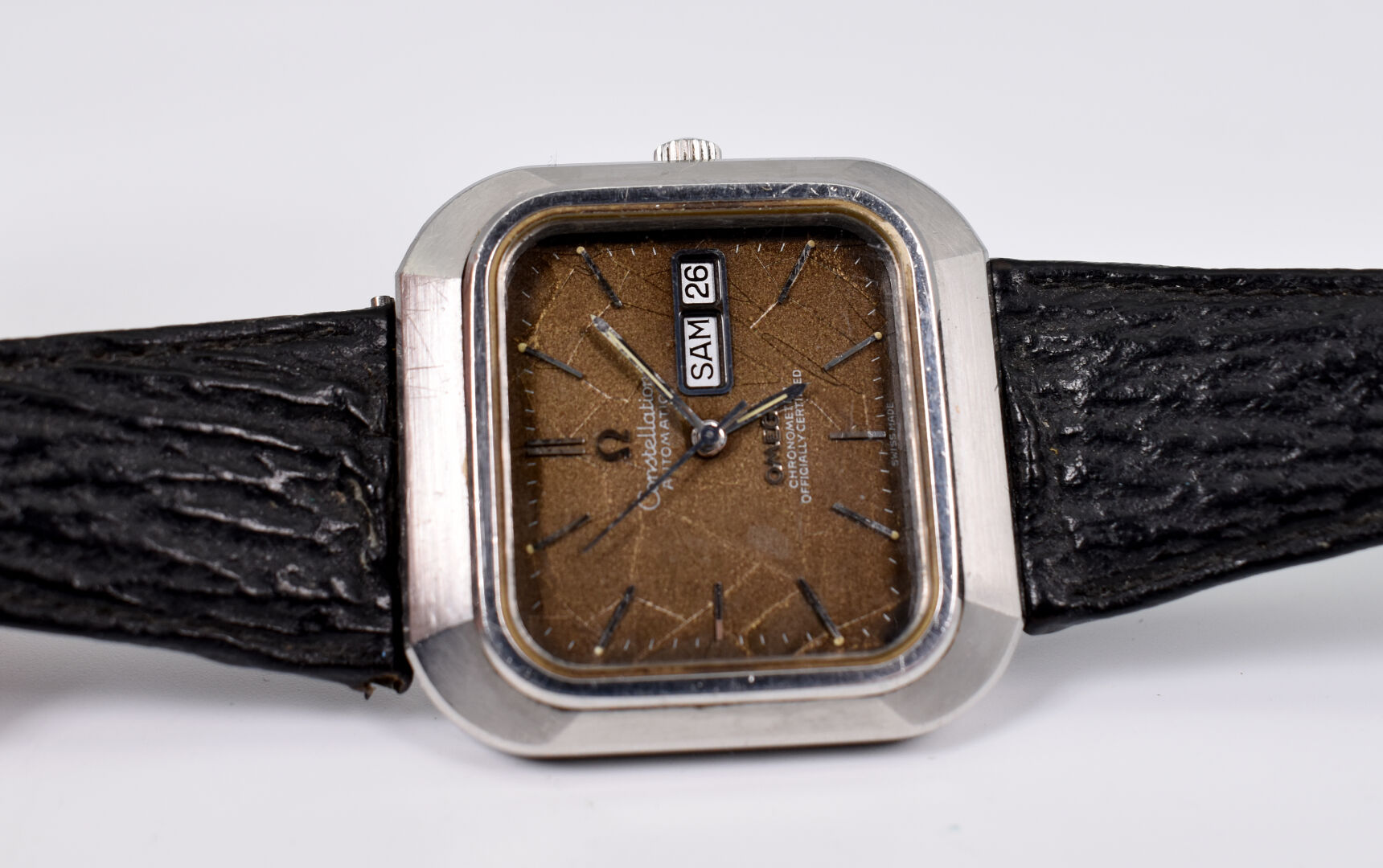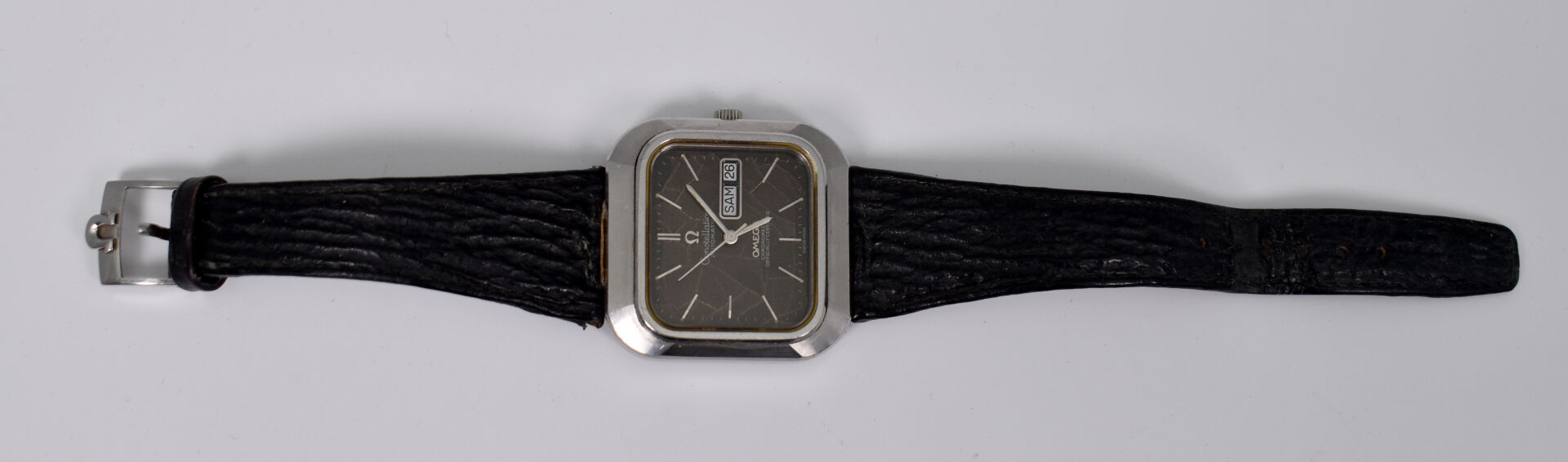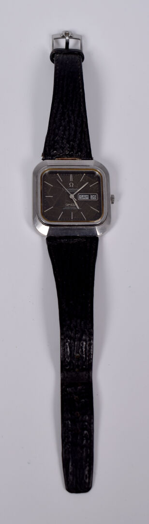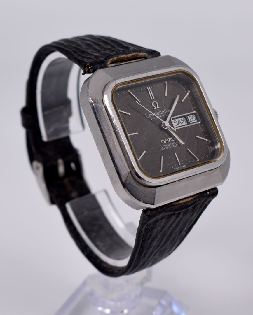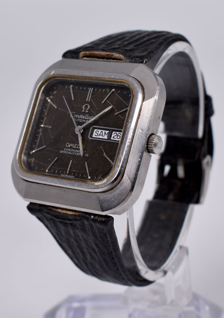 OMEGA. Montre bracelet d’homme modèle Constellation. Boitier carré en acier. Cadran signé à fond brun, guichet date à 3 heures. Mouvement mécanique à remontage automatique (démarre, prévoir une révision). Bracelet de cuir noir.