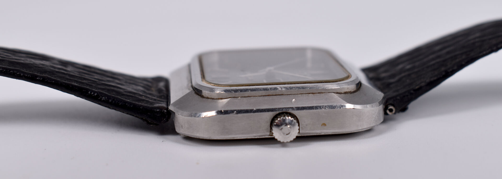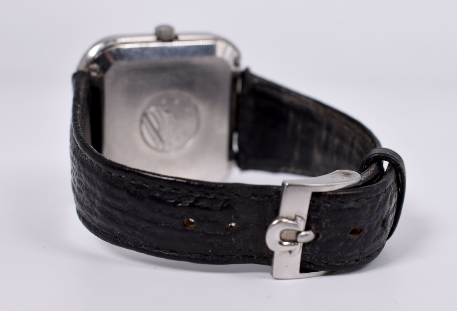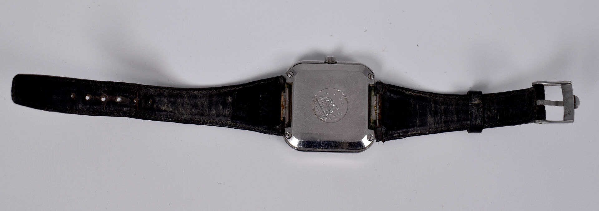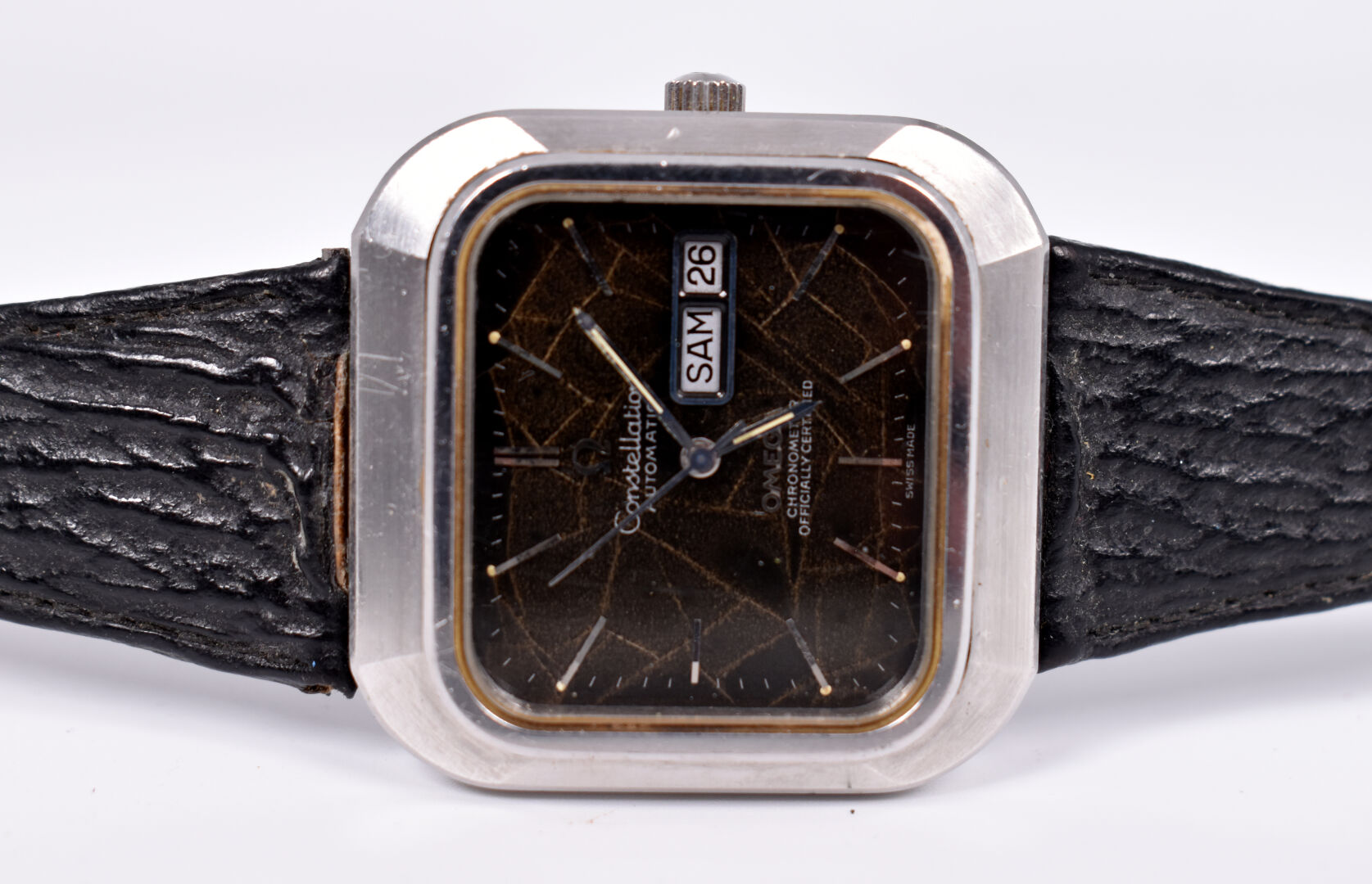OMEGA. Montre bracelet d’homme modèle Constellation. Boitier carré en acier. Cadran signé à fond brun, guichet date à 3 heures. Mouvement mécanique à remontage automatique (démarre, prévoir une révision). Bracelet de cuir noir.