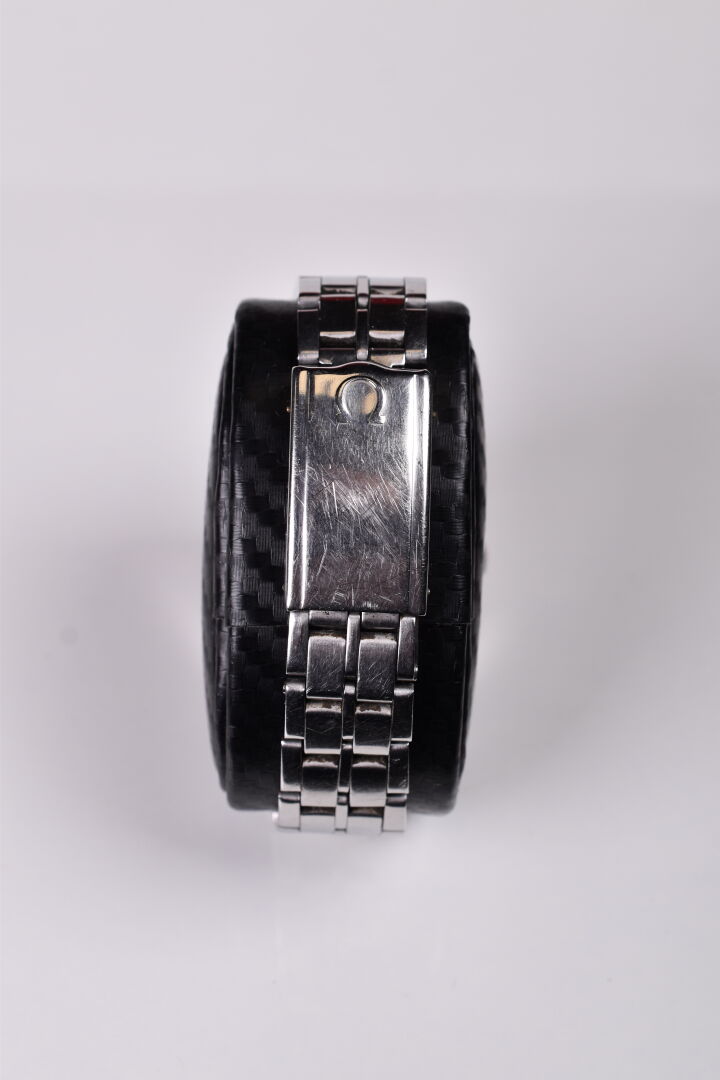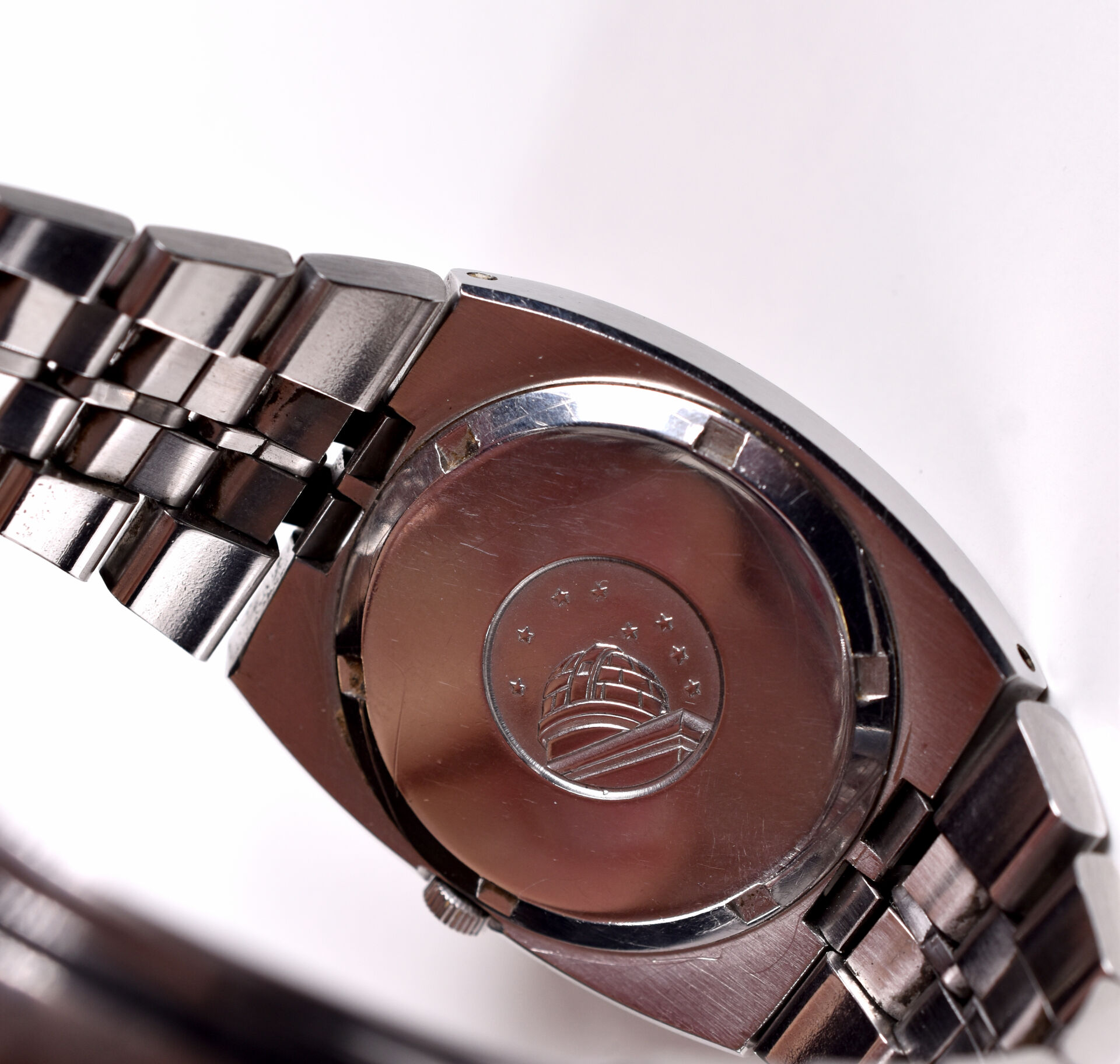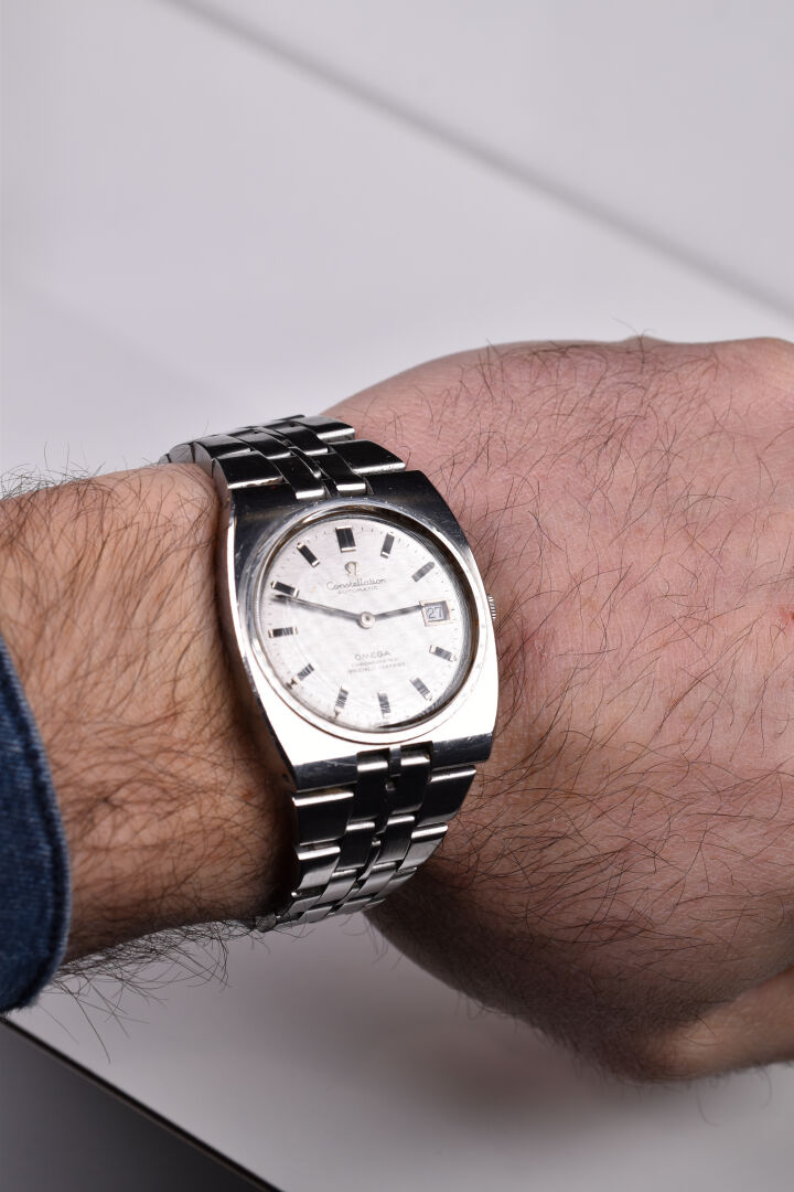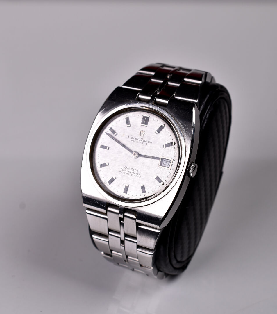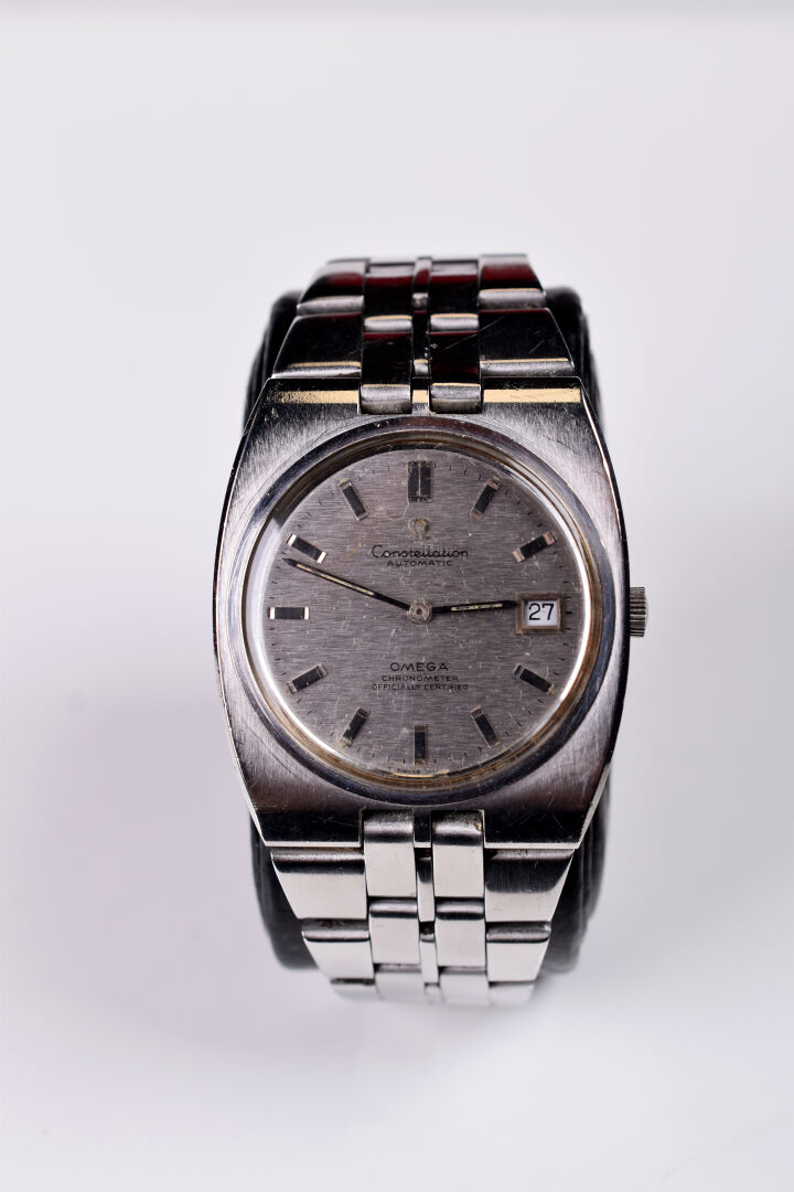 OMEGA. Montre bracelet d’homme modèle « Constellation », tout en acier. Cadran à fond gris, signé, guichet date à 3h. Diam. : 38 mm (avec couronne, manque la trotteuse remontoir rapporté). Bracelet d’origine. Usures d’usage. Boîte.