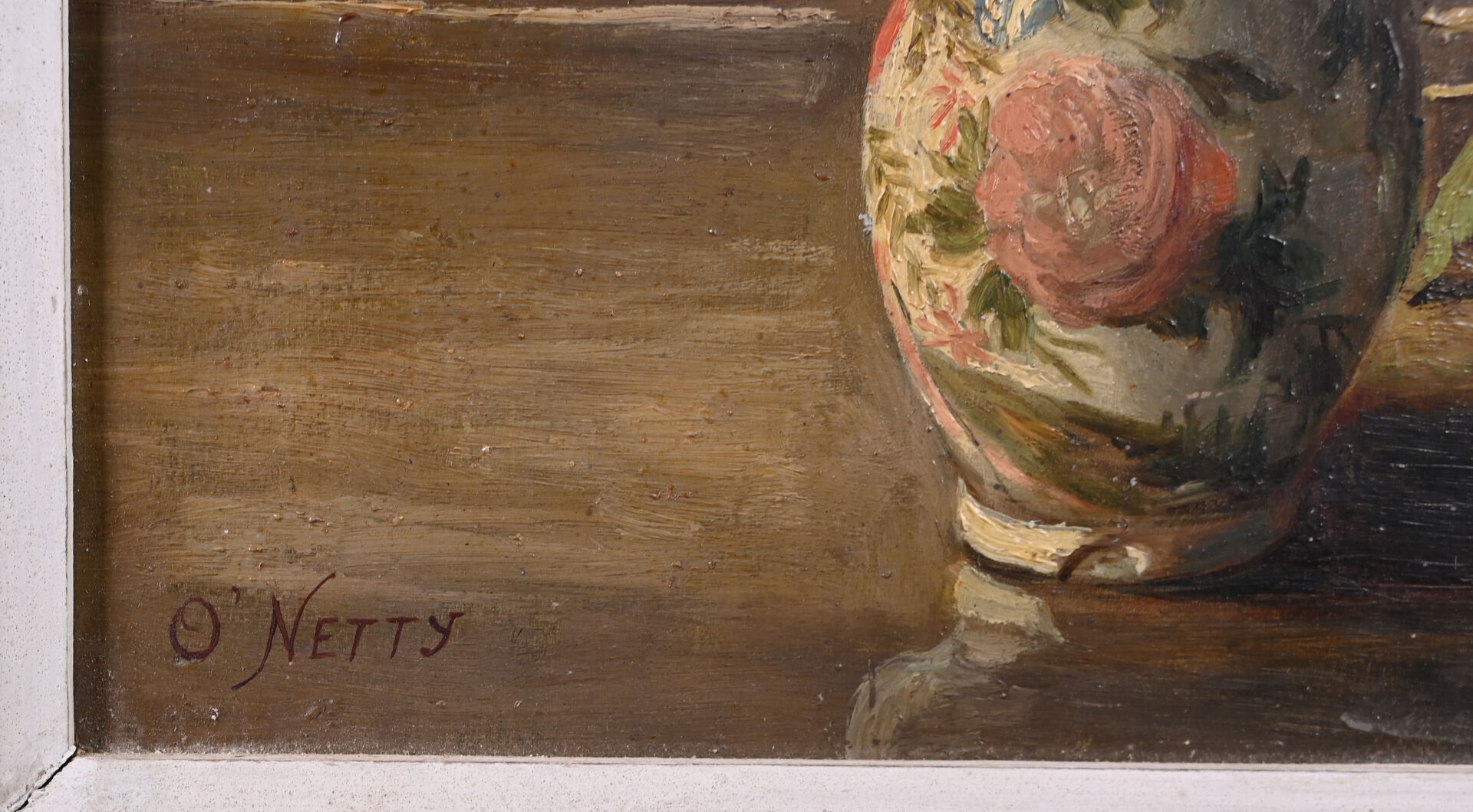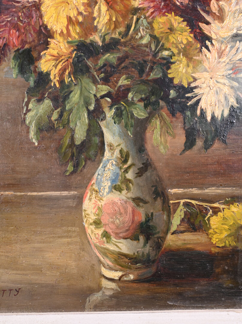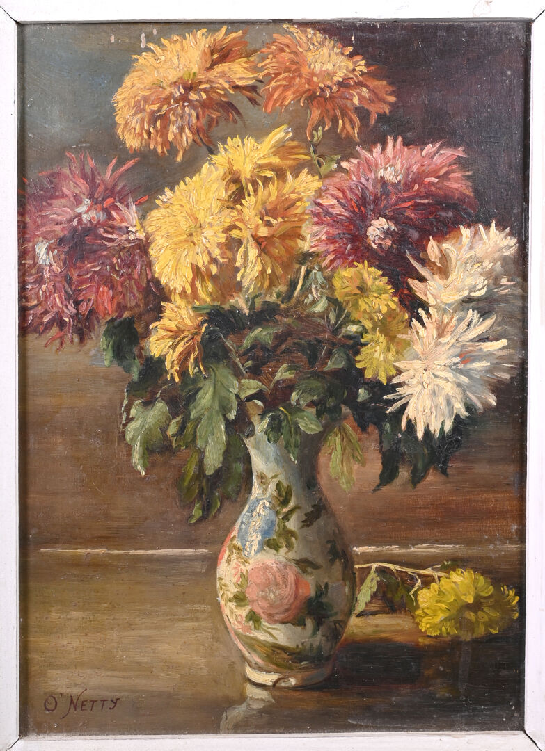 O’NETTY (XXe siècle). Bouquet de chrysanthèmes dans un vase. Huile sur panneau signée en bas à droite. 33 x 24,5 cm.