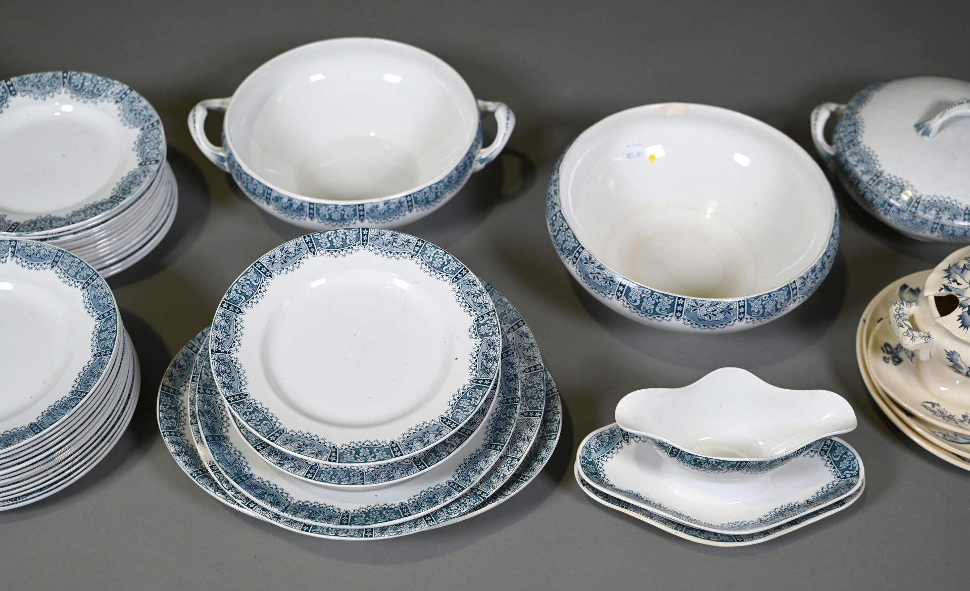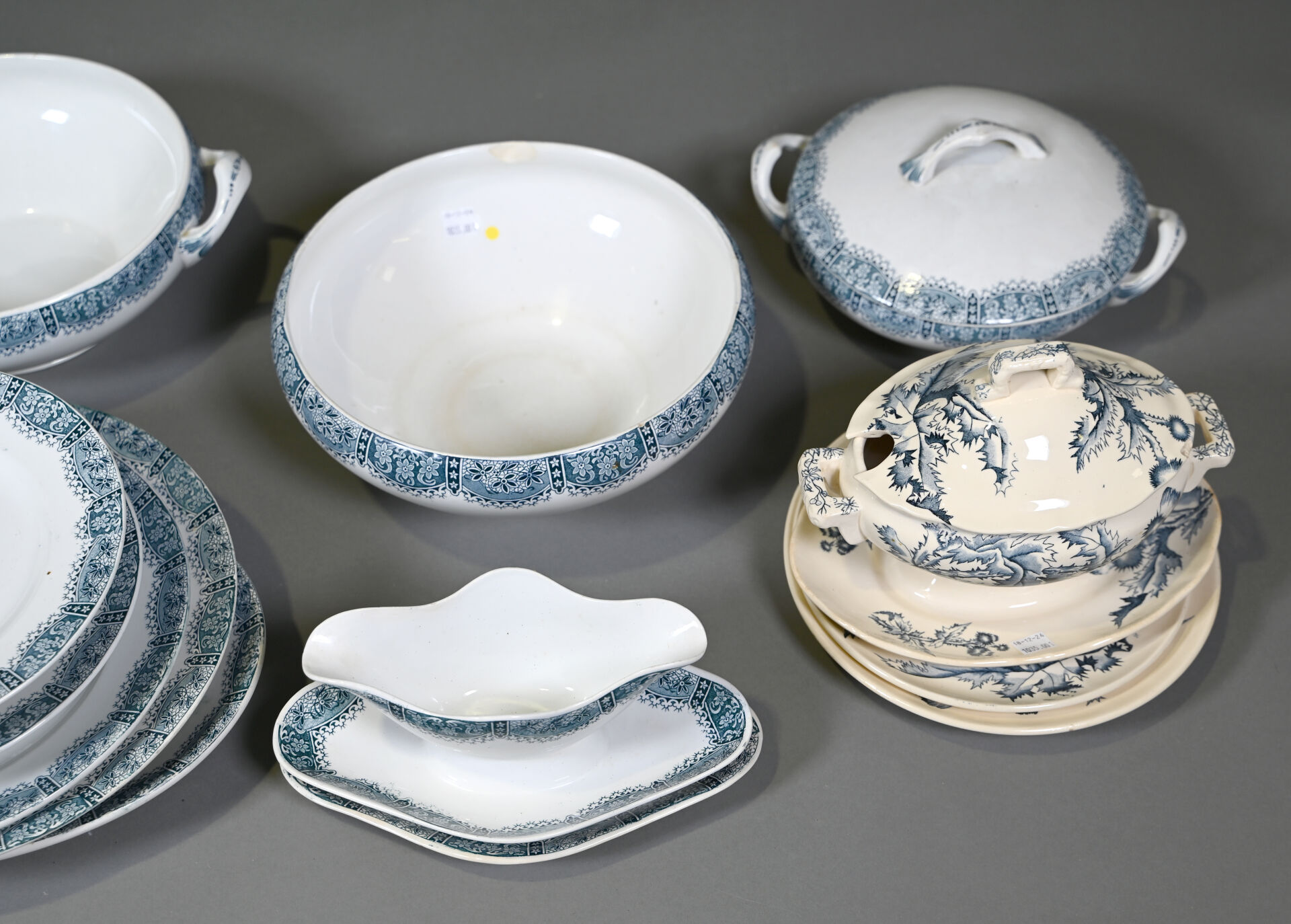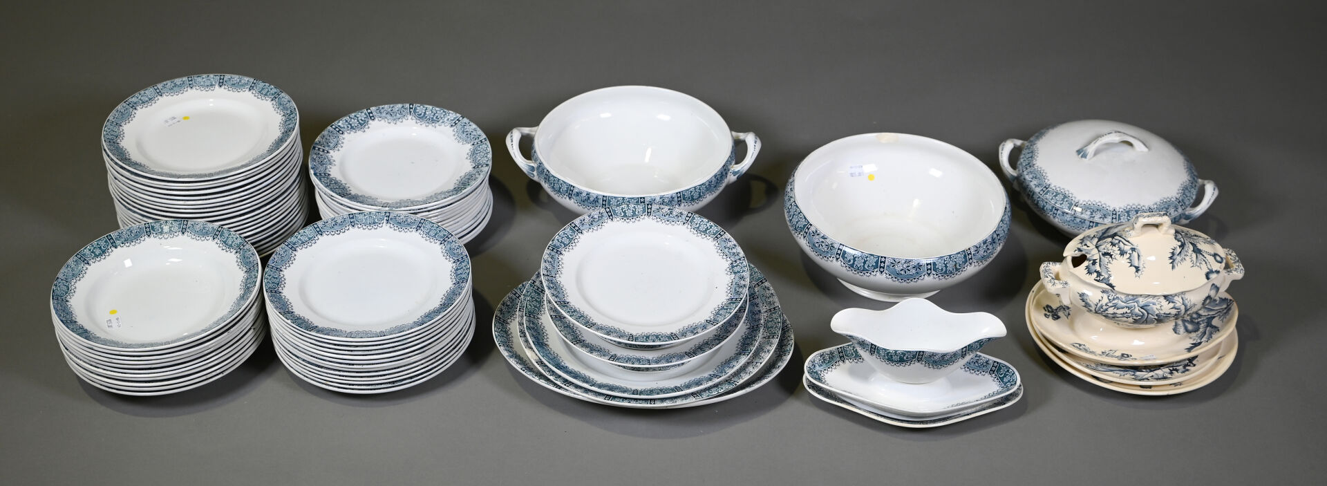 ORCHIES-NORD. Partie de service de table en faïence modèle « dentelle » à décor en bleu comprenant , une soupière, un légumier, un saladier, trois plats de service, une saucière à fonds solidaire, deux compotiers, un ravier, 34 assiettes plates, 11 assiettes creuses, 11 assiettes à dessert et 3 assiettes à entremets (petits fèles et égrenures). Marqué. On joint une saucière et deux assiettes d’un autre service en faïence à décor de chardons.