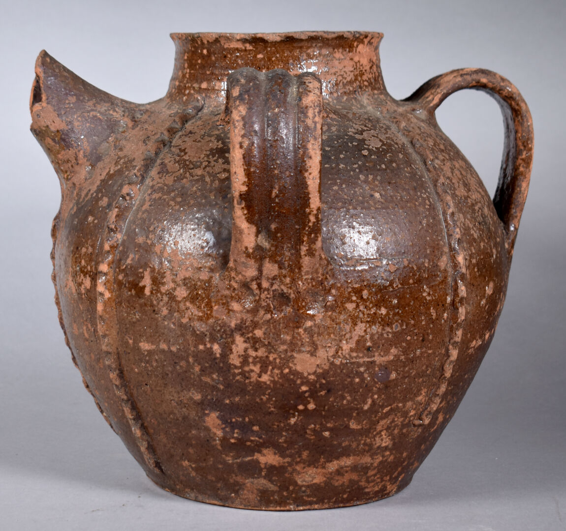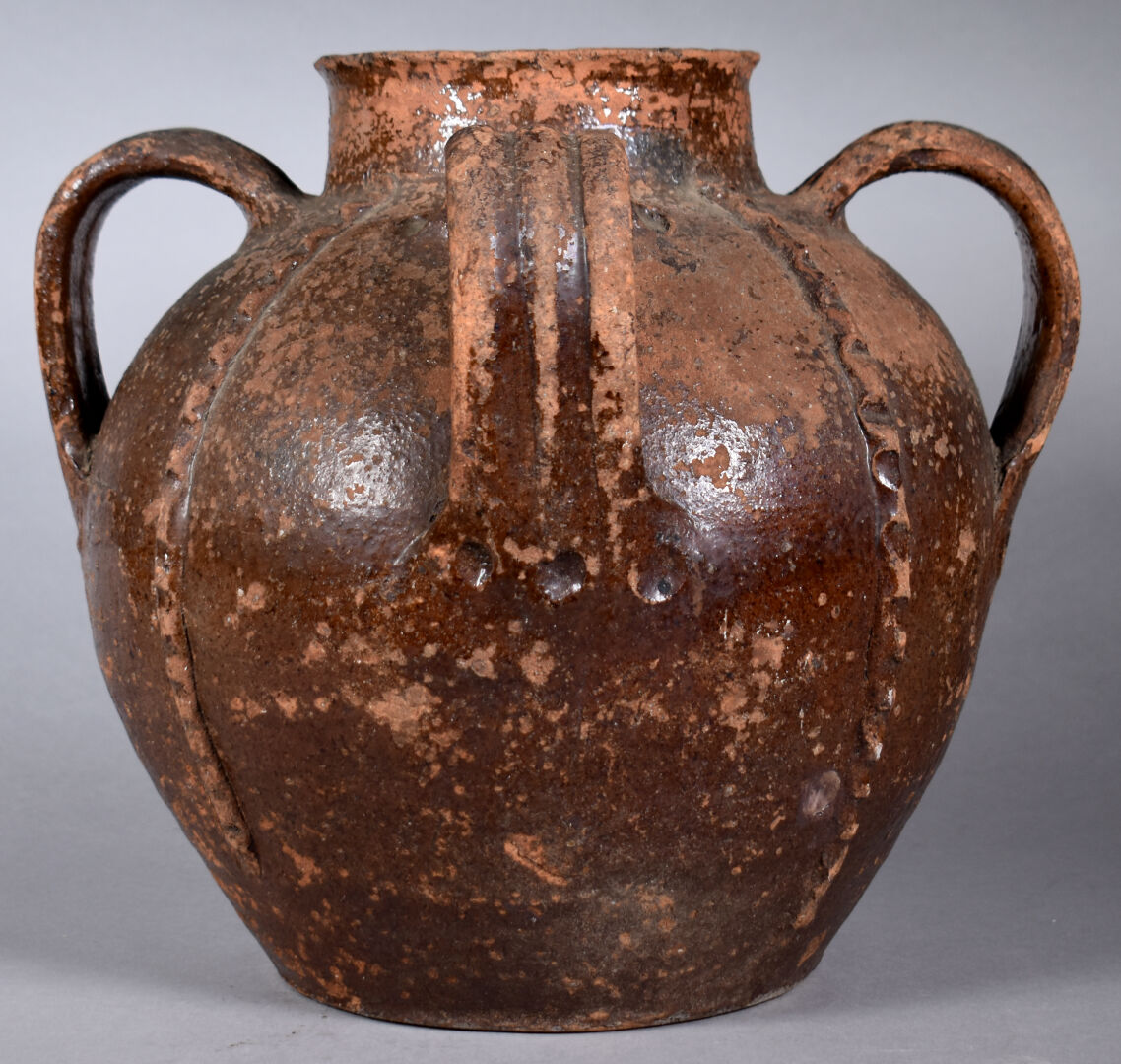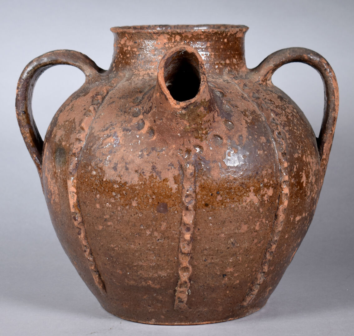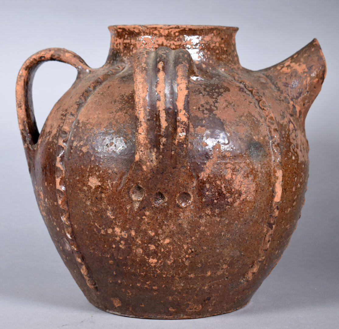 Orjol, chevrette ou cruche à huile en terre cuite (éclats au bec) vernissée brun. XIXe siècle ?. Haut. : 30 cm.