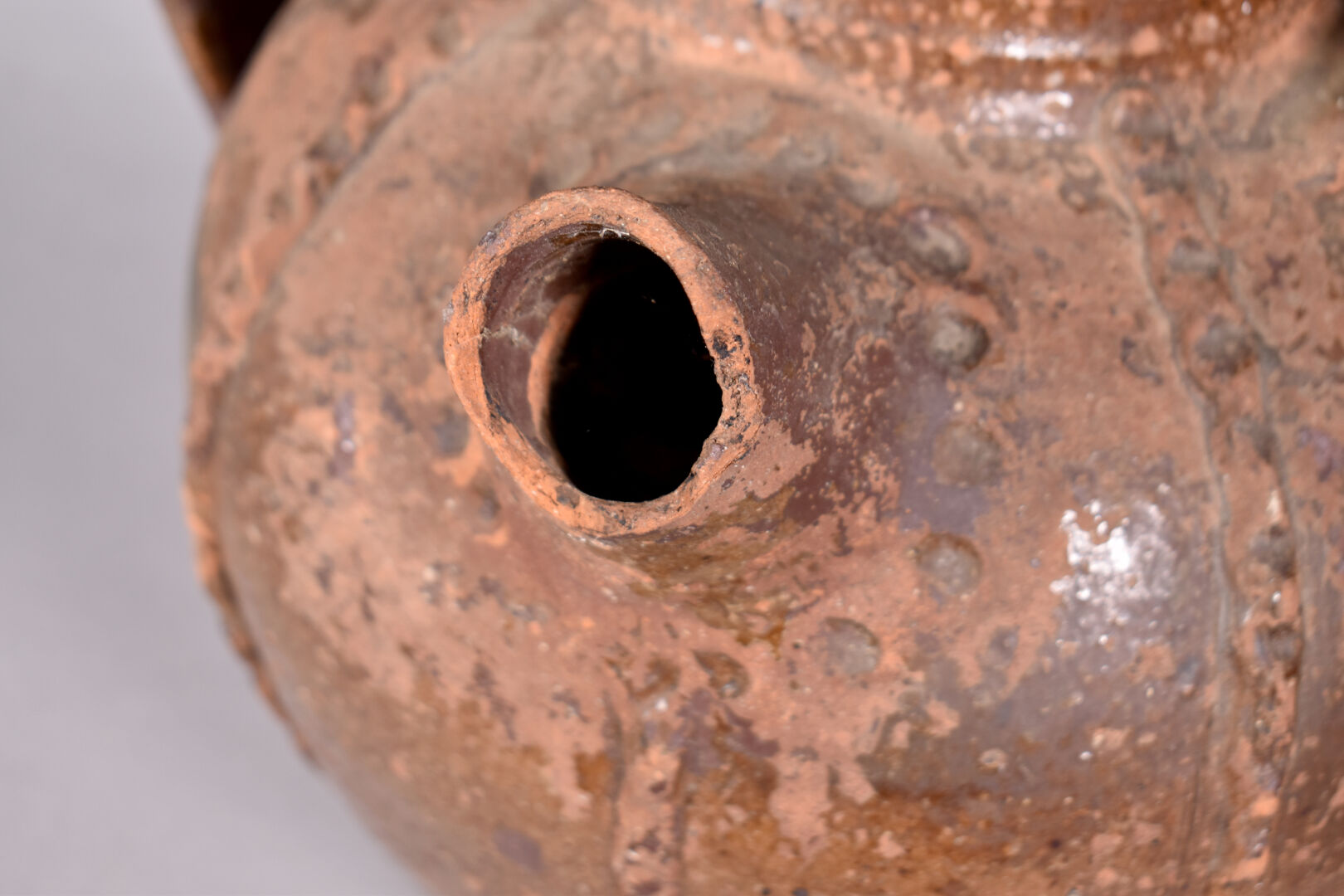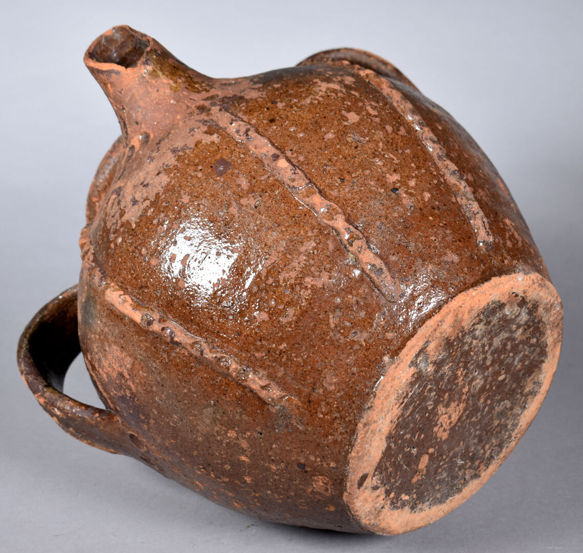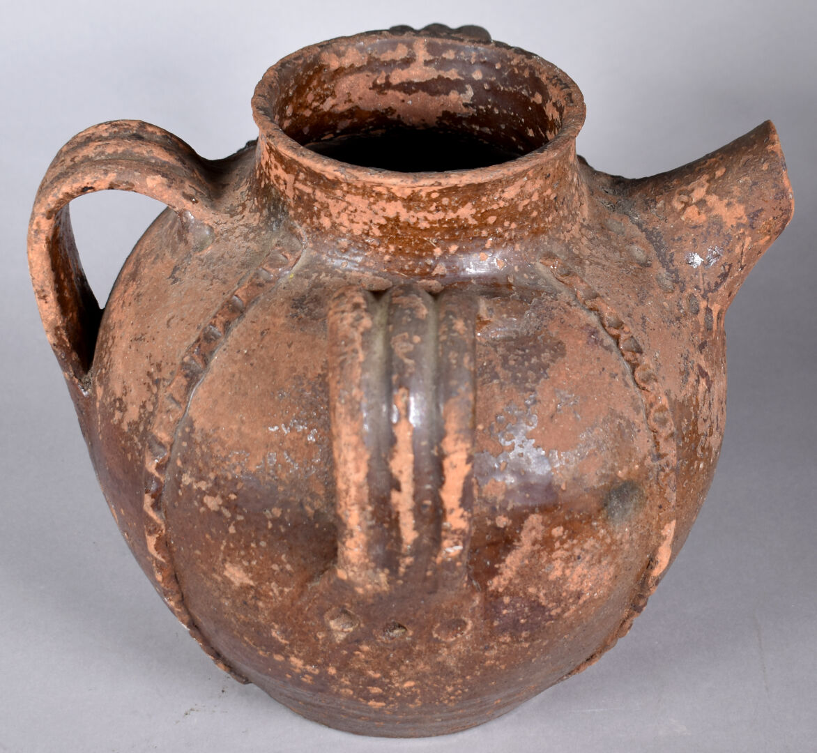 Orjol, chevrette ou cruche à huile en terre cuite (éclats au bec) vernissée brun. XIXe siècle ?. Haut. : 30 cm.
