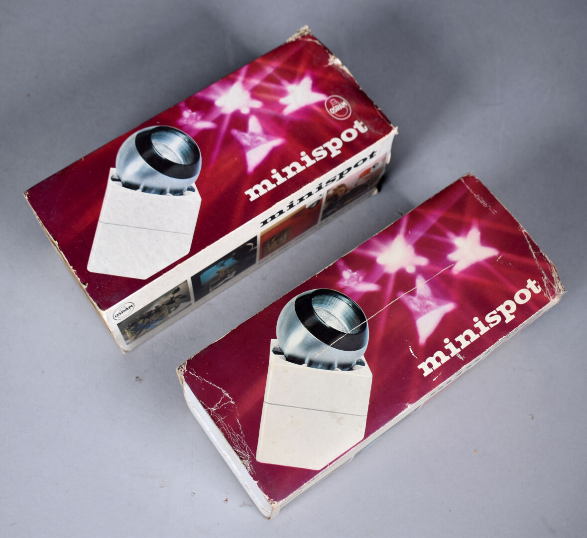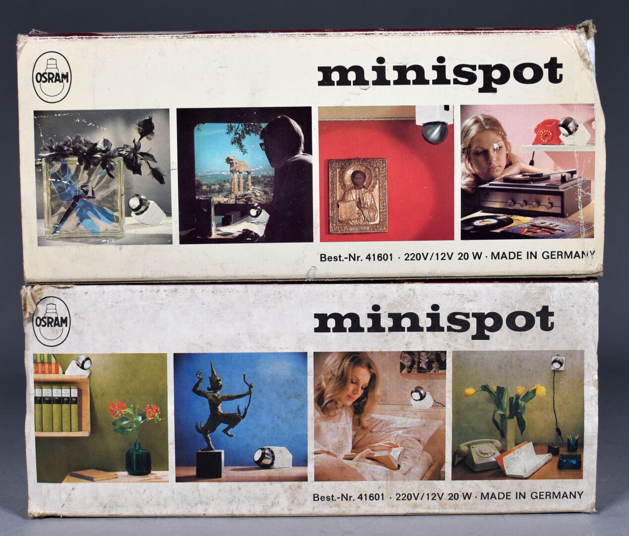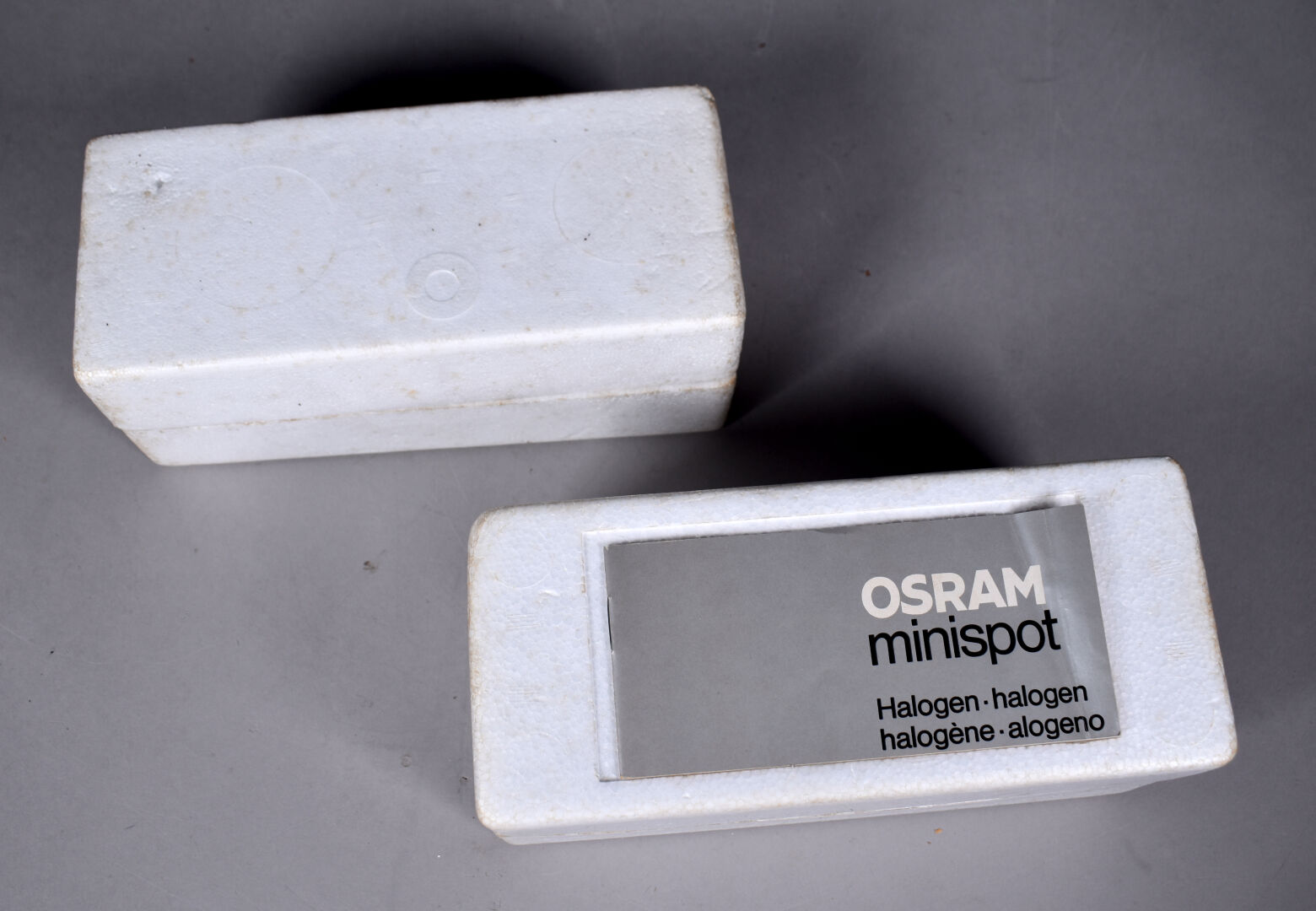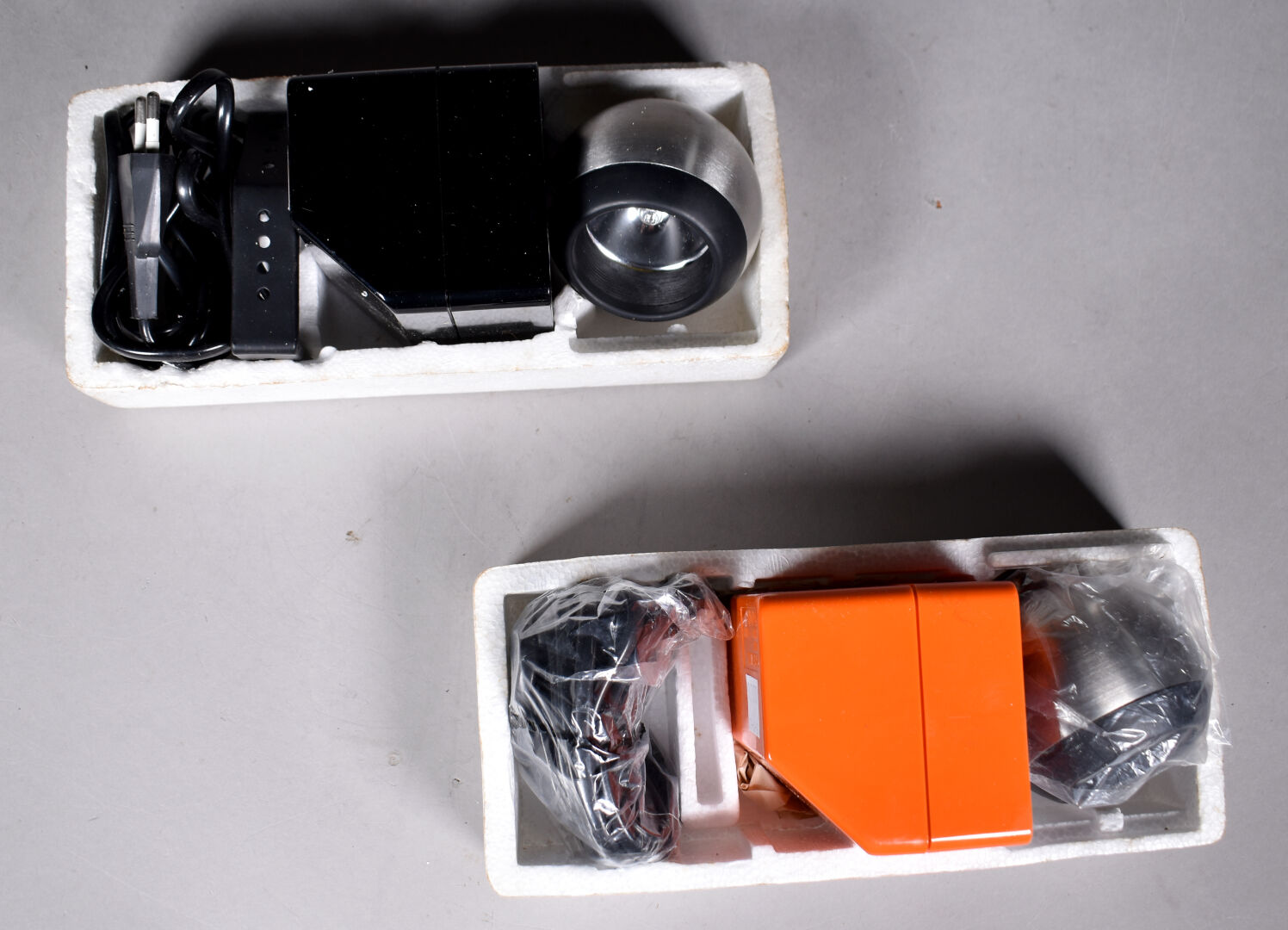 OSRAM MINI-SPOT 1. Paire de mini-spot modèle 41601. 1 de couleur orange, l’autre de couleur noire. Globe en acier inoxydable aimanté permettant d’être orienté, boitier plastique. État neuf, boîte d’origine. Support de montage. Vers 1970. Haut. : 14 cm.