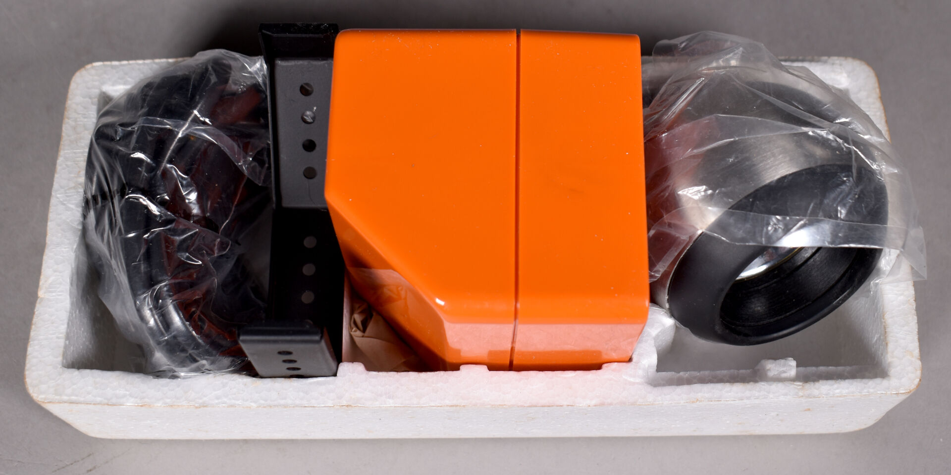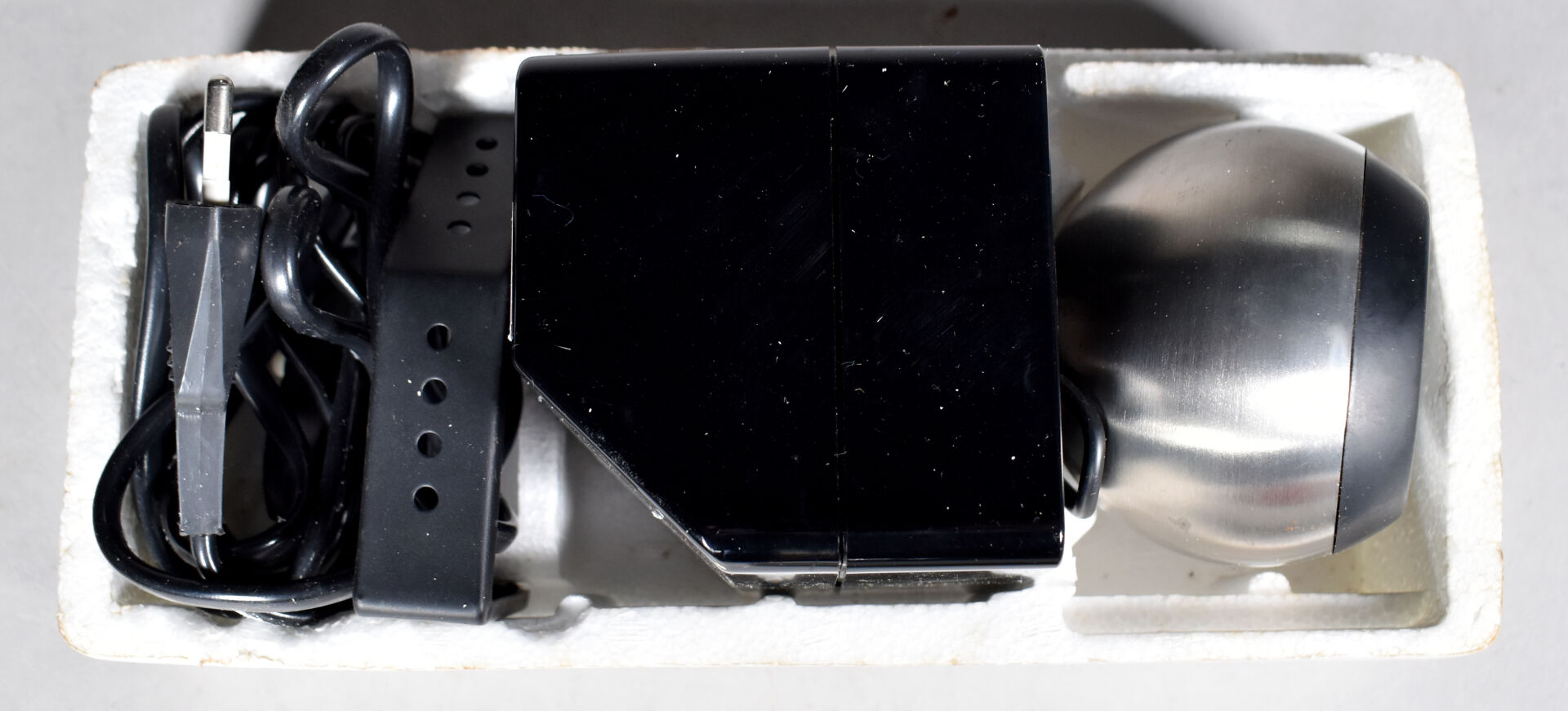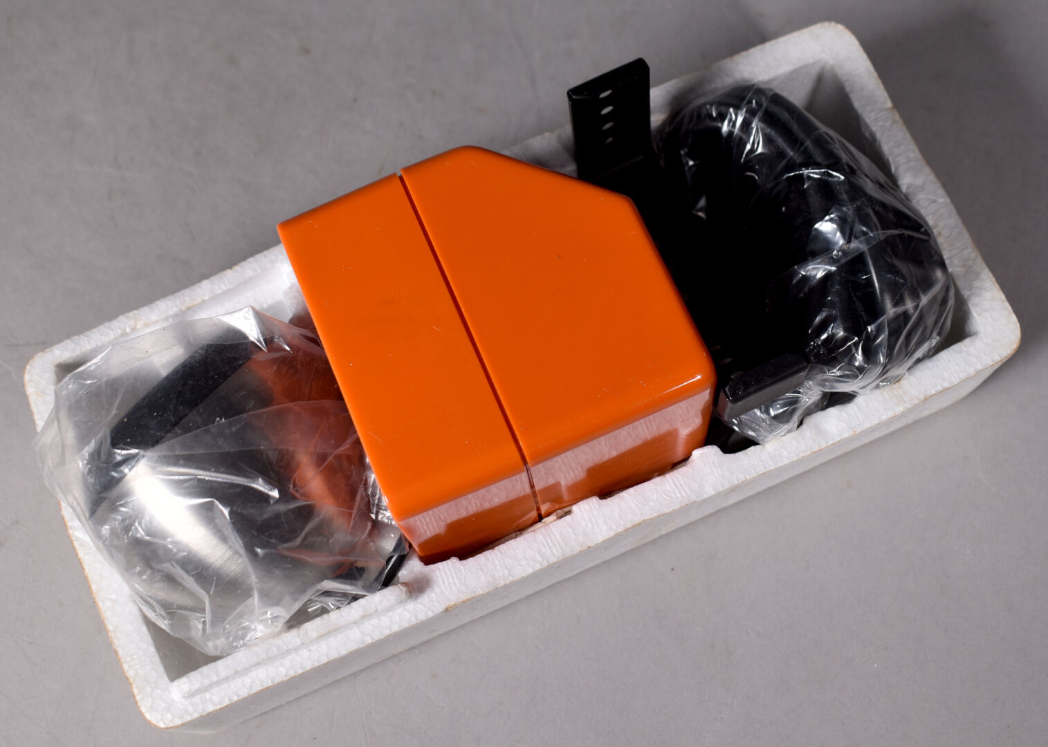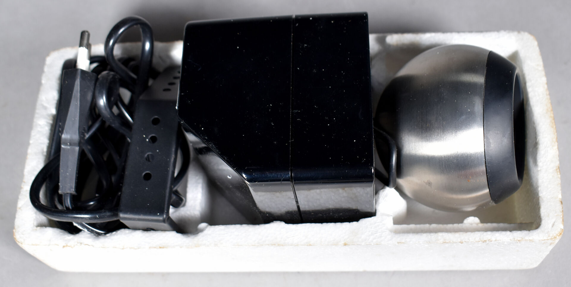OSRAM MINI-SPOT 1. Paire de mini-spot modèle 41601. 1 de couleur orange, l’autre de couleur noire. Globe en acier inoxydable aimanté permettant d’être orienté, boitier plastique. État neuf, boîte d’origine. Support de montage. Vers 1970. Haut. : 14 cm.