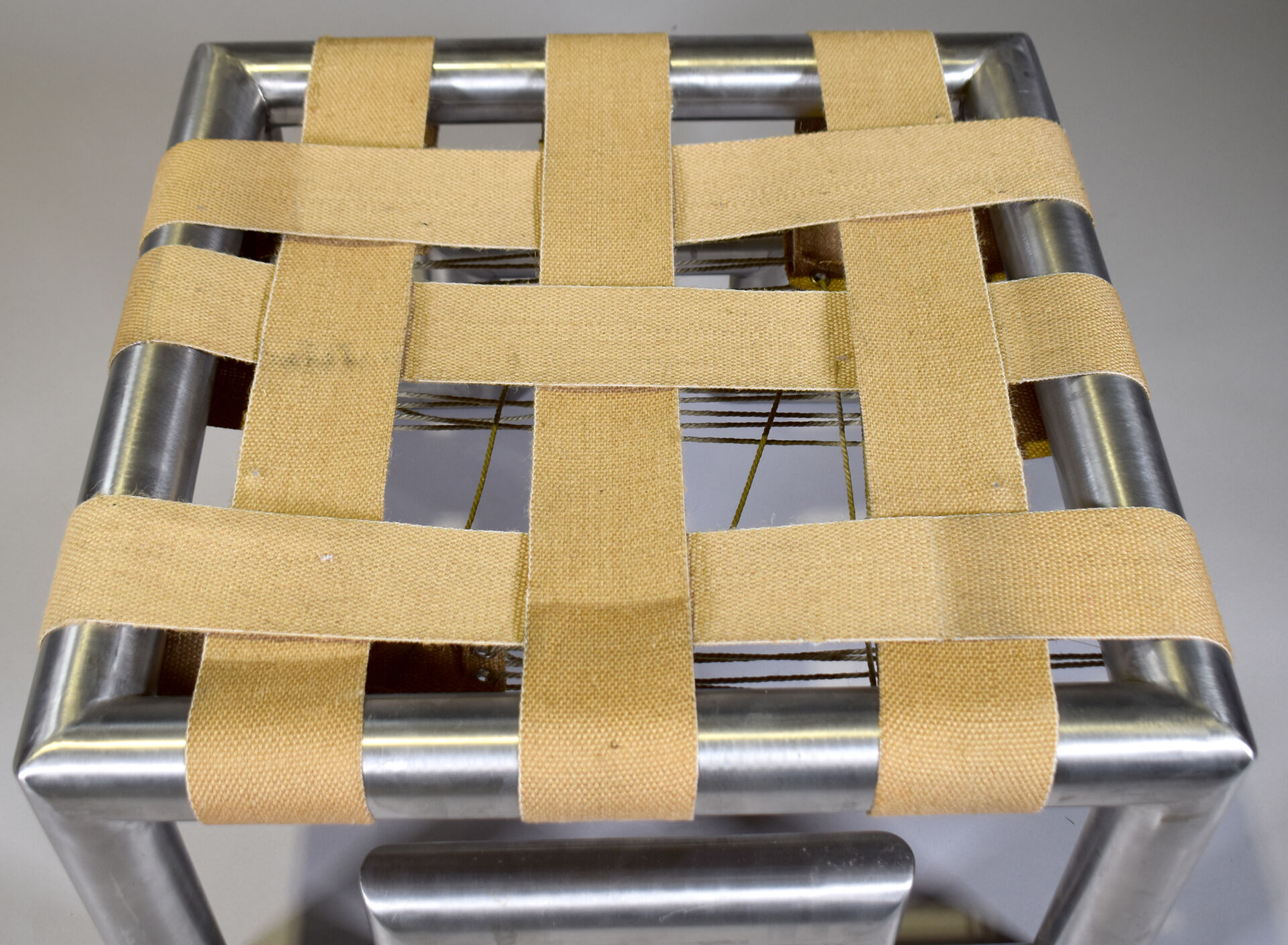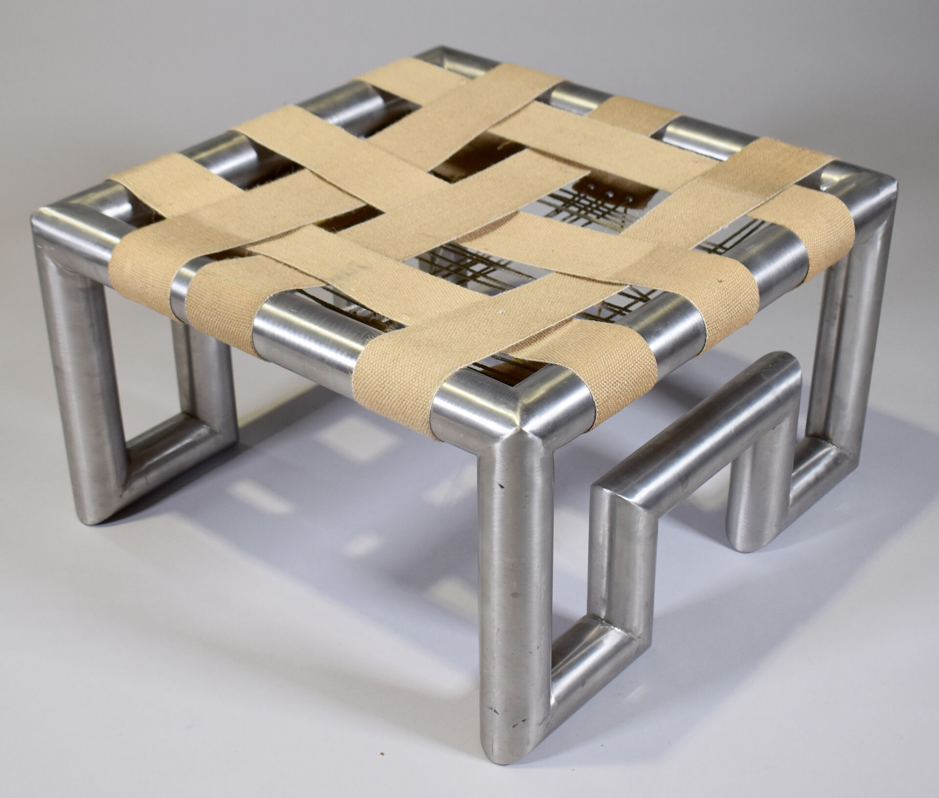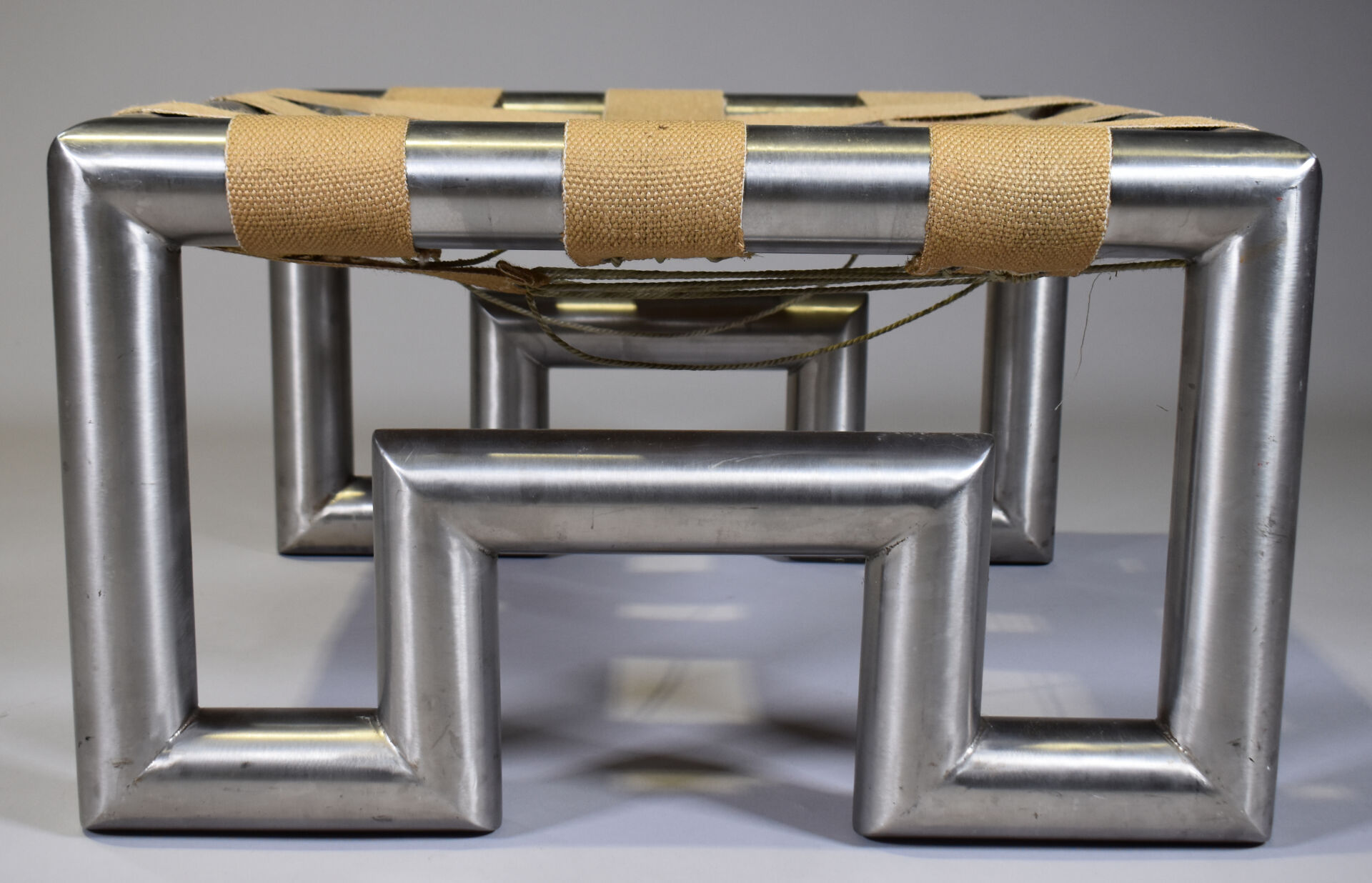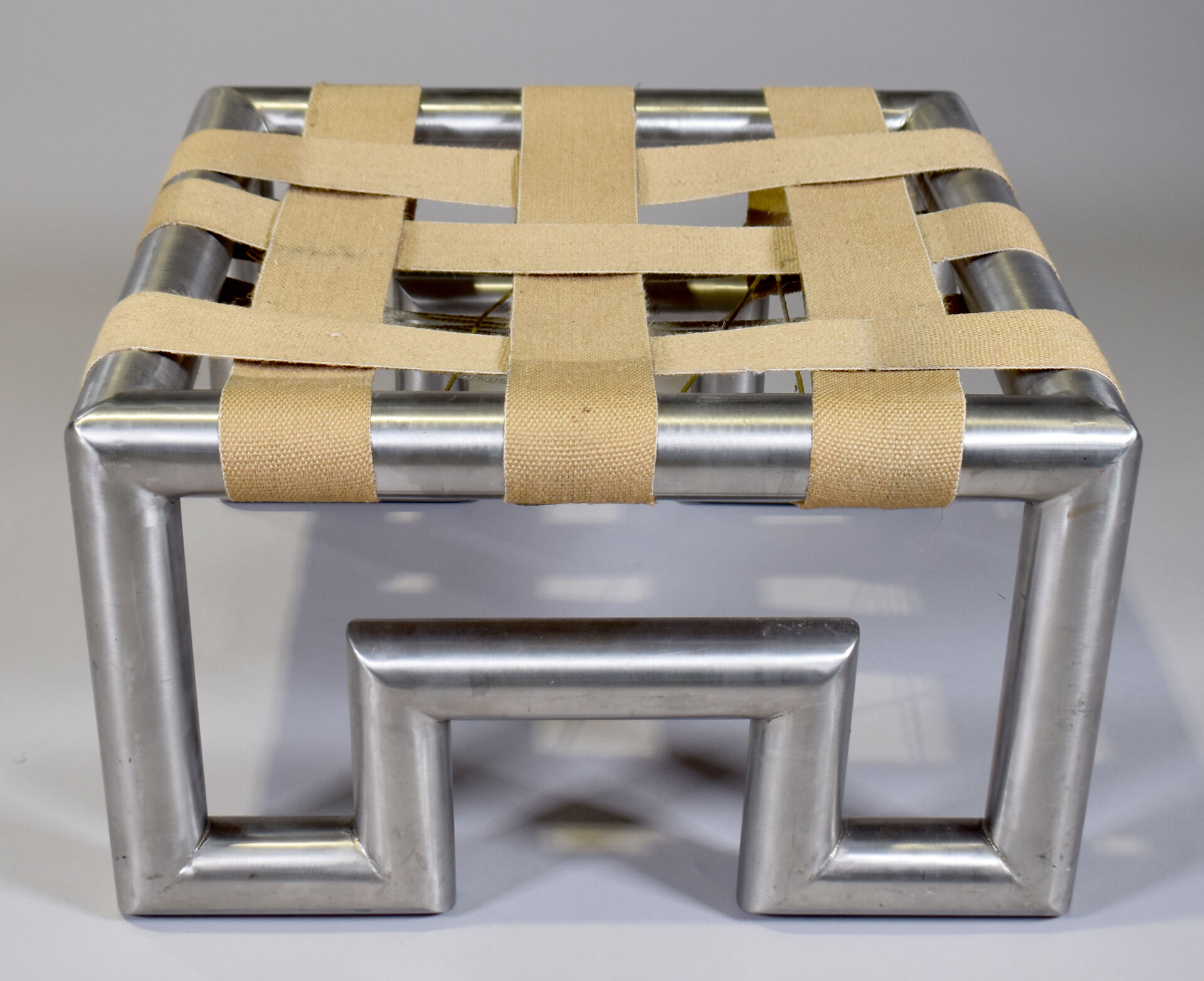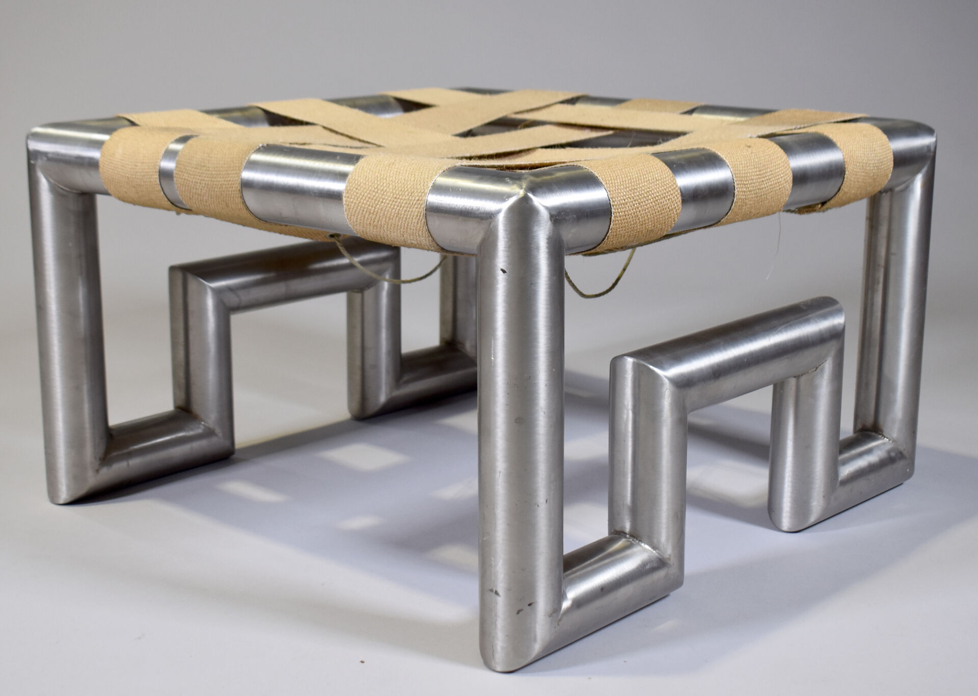 Ottoman en métal tubulaire brossé, de forme carré. Travail des années 1970. Haut. : 34,5 cm – Larg. : 59 cm – Prfo. : 59 cm.