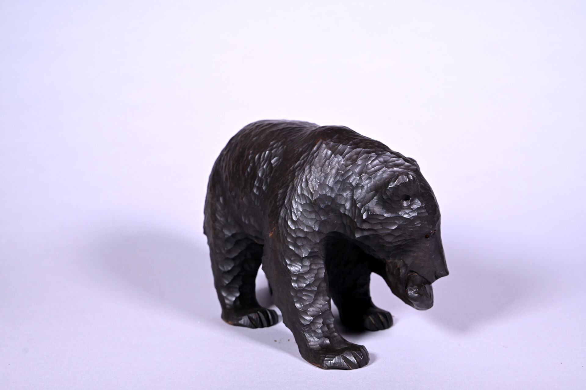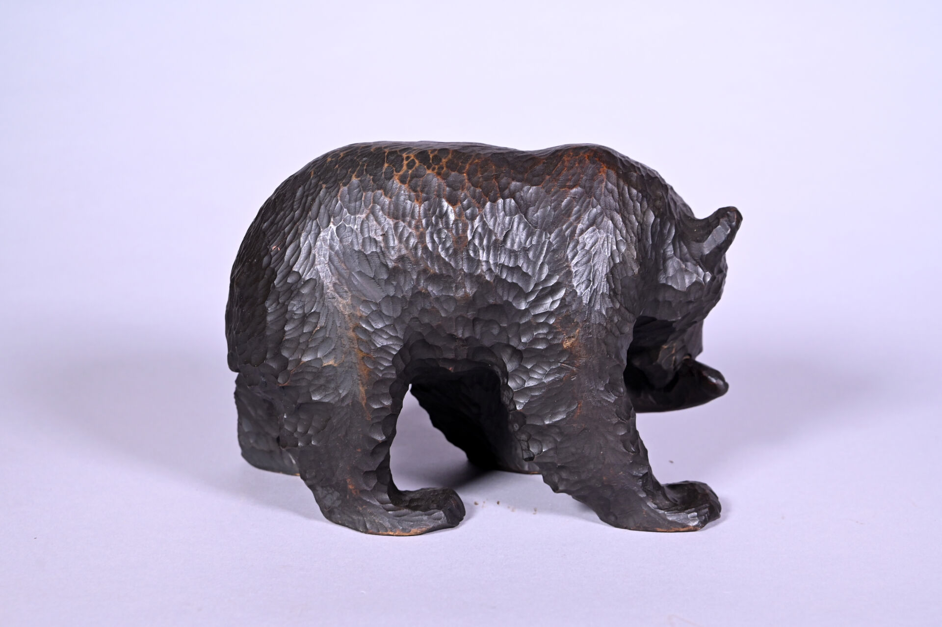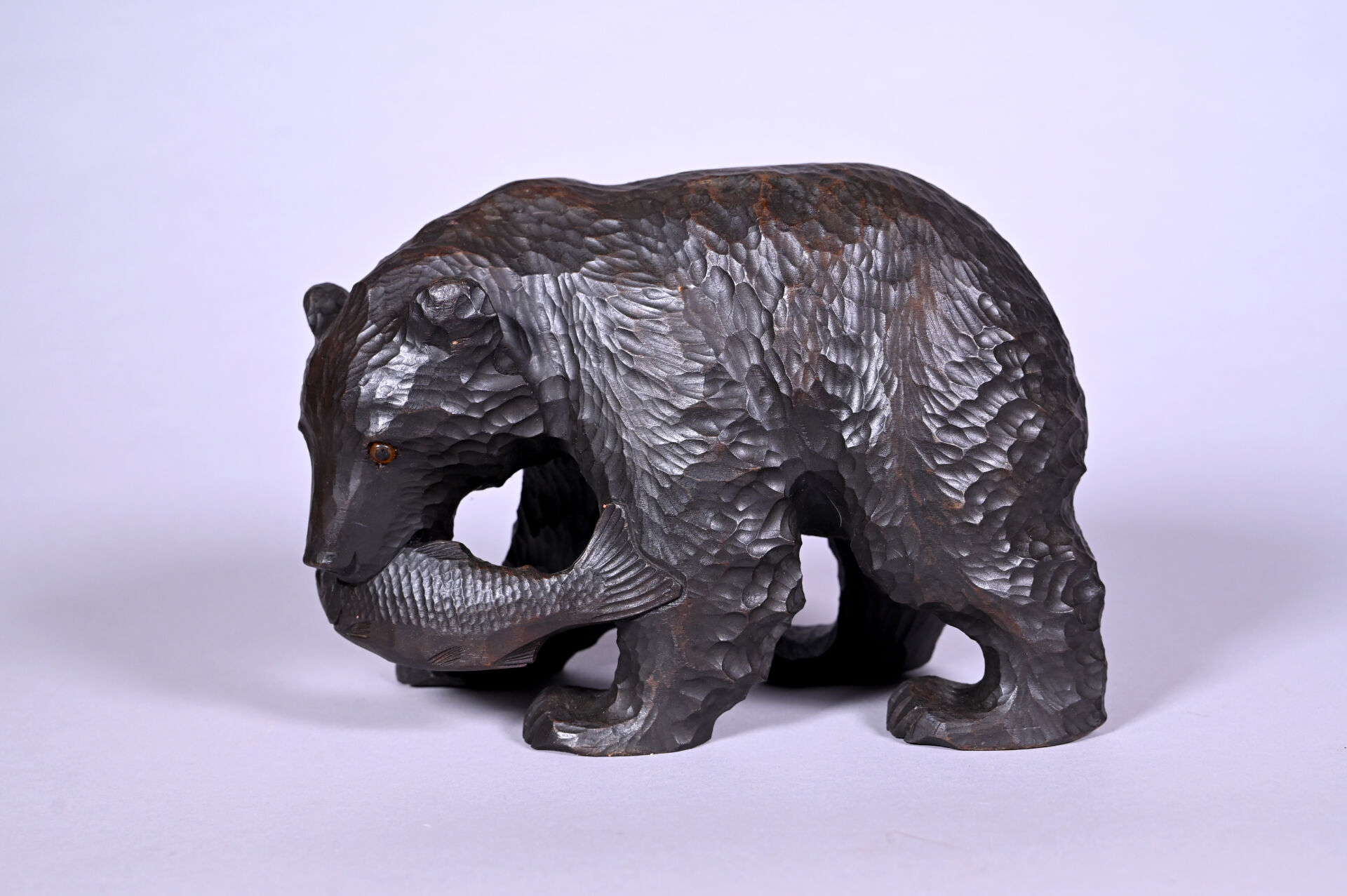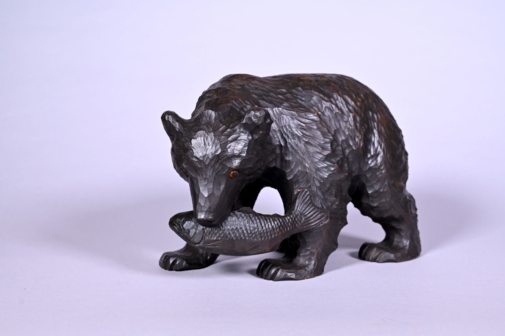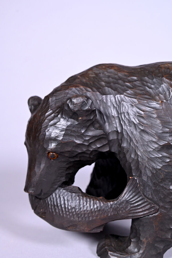 Ours pêcheur en bois sculpté, les yeux en sulfure. Travail de la forêt noire, première moitié du XXe siècle. Haut. : 27 cm – Long. : 27 cm – Prof. : 14 cm.