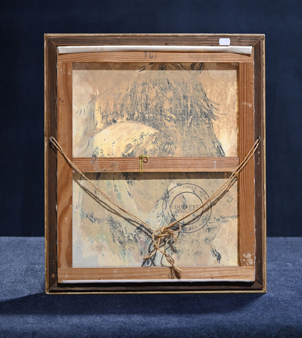 P DUTEURTRE (XXe siècle). Portrait de cavalière et son cheval. Sérigraphie sur toile signée en bas à droite, tampon au dos. 55,5 x 46 cm.