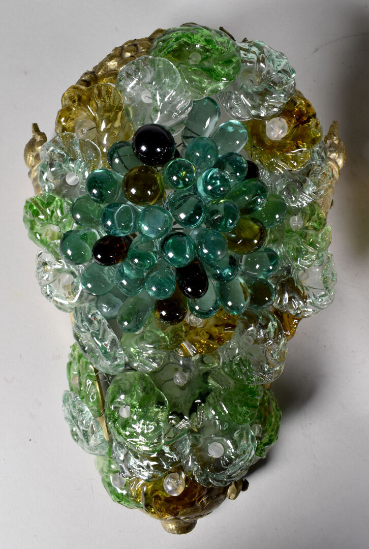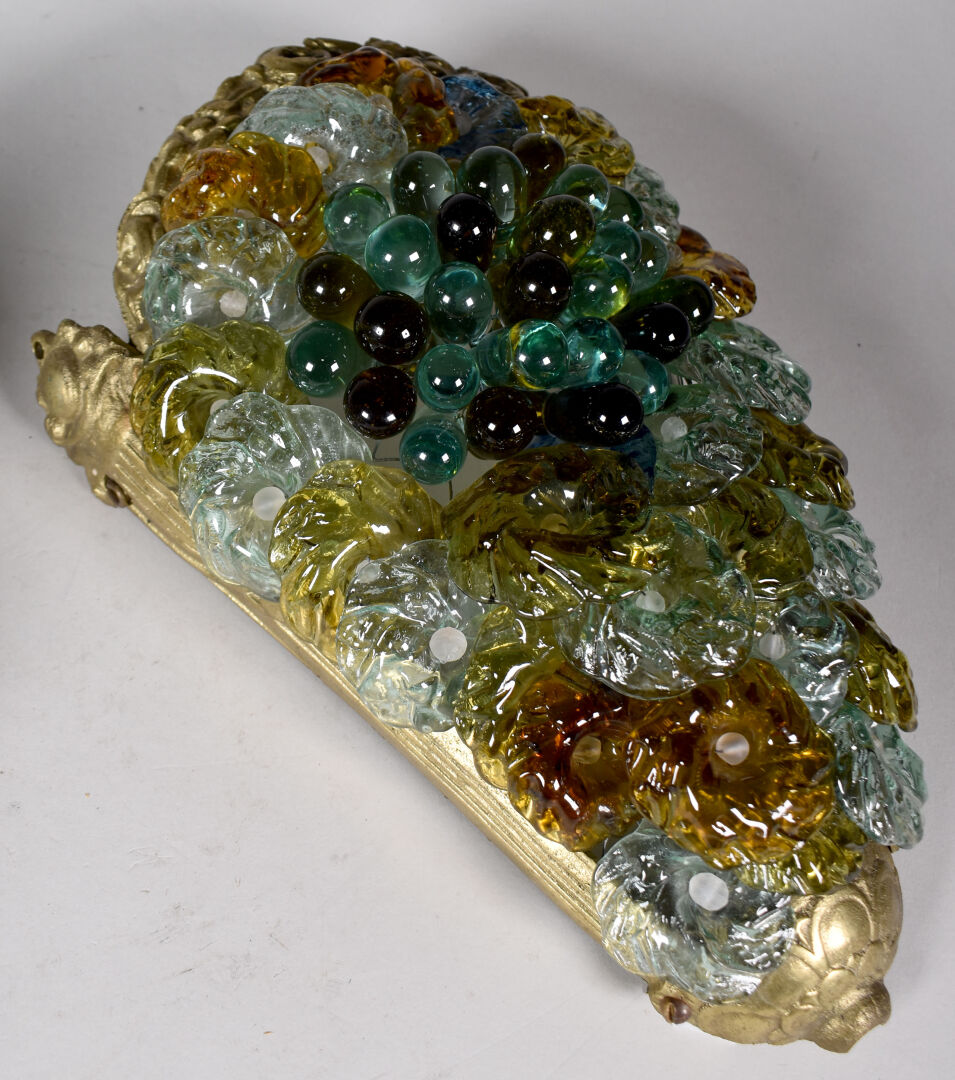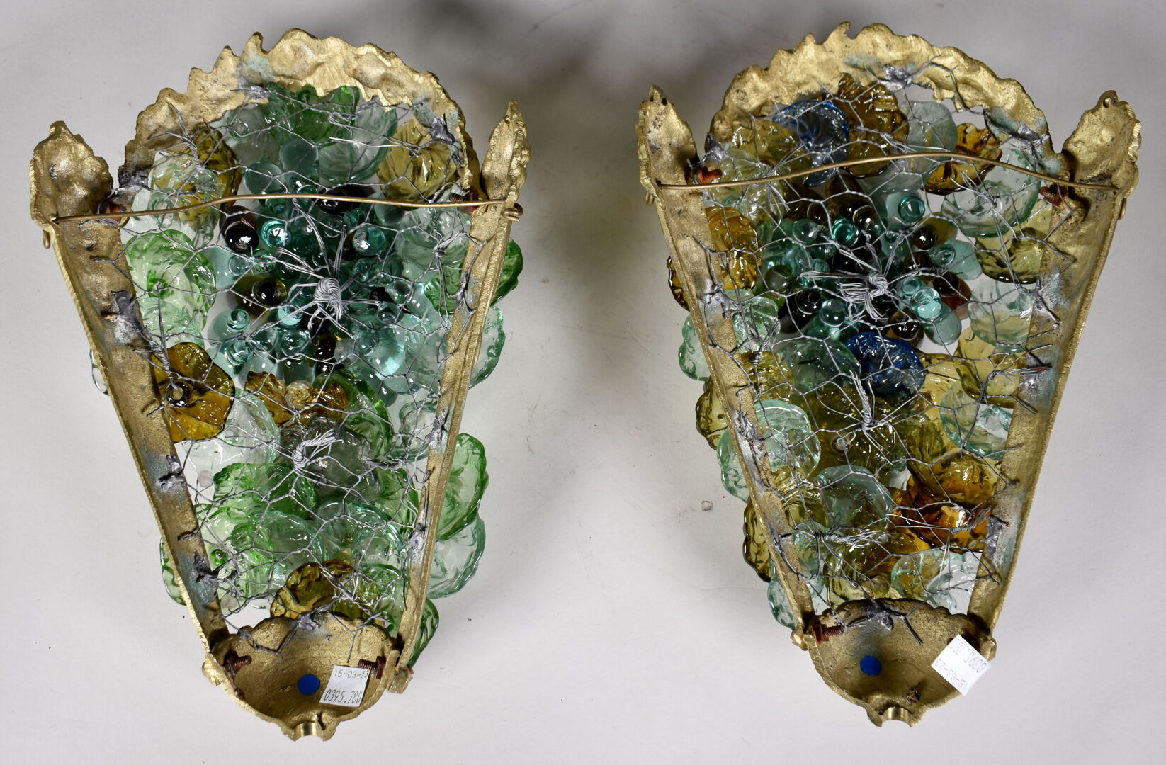 Paire d’appliques coniques à monture en bronze à décor en verre bleu, vert et ambré représentant des grappes de raisin et fleurs. Style Art Nouveau. Haut. : 30 cm.
