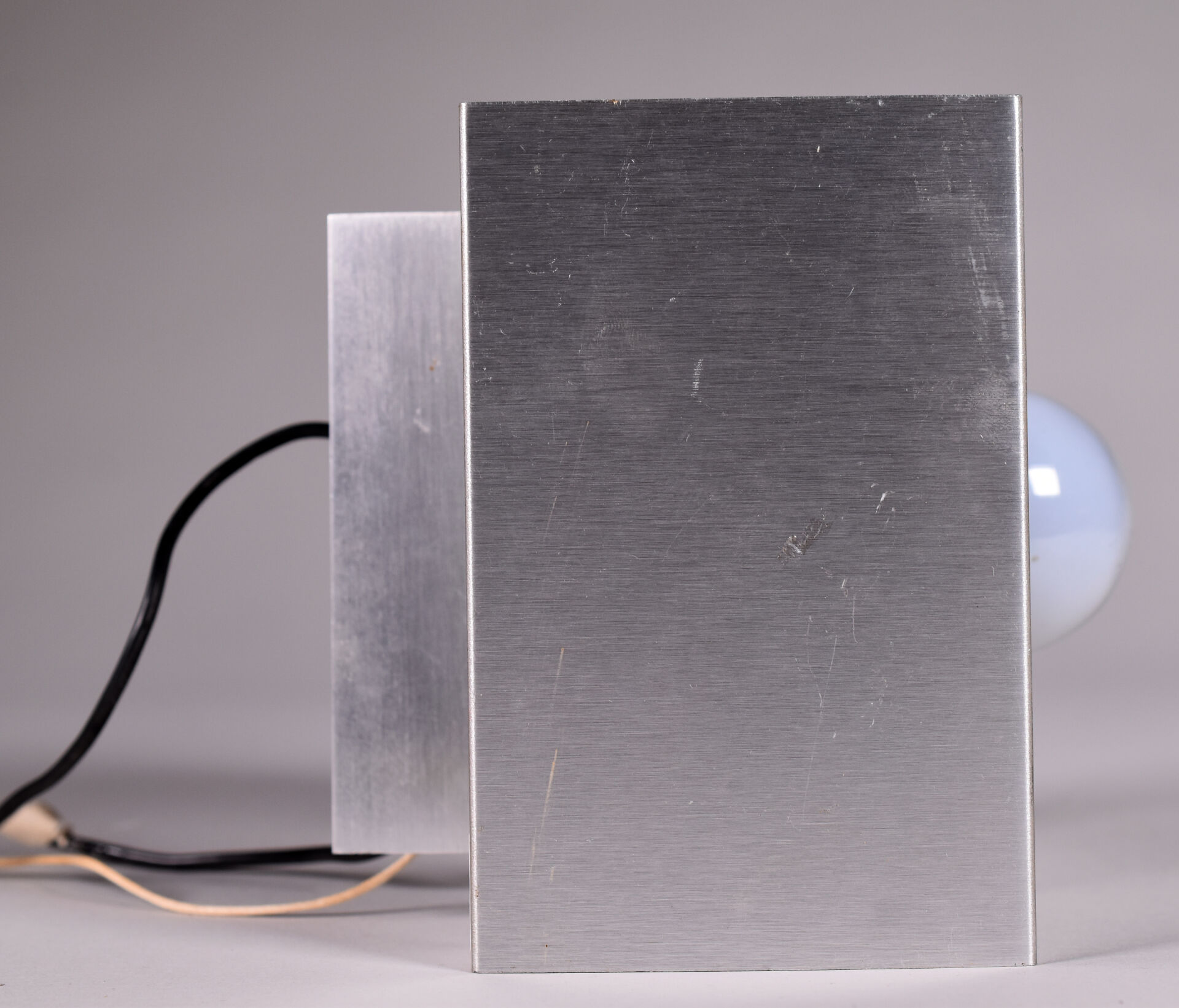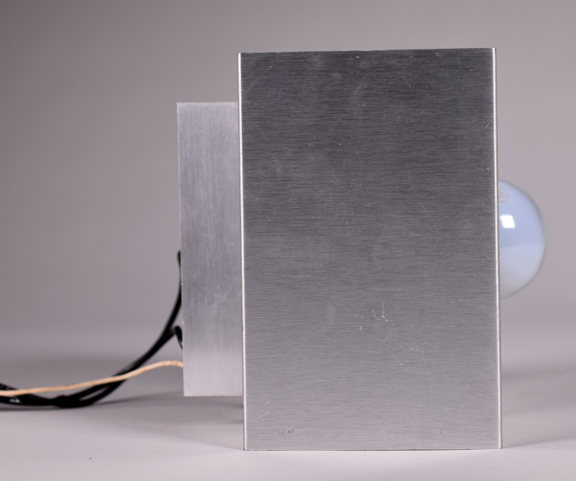 Paire d’appliques cubiques en métal brossé à une lumière. Vers 1970. Haut. : 18,8 cm – Larg. : 18,8 cm – Prof. : 18,8 cm.