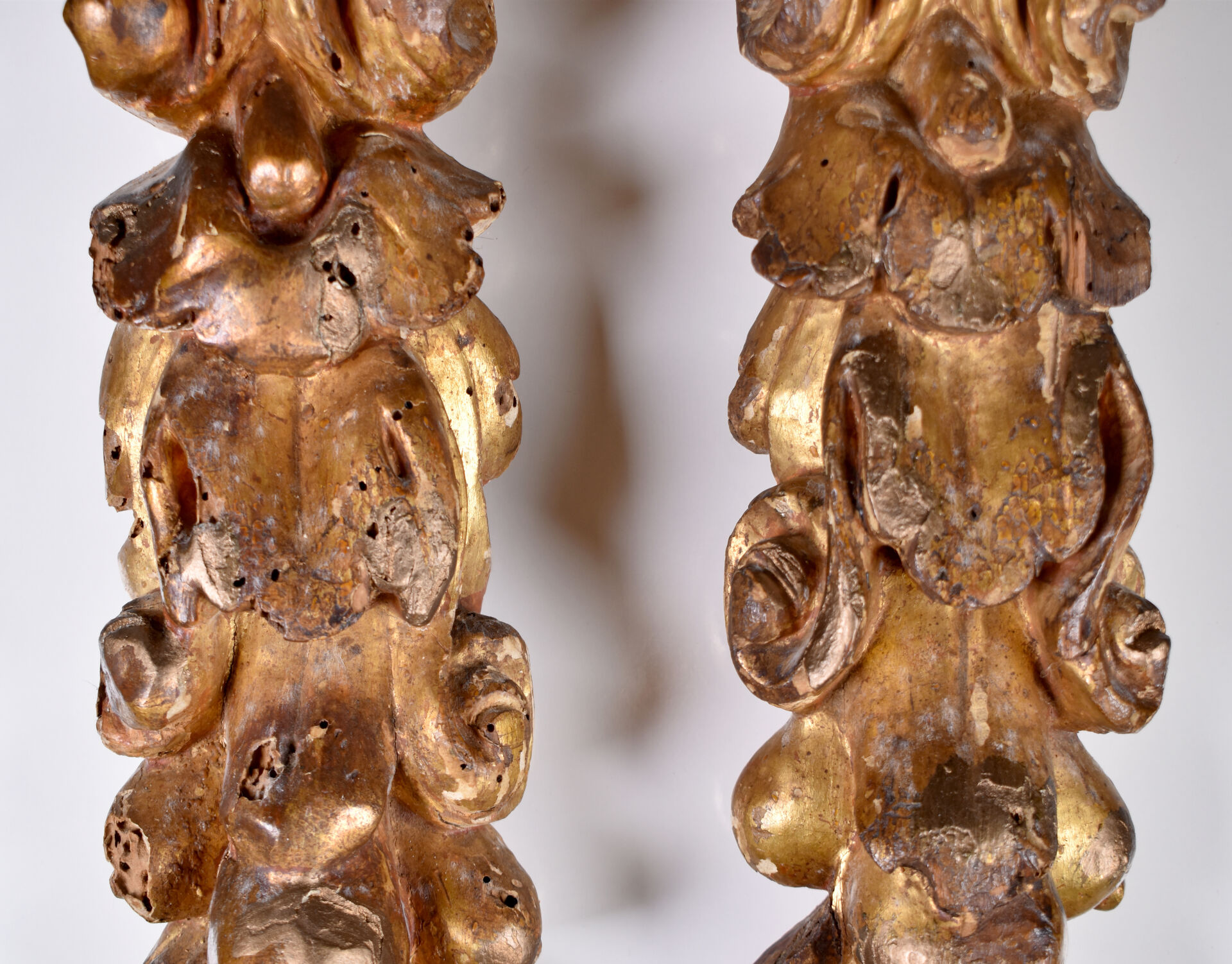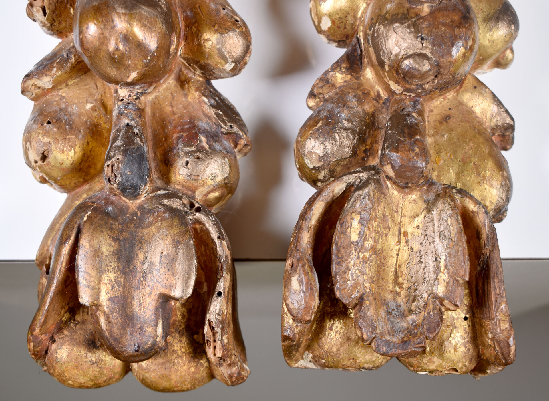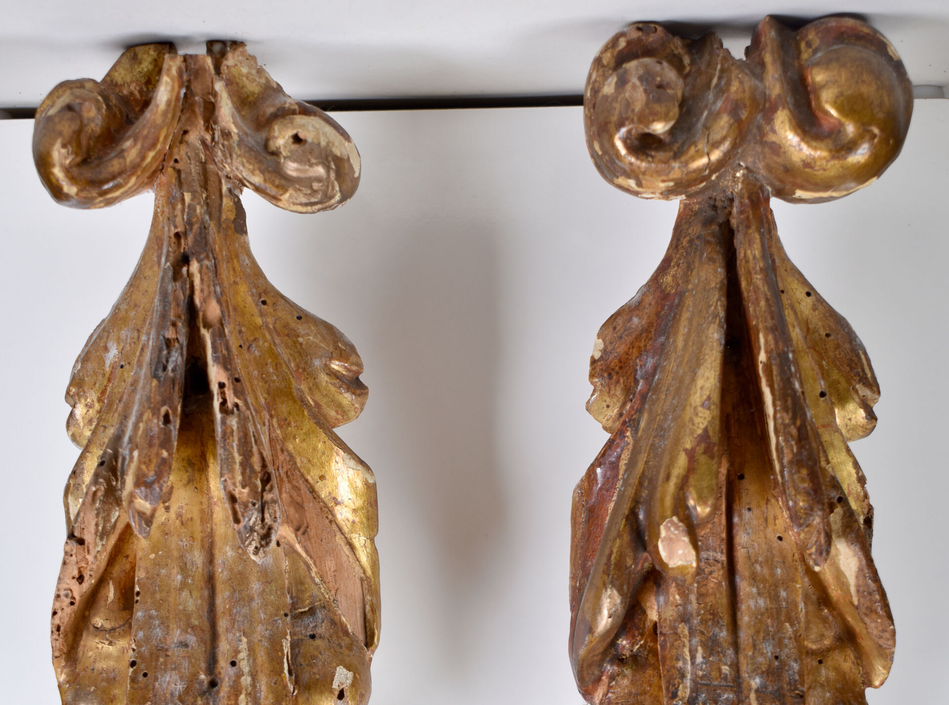 Paire d’appliques en bois (usures et traces d’insectes xylophages) mouluré, sculpté et doré, à décor de drapé, chutes de fruits, feuillages et enroulements.