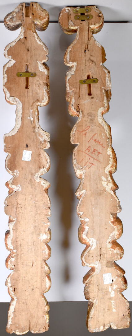 Paire d’appliques en bois (usures et traces d’insectes xylophages) mouluré, sculpté et doré, à décor de drapé, chutes de fruits, feuillages et enroulements. Travail dans le style italien du XVIIe siècle. Haut. : 65 cm