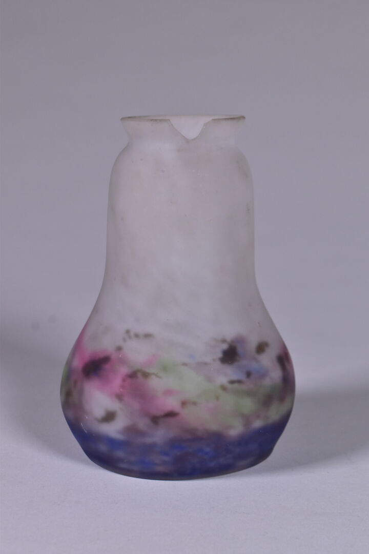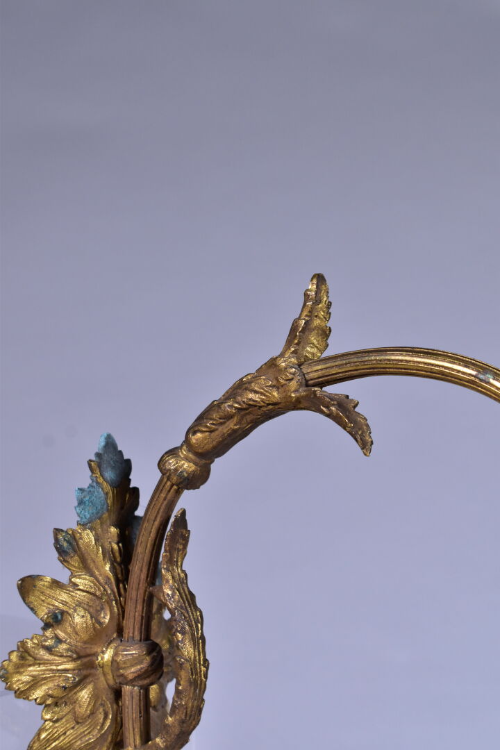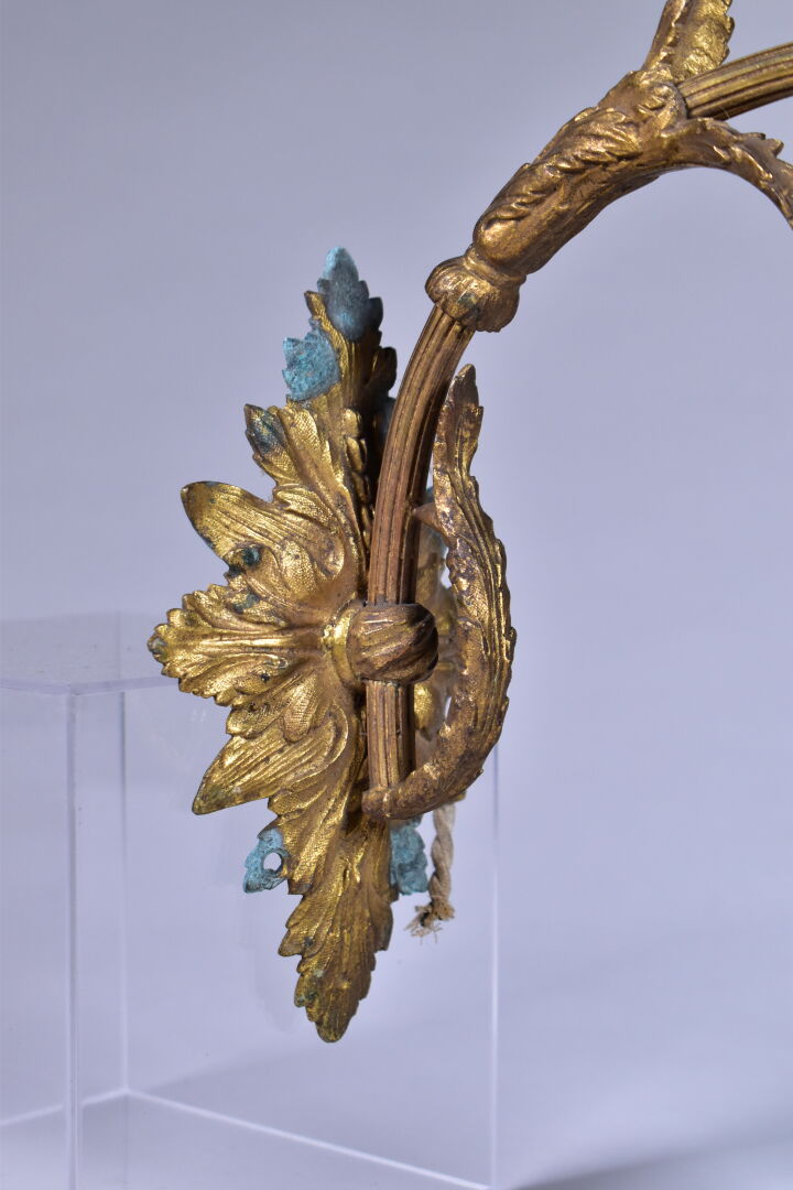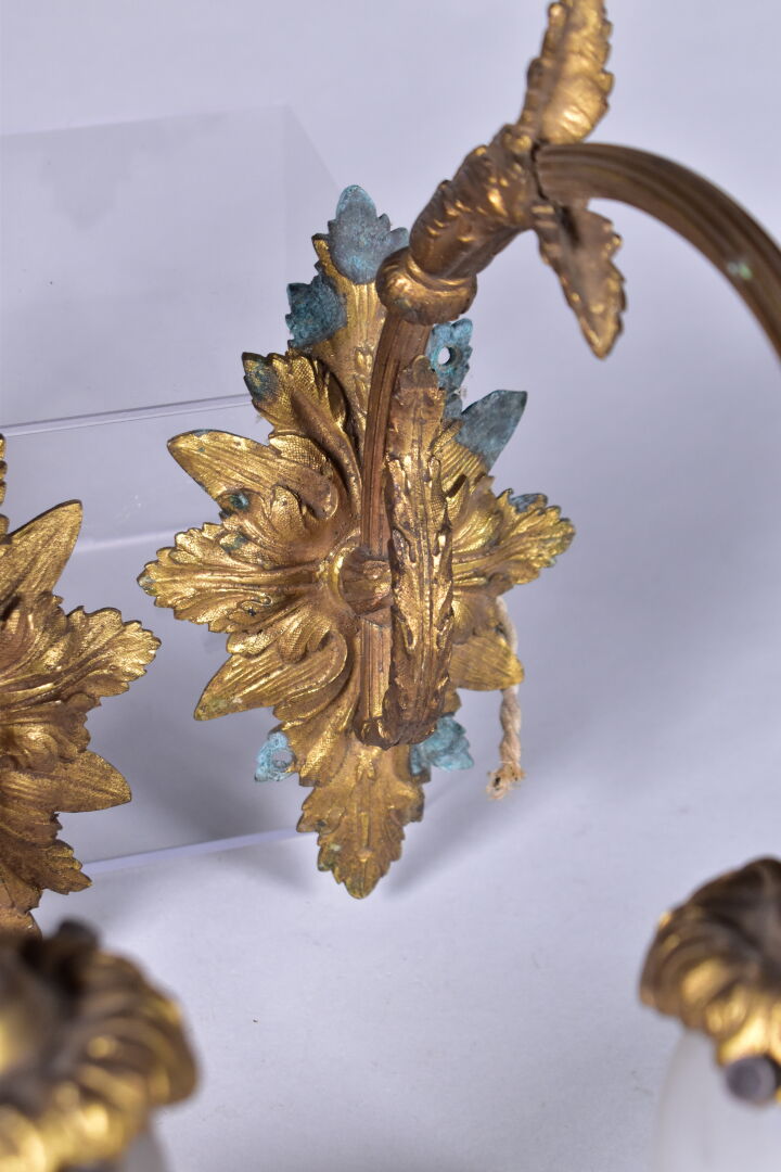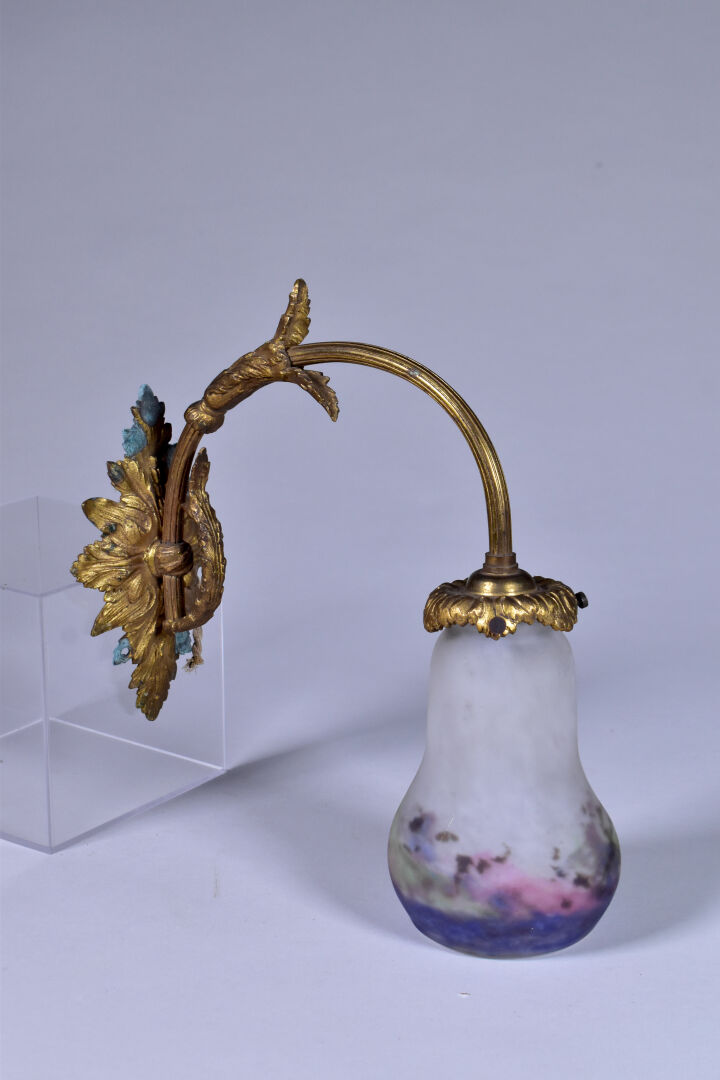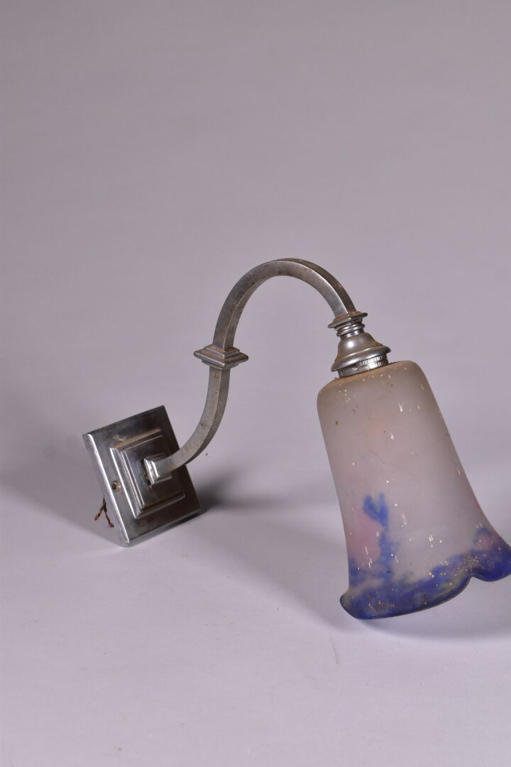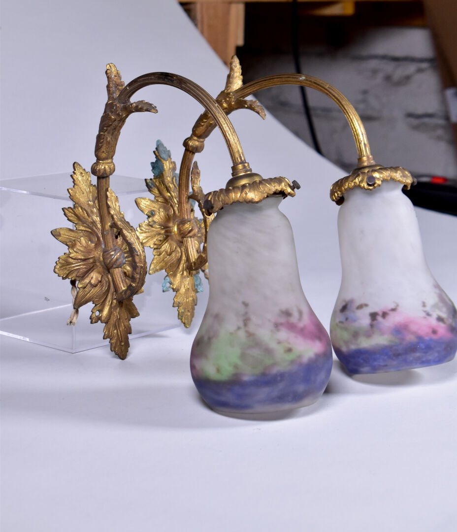 Paire d’appliques en bronze à un bras en console, les tulipes en verre marmoréen rose et mauve, signées MULLER FRERES LUNEVILLE (éclats et manques, vert de gris). Haut. : 29,5 cm – Prof. : 24 cm. On joint une troisième applique à tulipe en verre marmoréen et métal gris dans le goût de MULLER FRERES. L’ensemble vers 1900/1920.