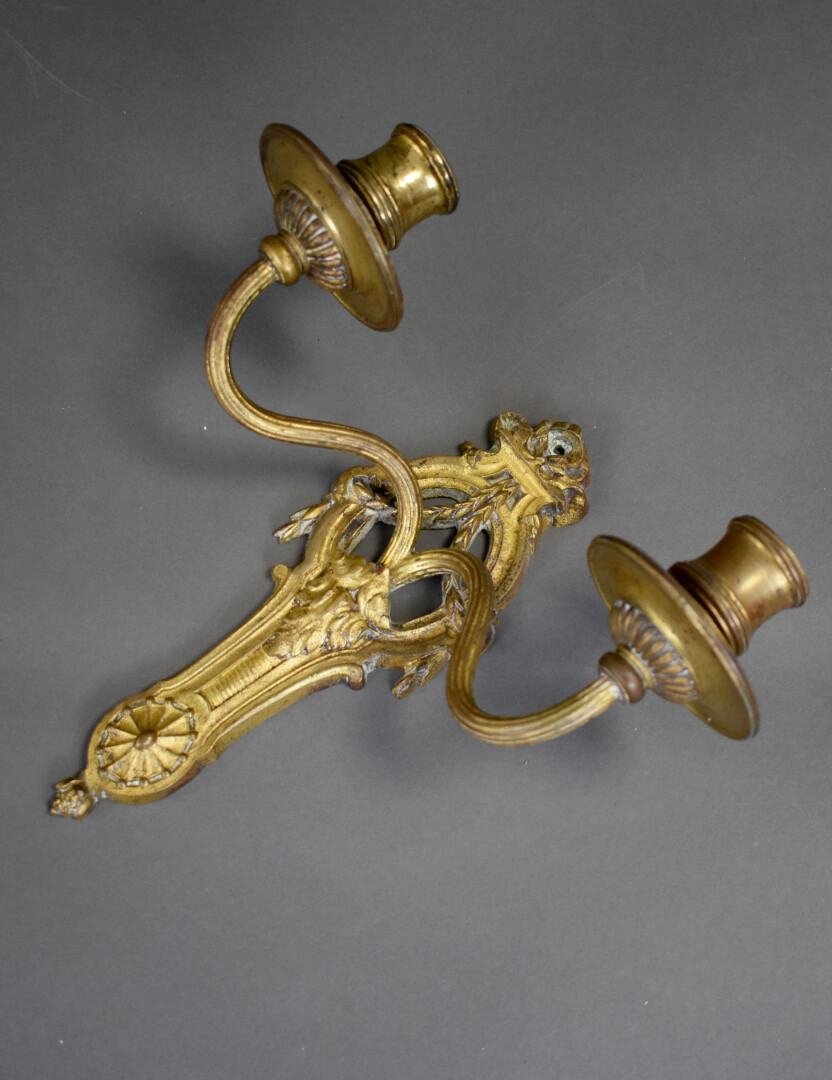 Paire d’appliques en bronze ciselé doré à deux bras de lumière (usures). Style Louis XVI. Haut. : 20,5 cm. On joint une paire de bougeoirs en laiton, un petit bougeoir à main et deux bras de lumière.