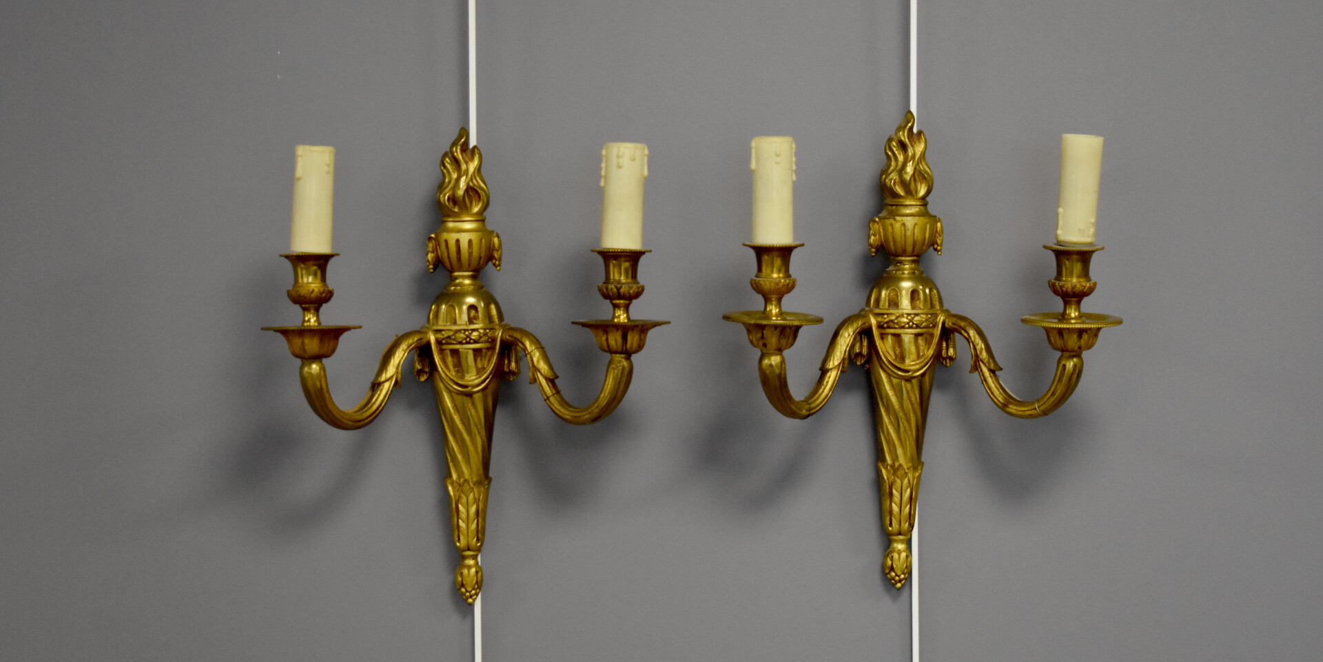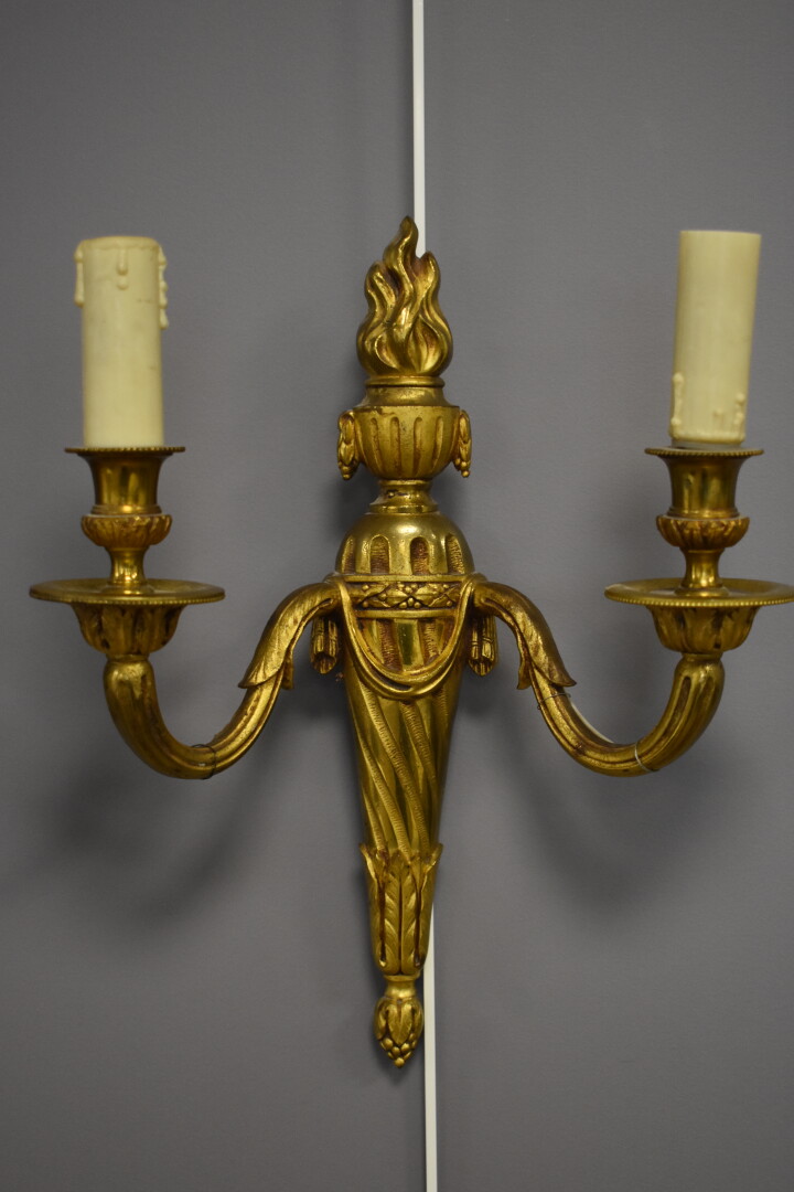 Paire d’appliques en bronze ciselé doré à deux bras de lumières, la base cannelée. Haut. : 32 cm.