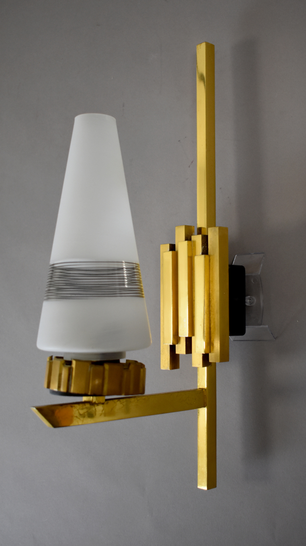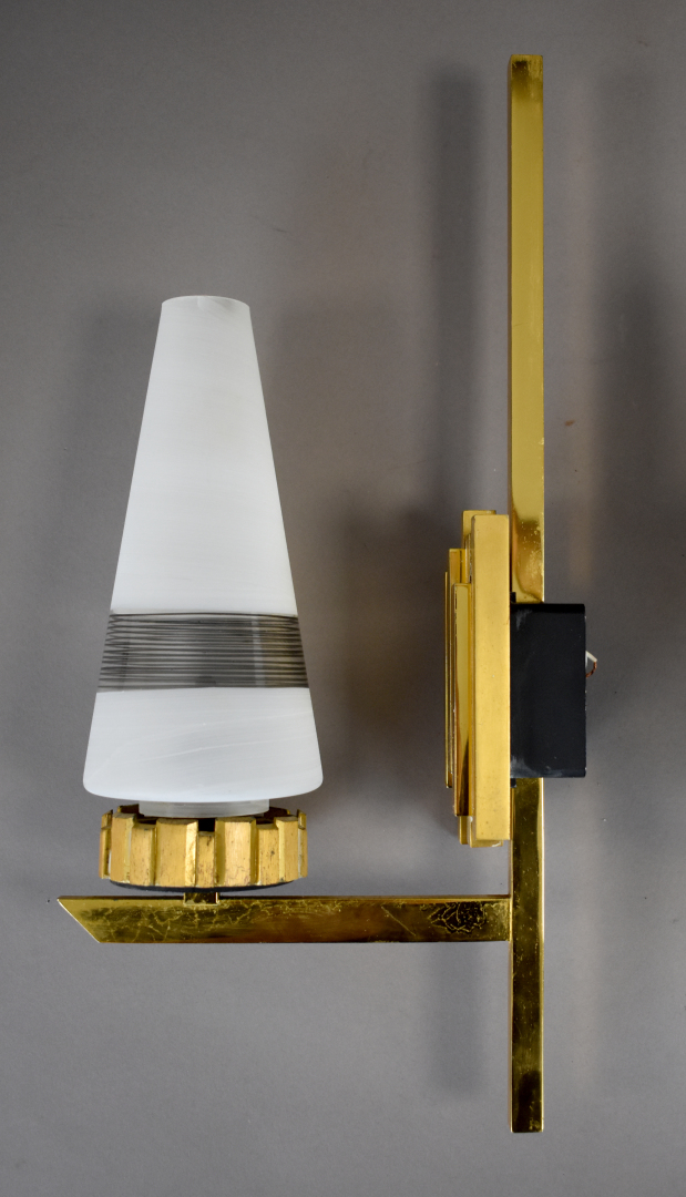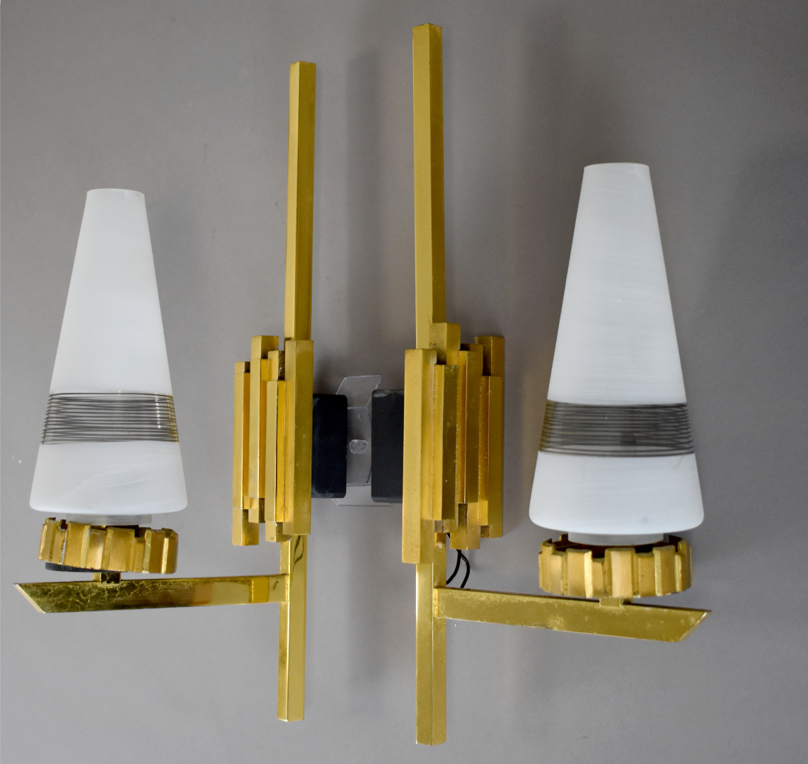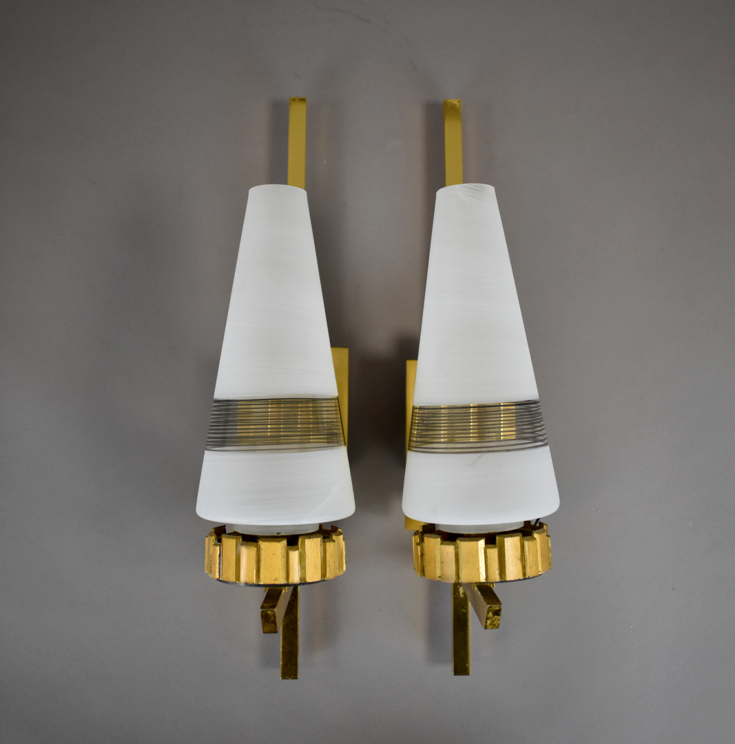 Paire d’appliques en bronze doré à une lumière. Tulipes coniques en verre blanc rayé noir. Vers 1930/1940. Haut. : 39 cm.