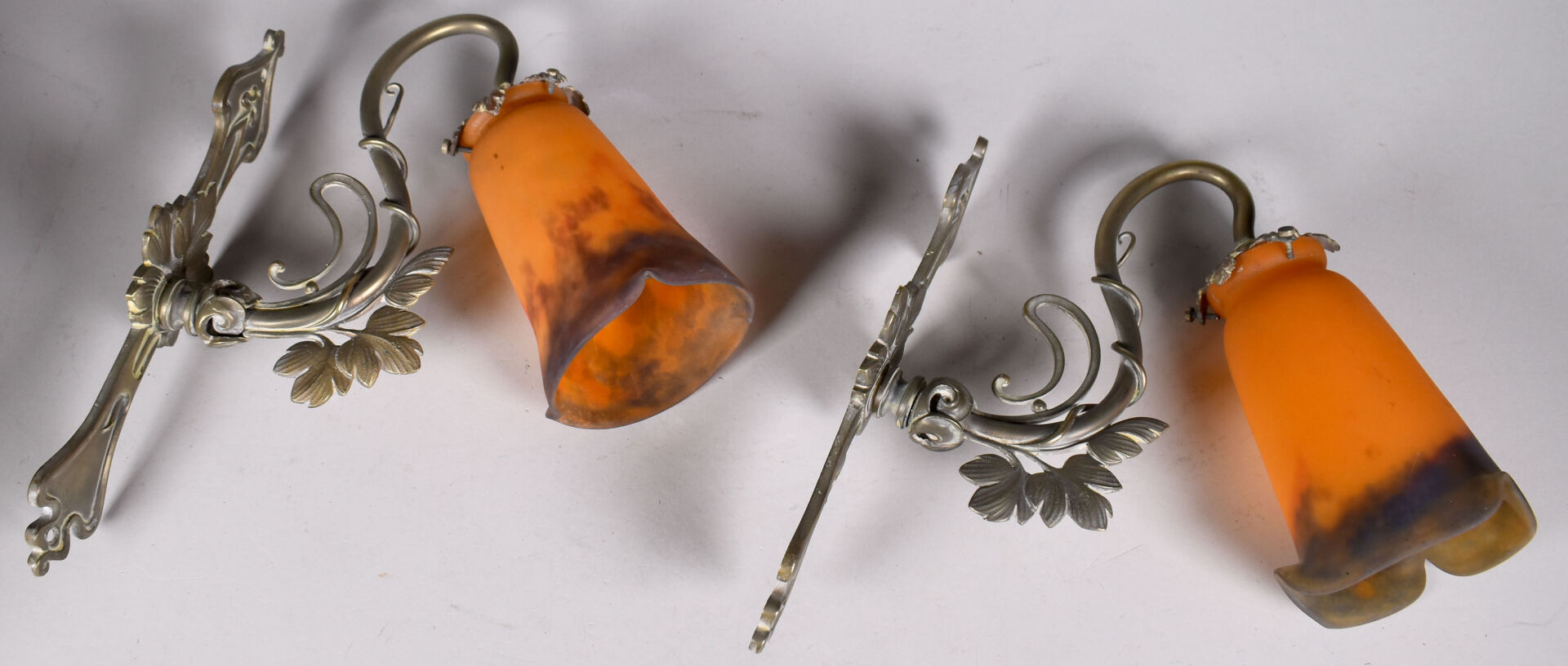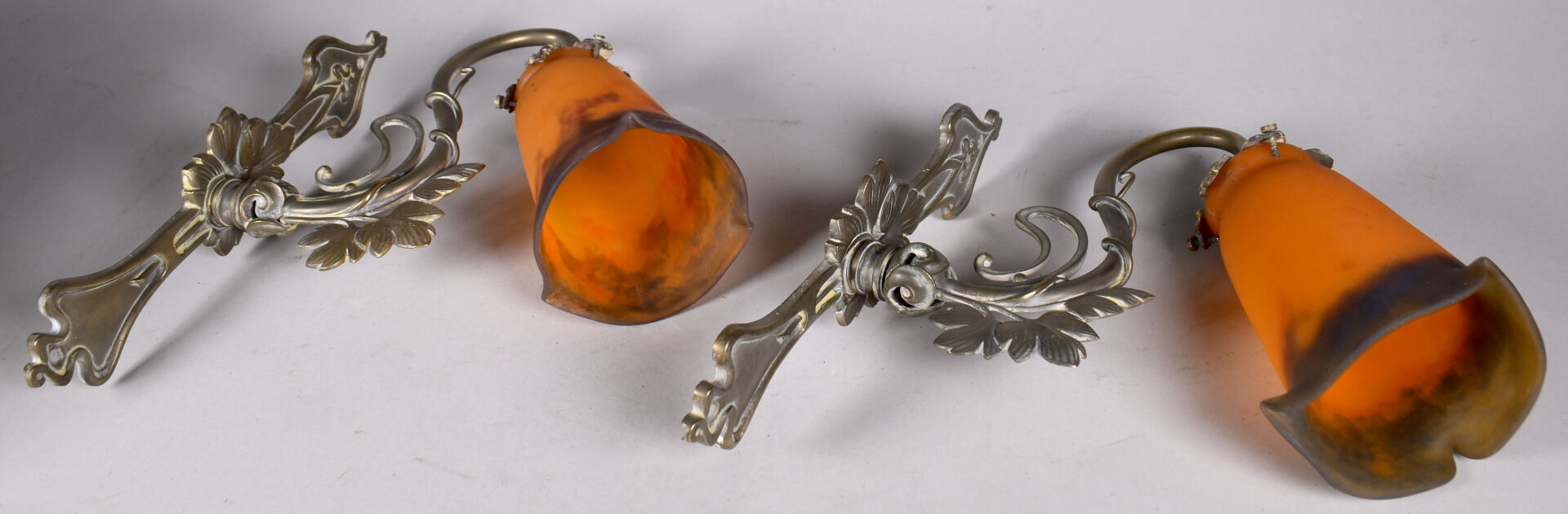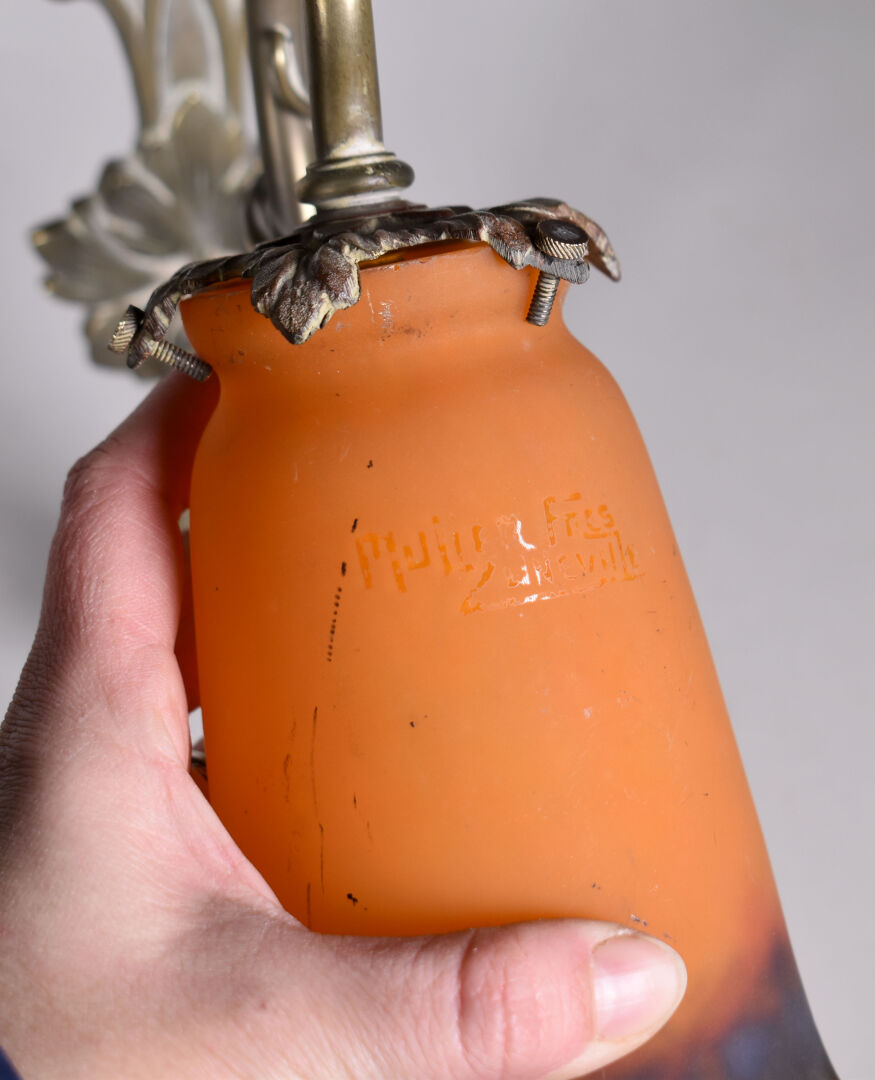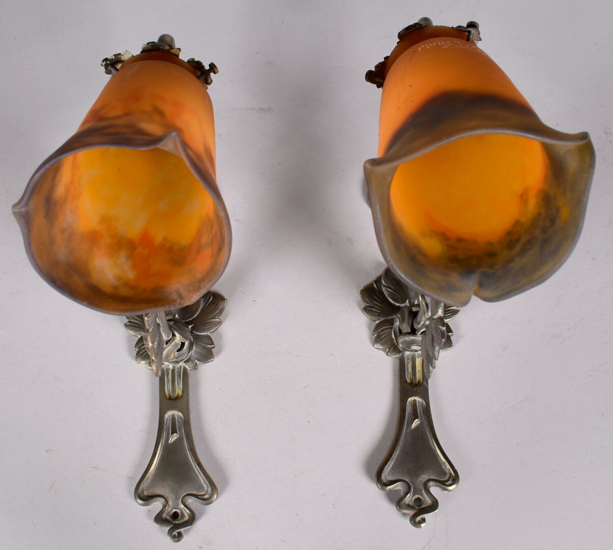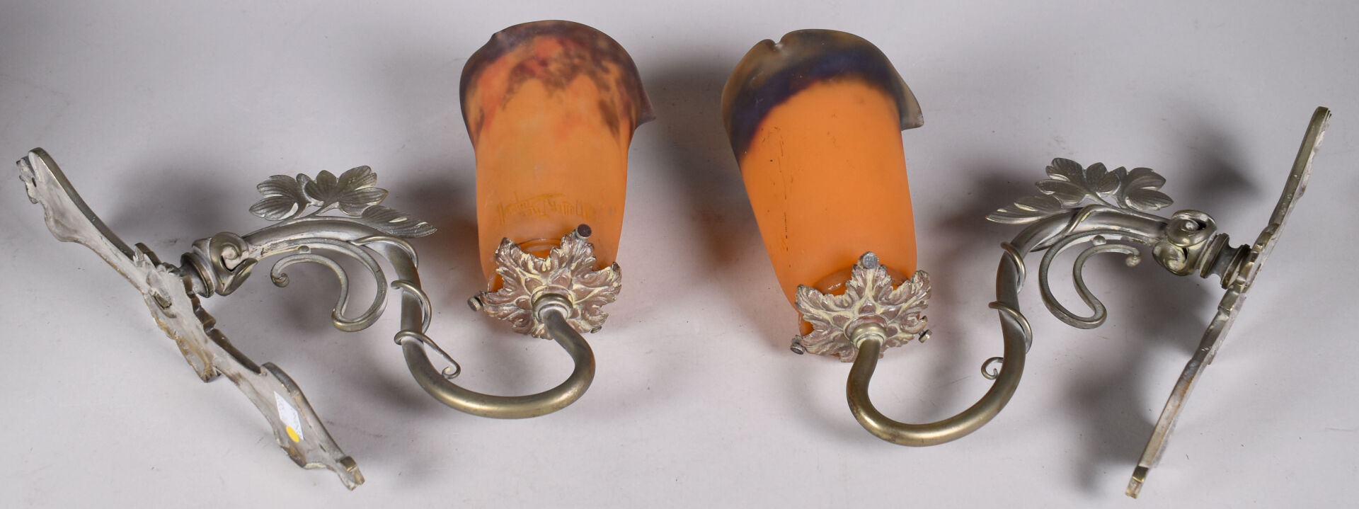Paire d’appliques en bronze légèrement patiné argent à un bras feuillagé soutenant des tulipes de verre marmoréen orange et bleues portant une signature MULLER FRERES LUNEVILLE. Haut. : 32 cm.