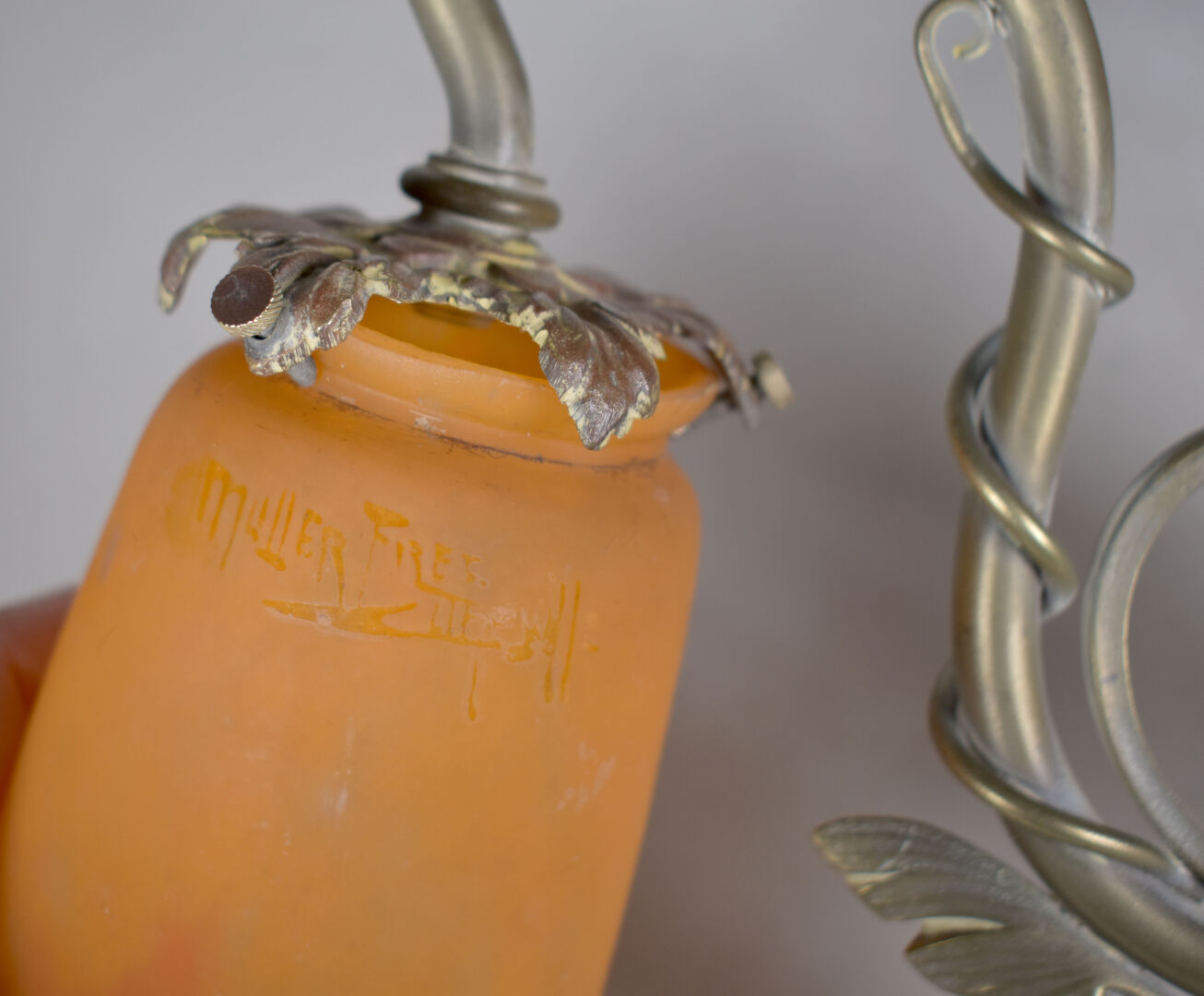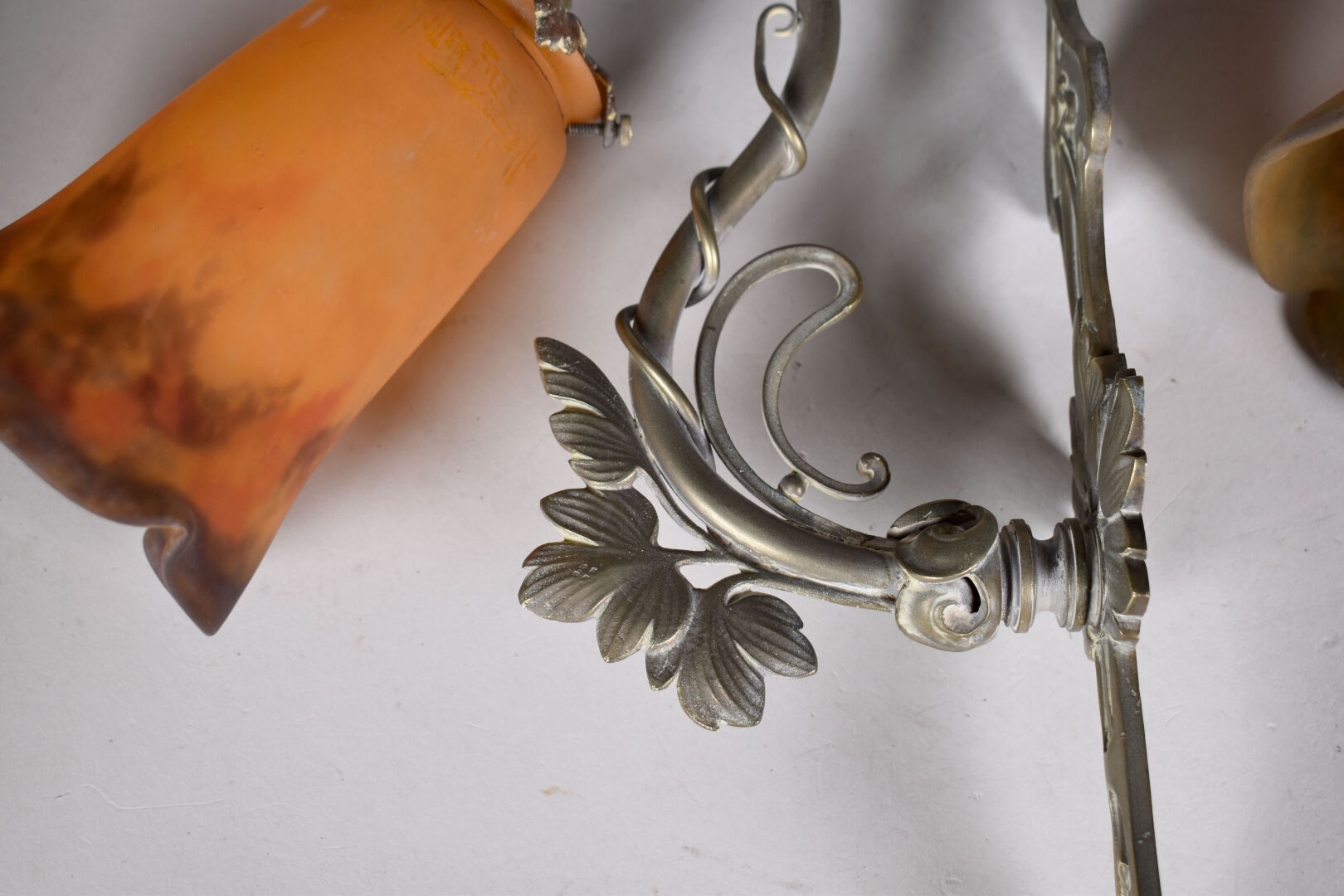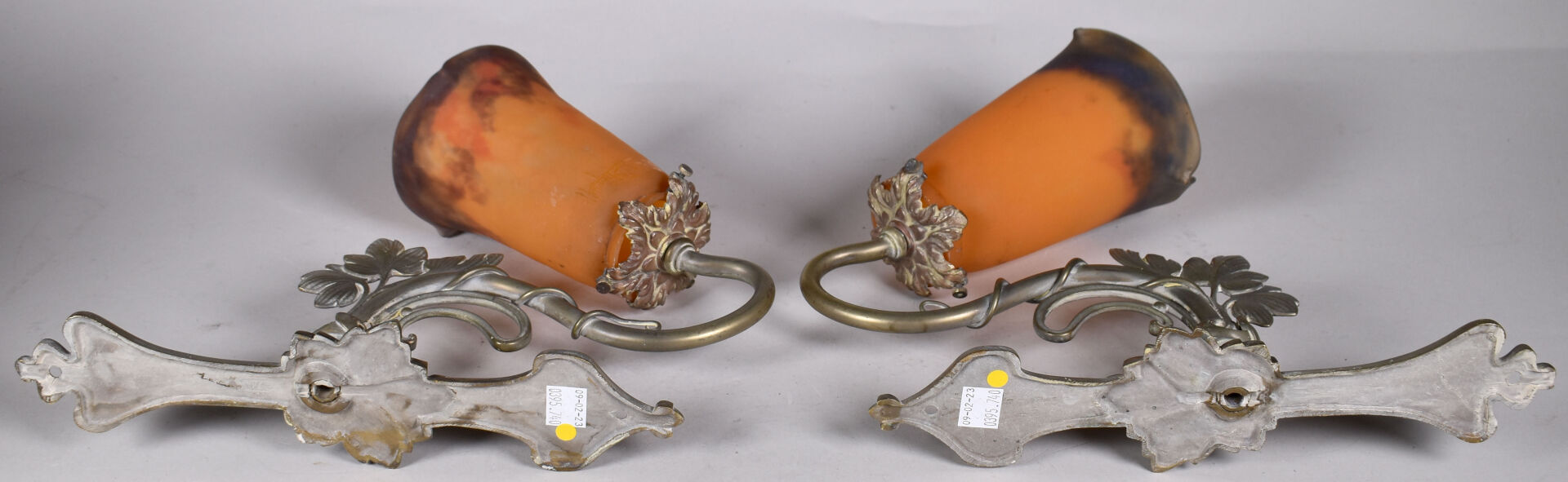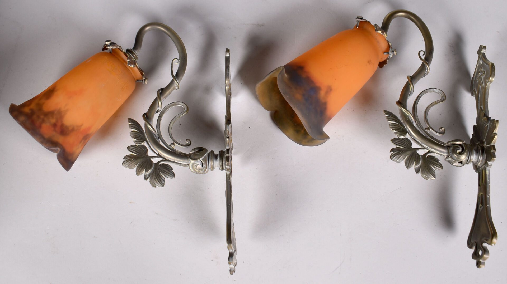 Paire d’appliques en bronze légèrement patiné argent à un bras feuillagé soutenant des tulipes de verre marmoréen orange et bleues portant une signature MULLER FRERES LUNEVILLE. Haut. : 32 cm.