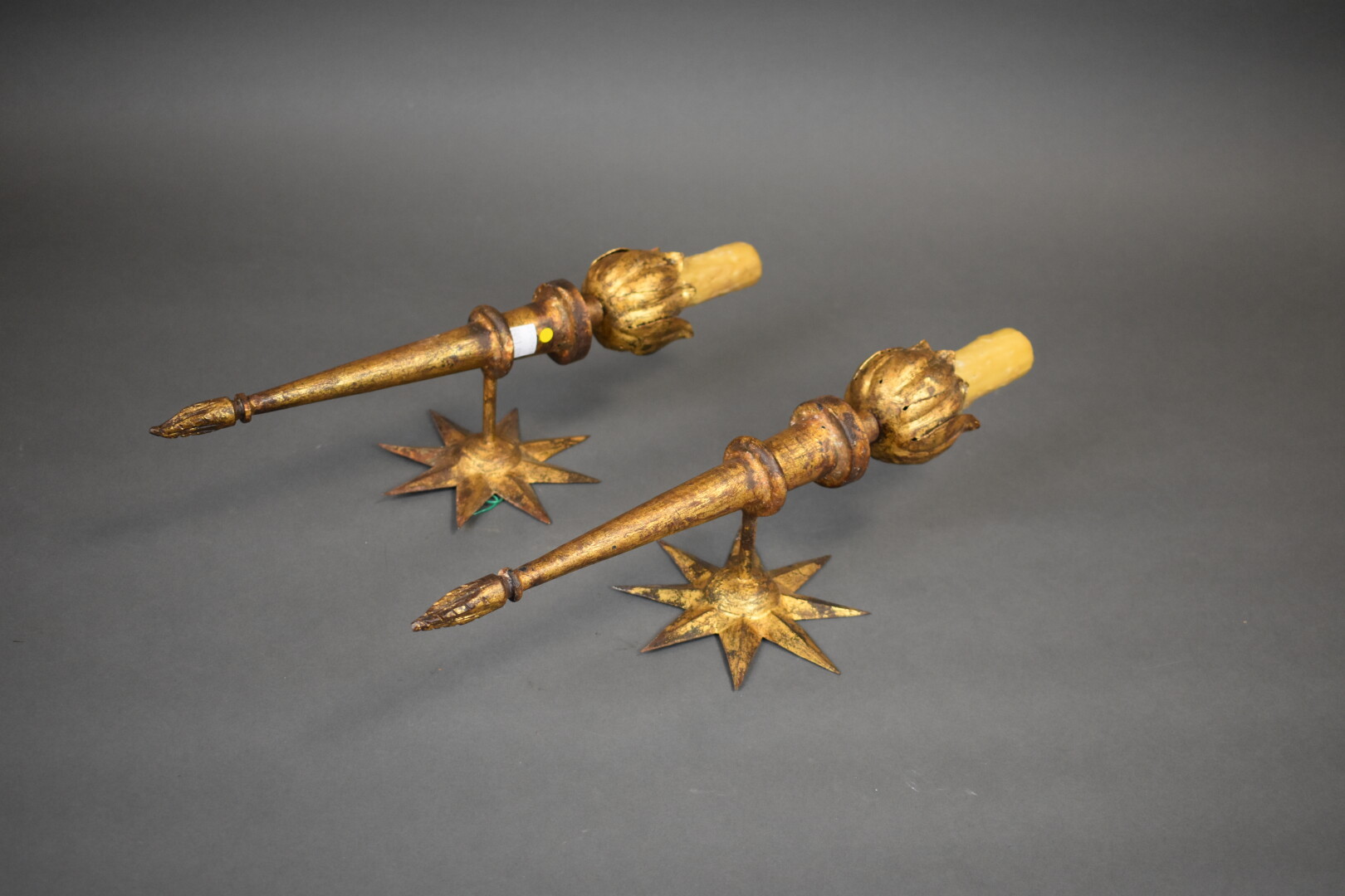 Paire d’appliques en métal doré représentant des torches. Dans le goût de Poillerat. Milieu du XXe siècle. Haut. : 40,5 cm.