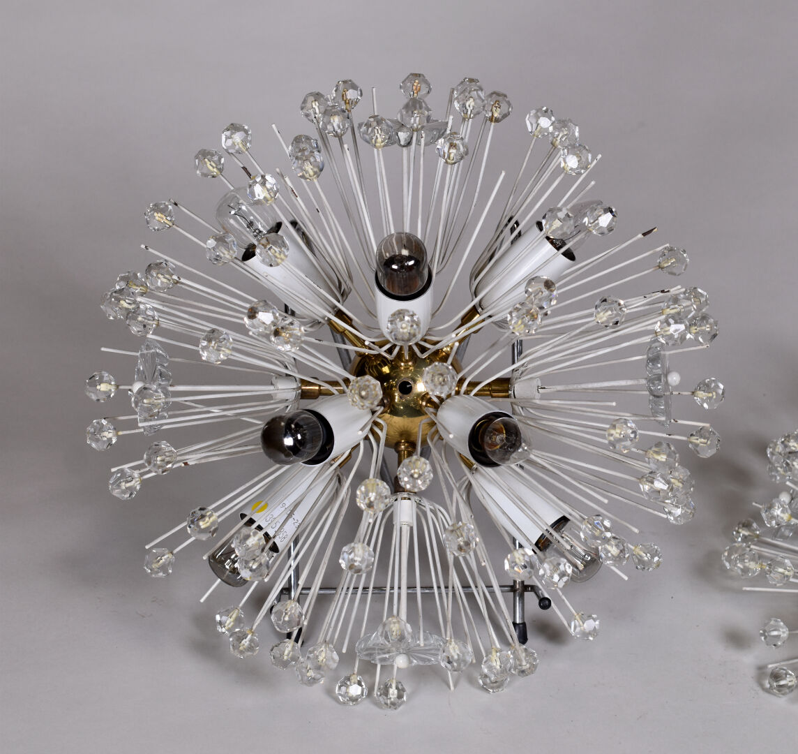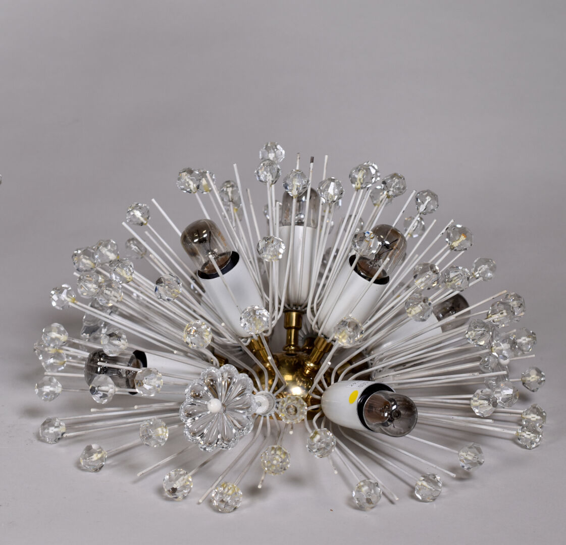 Paire d’appliques ou plafonniers rayonnants en métal laqué blanc à décor de fleurs et perles facettées (manques). Milieu du XXe siècle. Diam. : 31 cm.