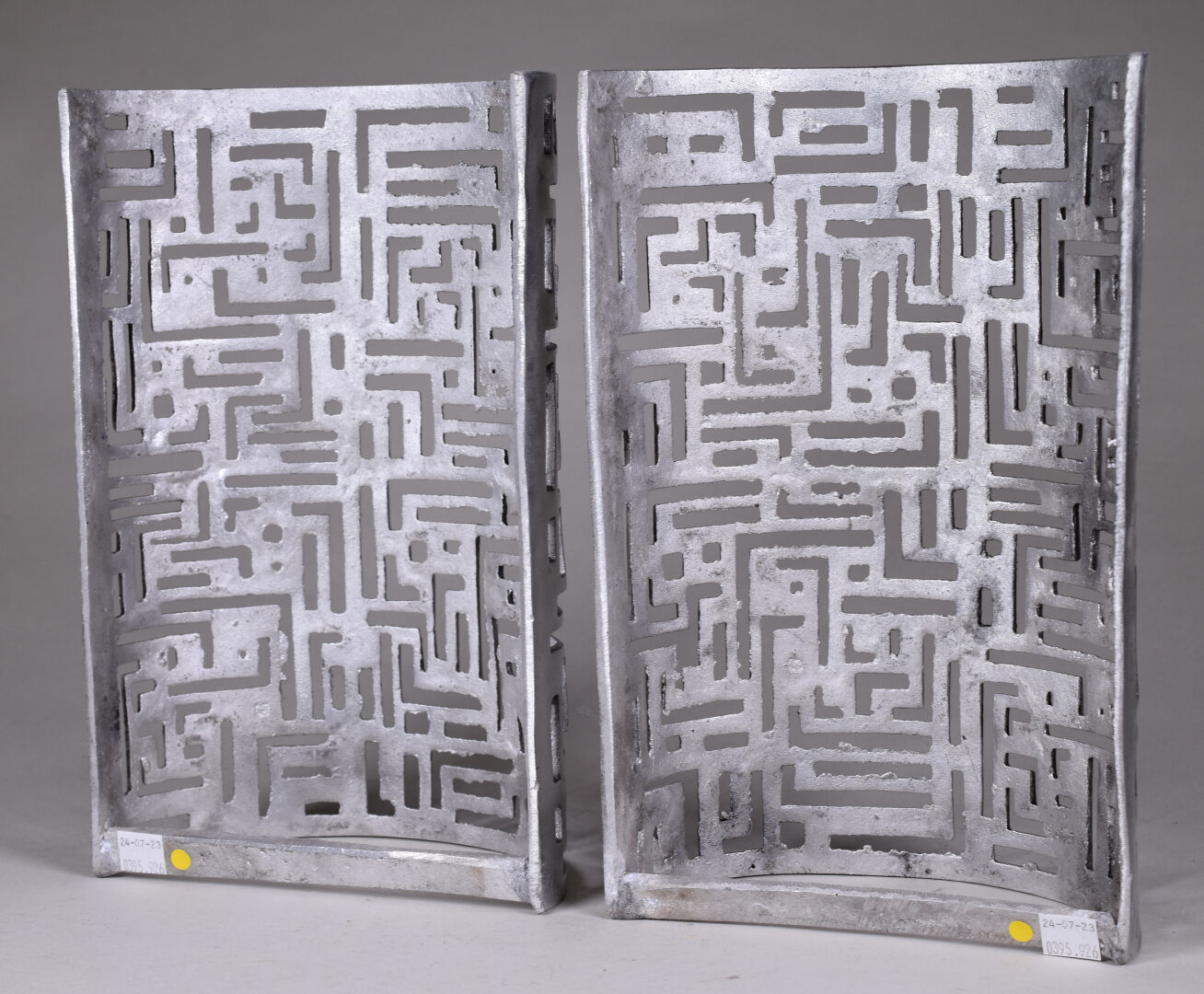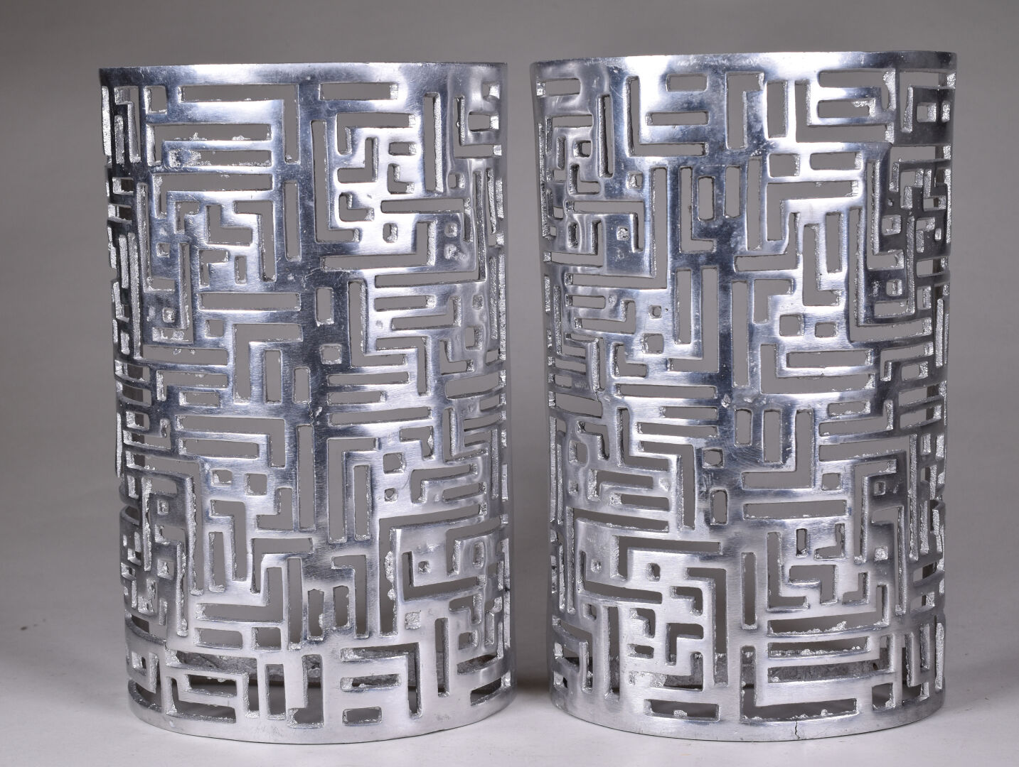 Paire d’appliques semi-cylindriques en métal (aluminium ?) ajouré de motif géométriques (non électrifiées). Vers 1970. Haut. : 30,5 cm.