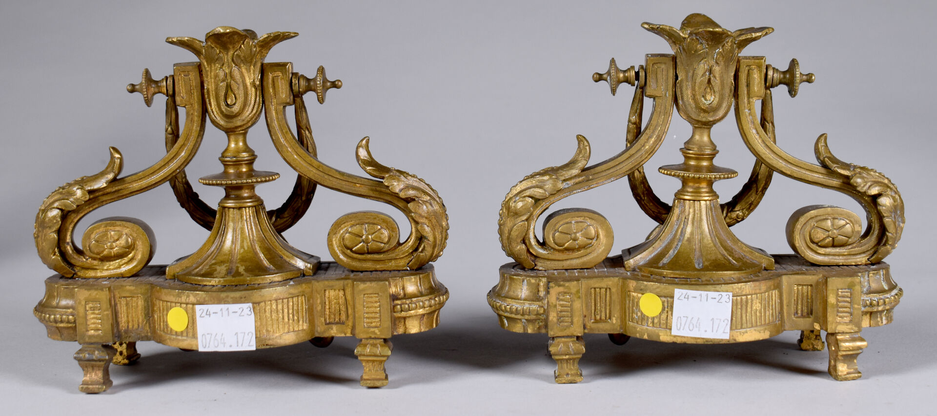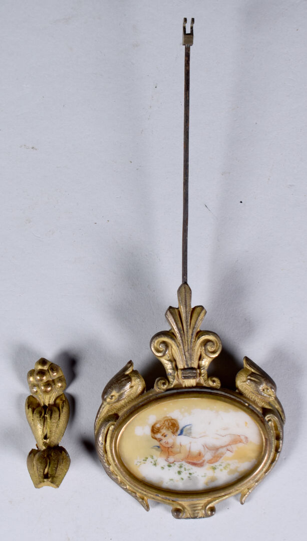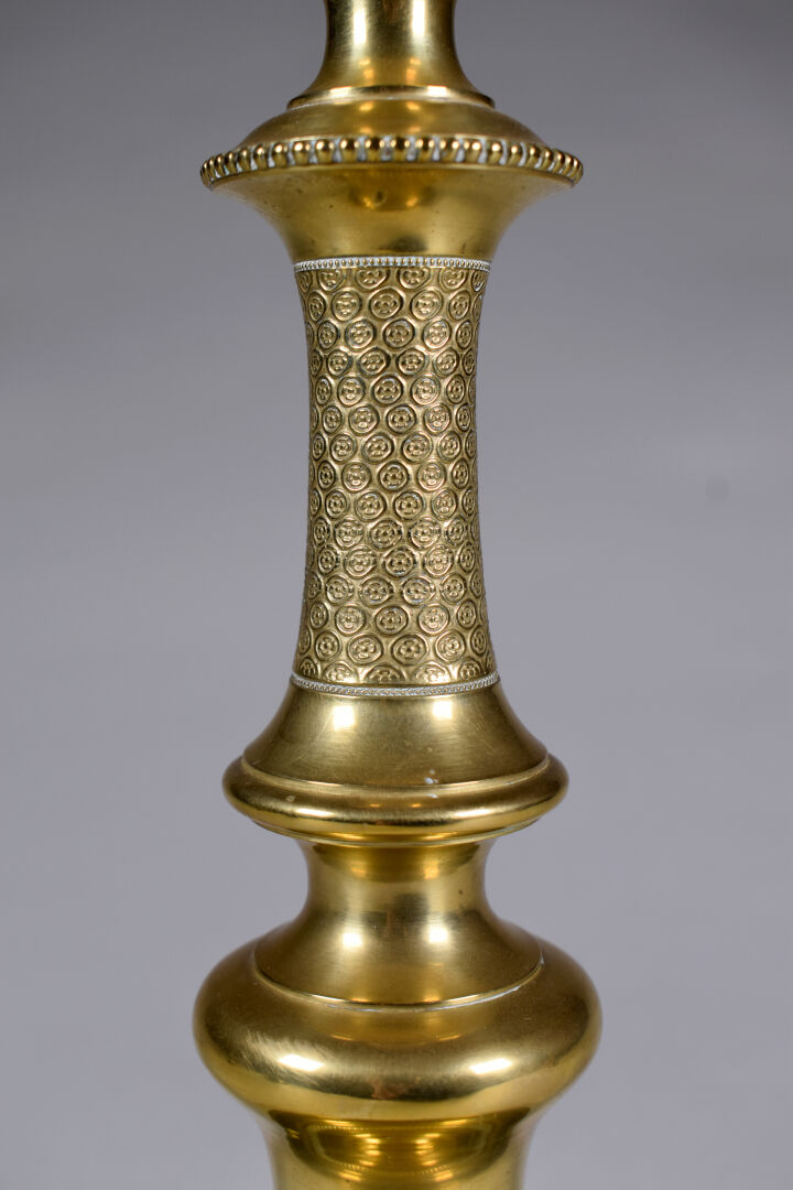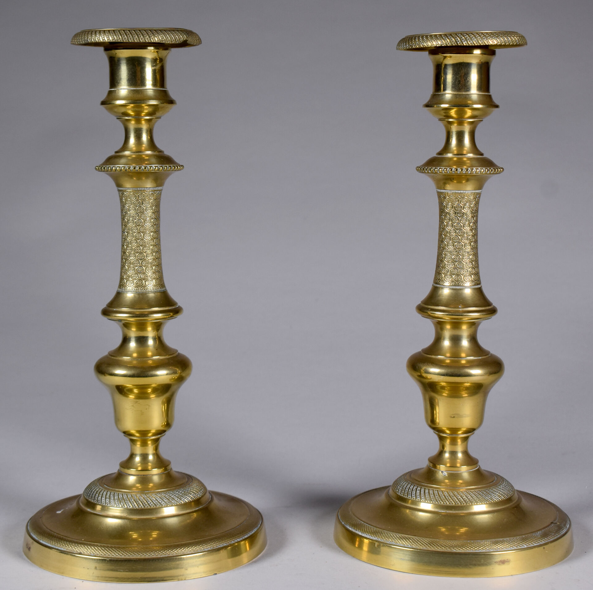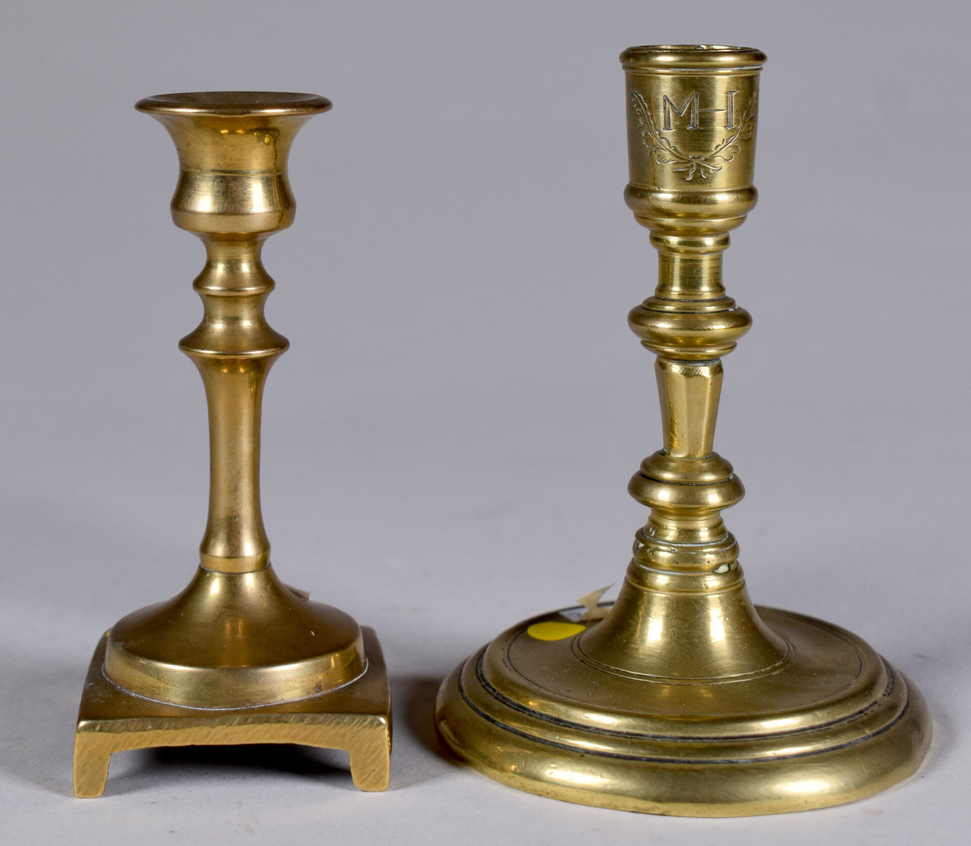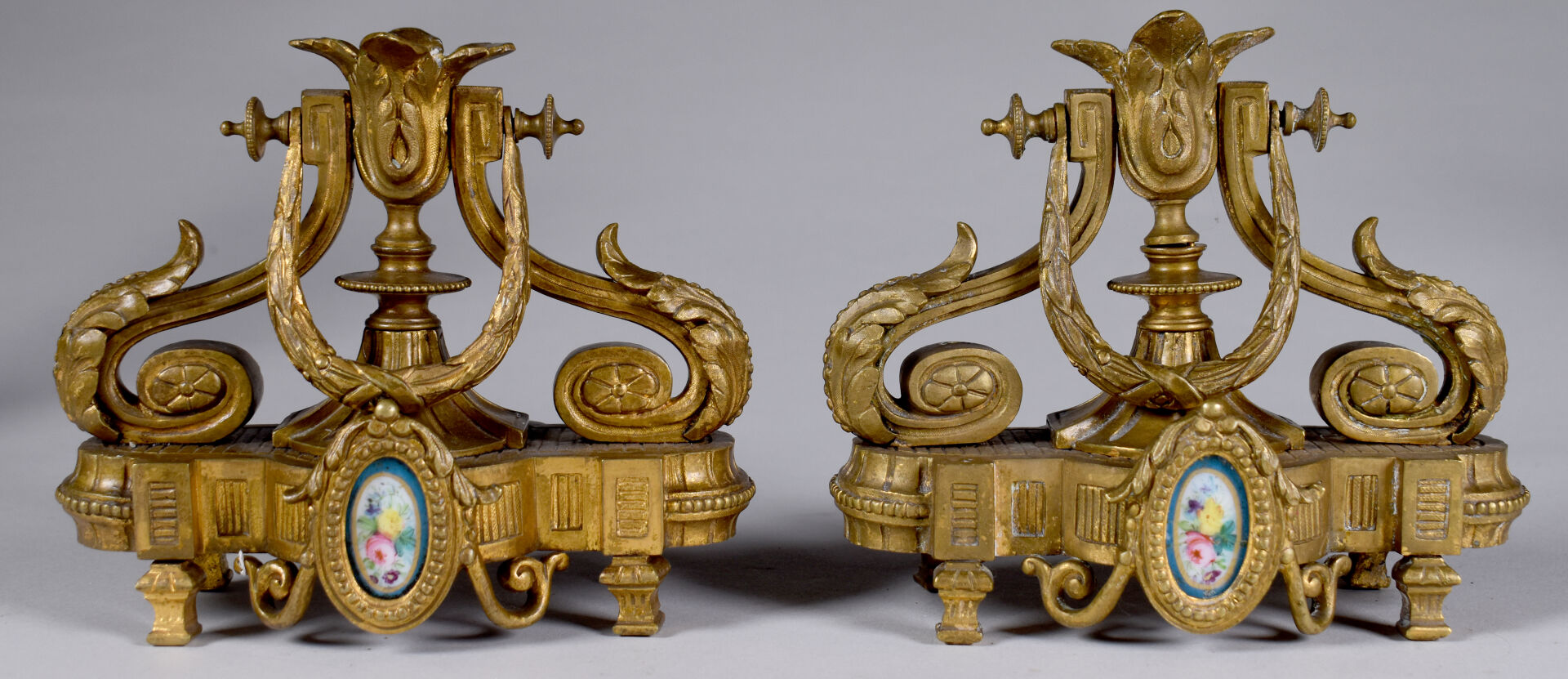 Paire de bases de bougeoirs en bronze ciselé doré ornés de plaques de porcelaine peinte de fleurs. Fin du XIXe siècle. Haut. : 13 cm.On joint deux bougeoirs miniature et une paire de chandeliers en laiton.
