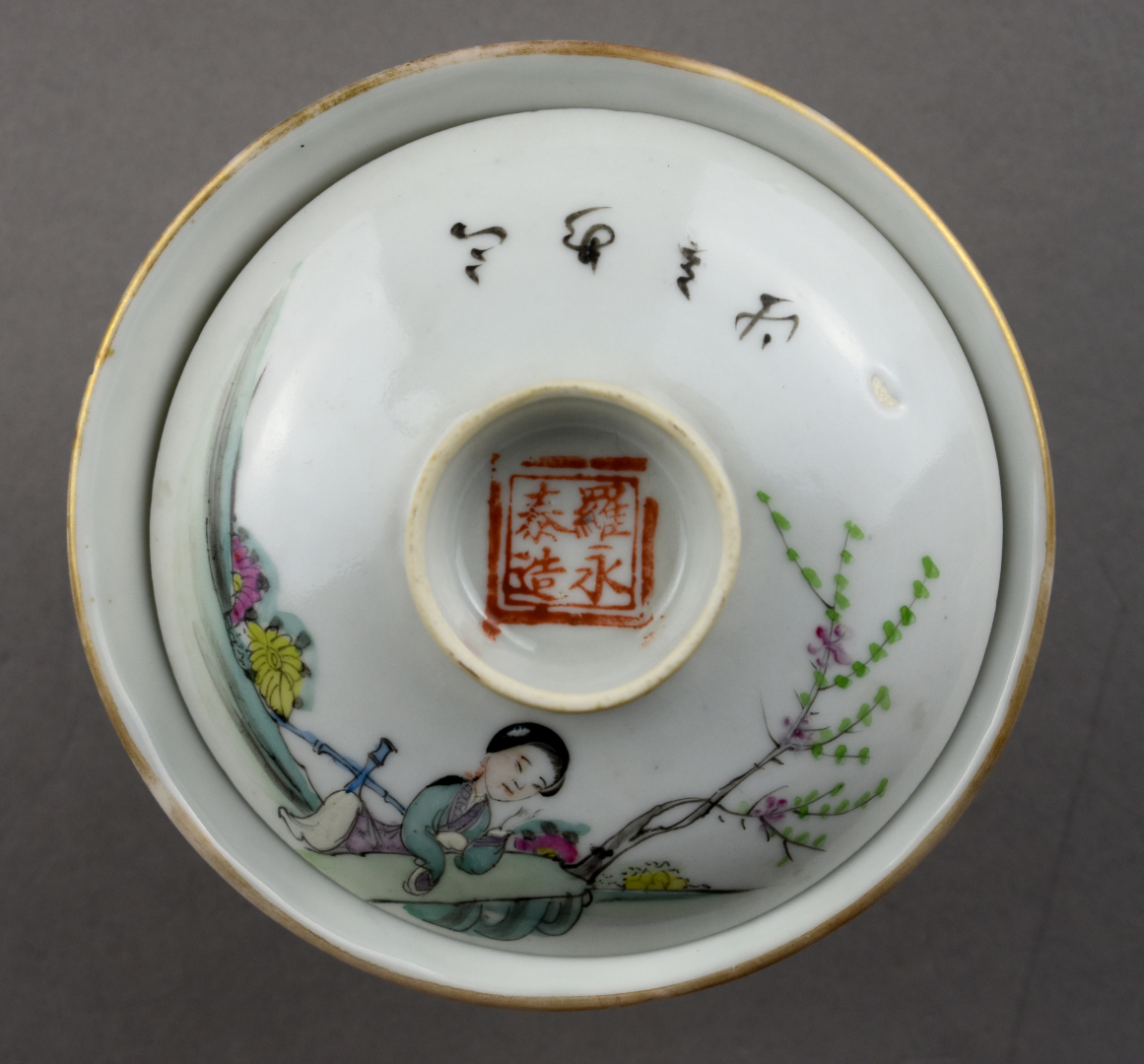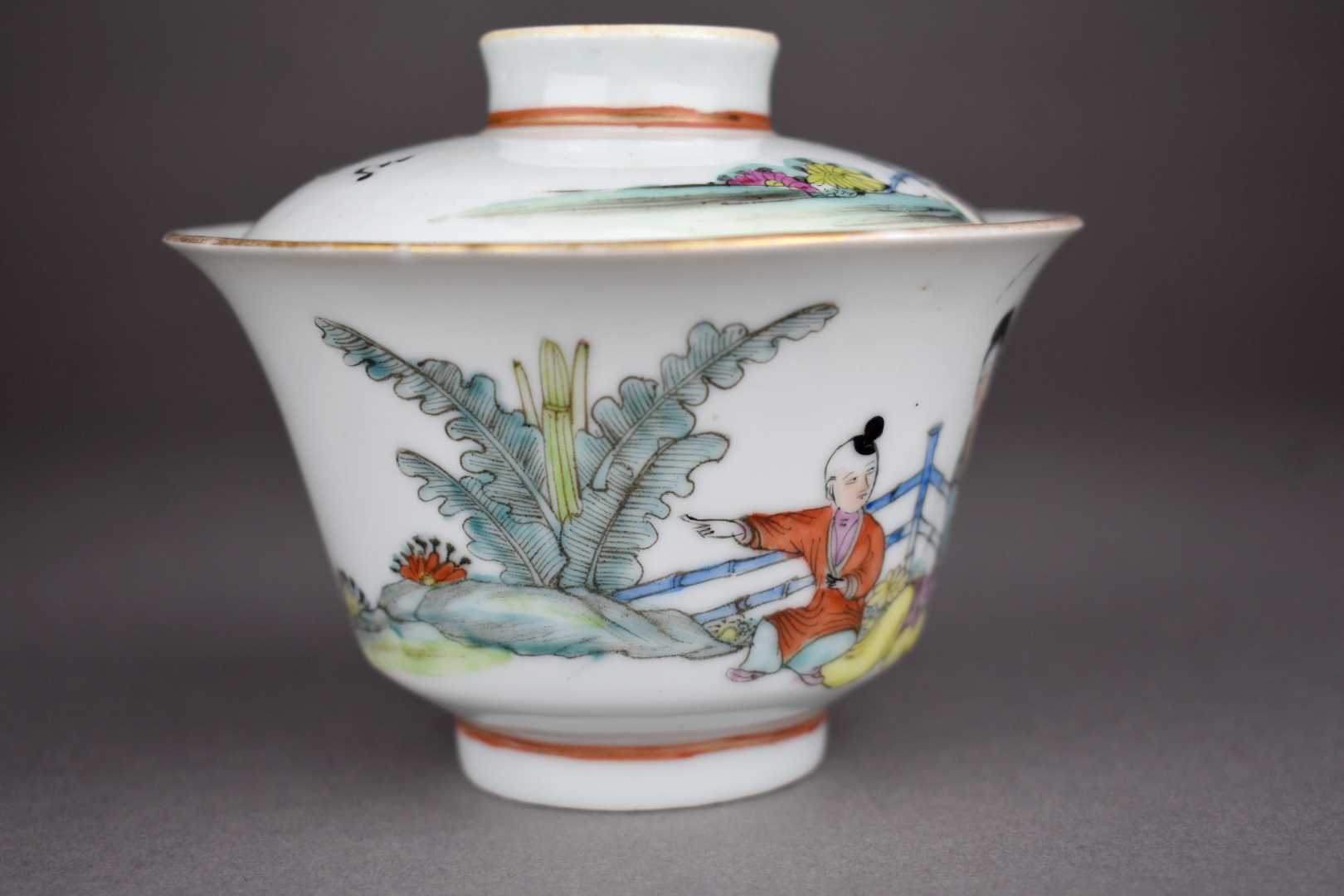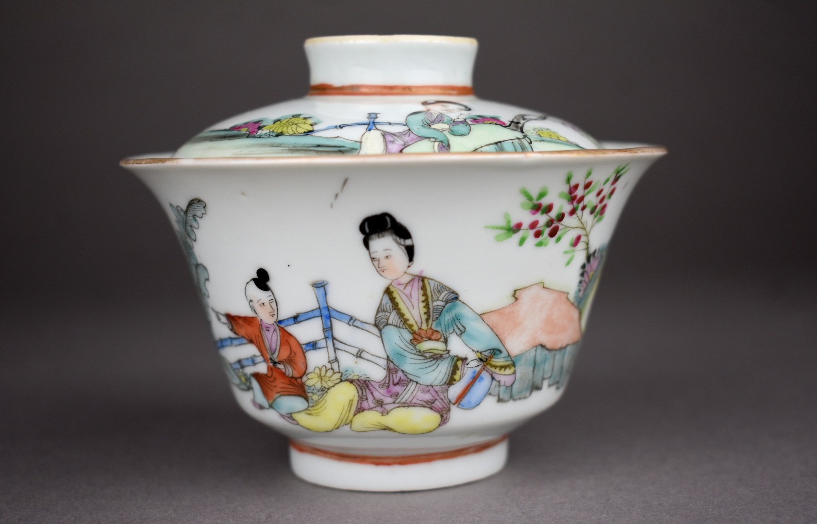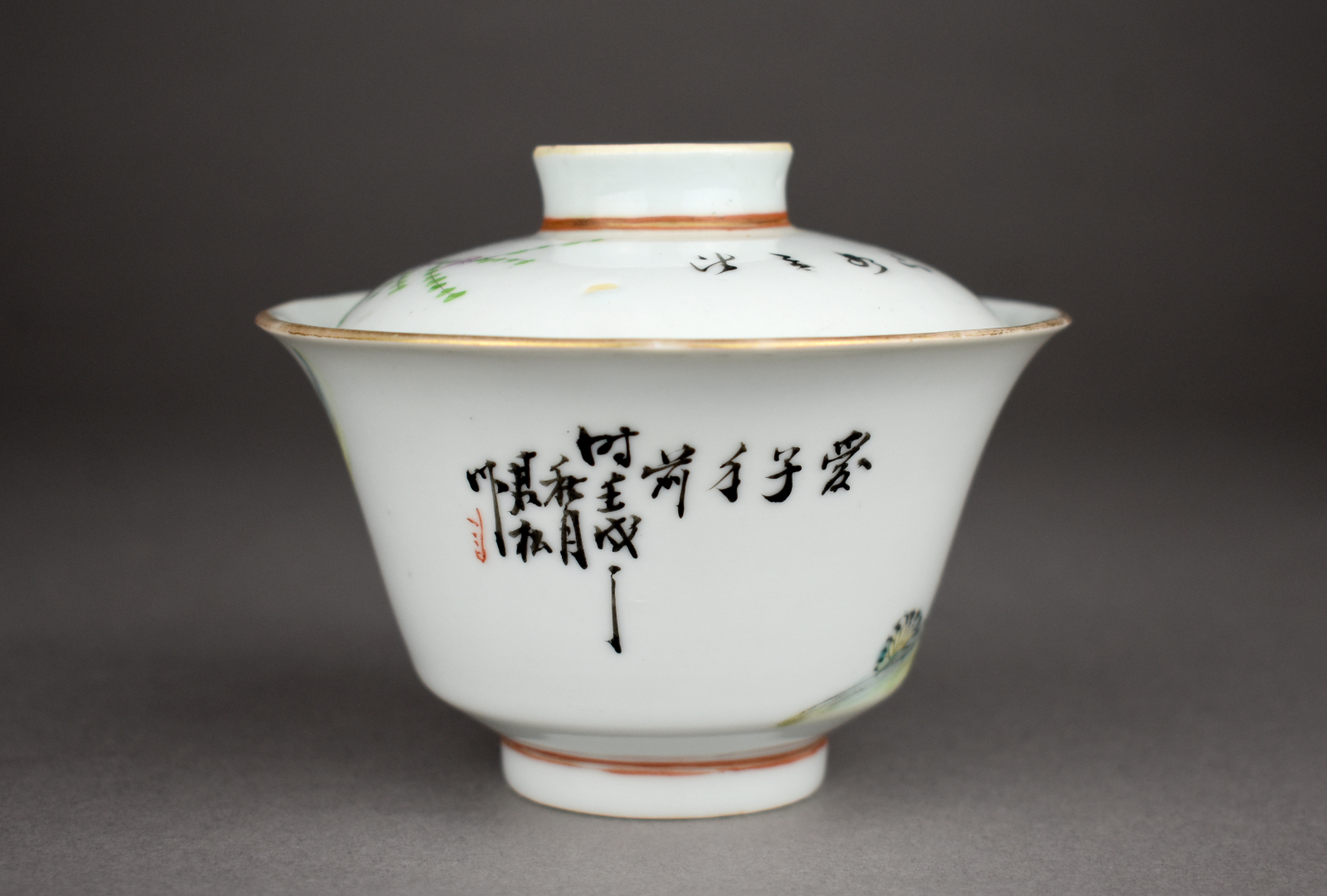 Paire de bols avec couvercle, en porcelaine à décor en émaux polychromes d’une femme avec son enfant et de calligraphie. Marque Tongzhi sur la base. Chine, fin XIXe siècle. Dim. : Haut. : 9 cm – Larg. : 10,5 cm.