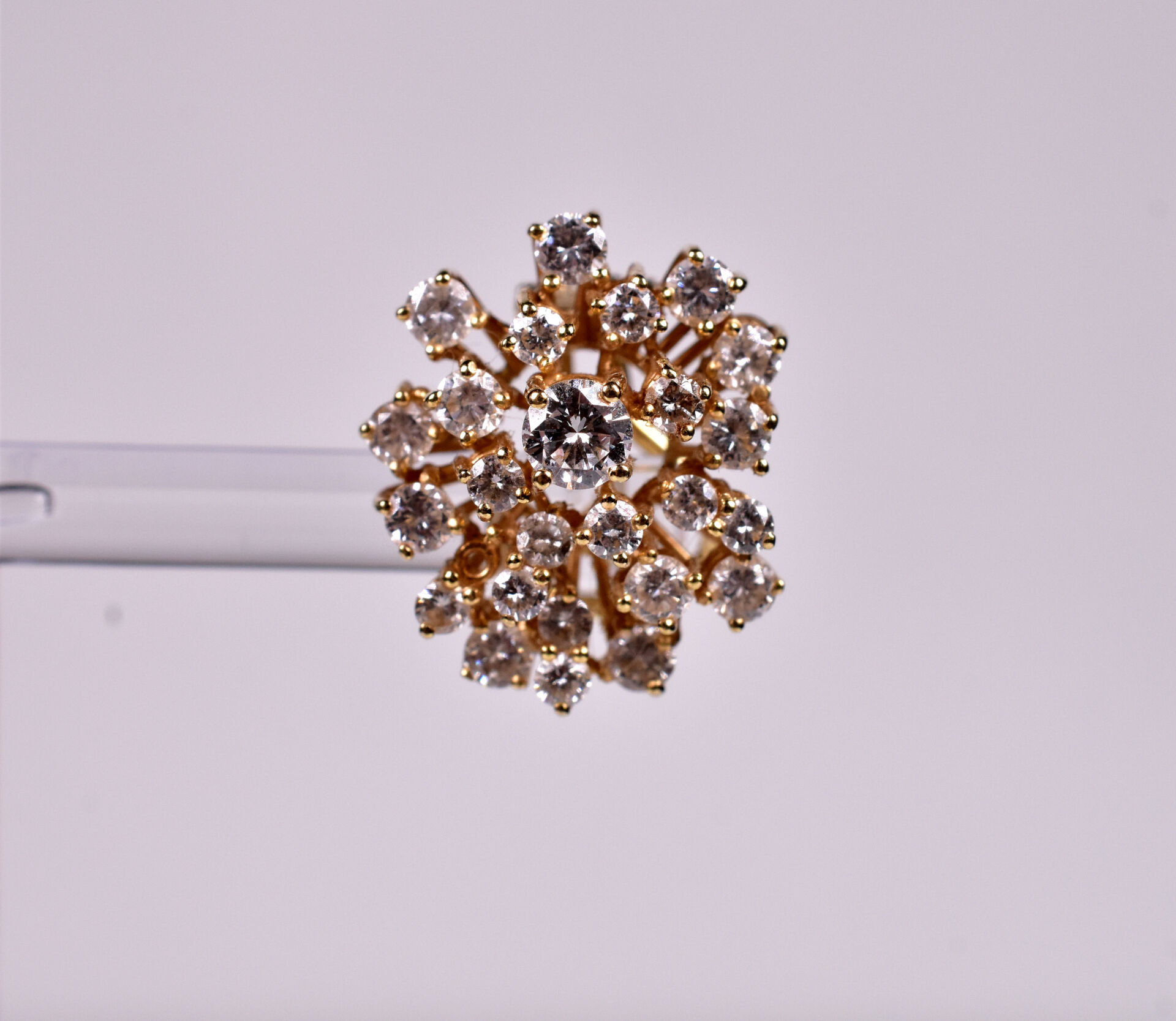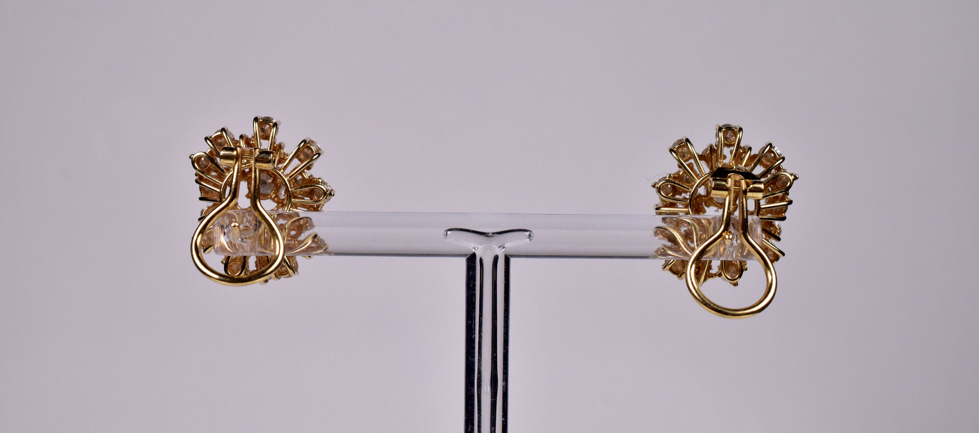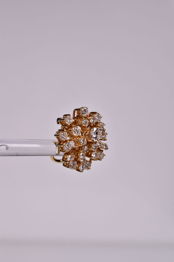 Paire de boucles d’oreilles en or jaune 18K 750/1000e. Chaque paire est sertie de 11 diamants taille moderne de 0,10 carat, de 11 diamants de taille moderne de 0,05 carat et d’un diamant de taille moderne de 0,25 carat (manque 1 petit diamant). Haut. : 2,5 cm. poids brut total. : 10,7 g.