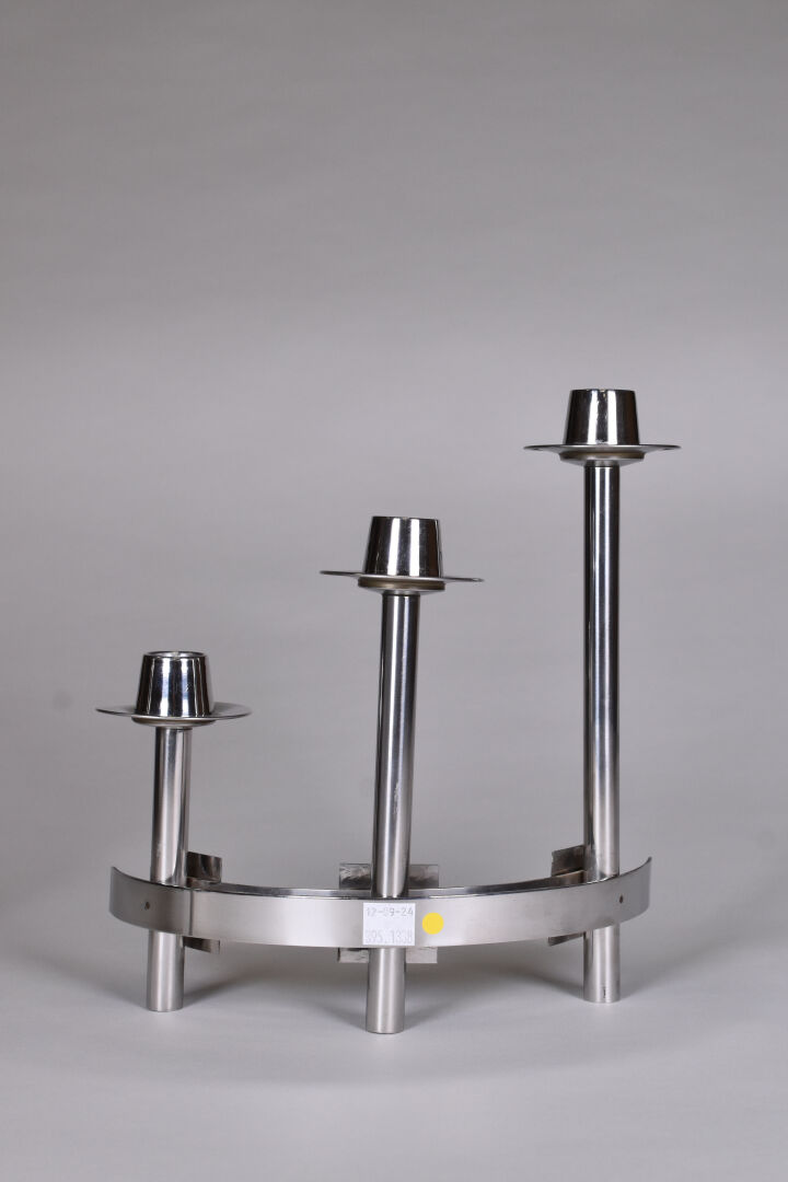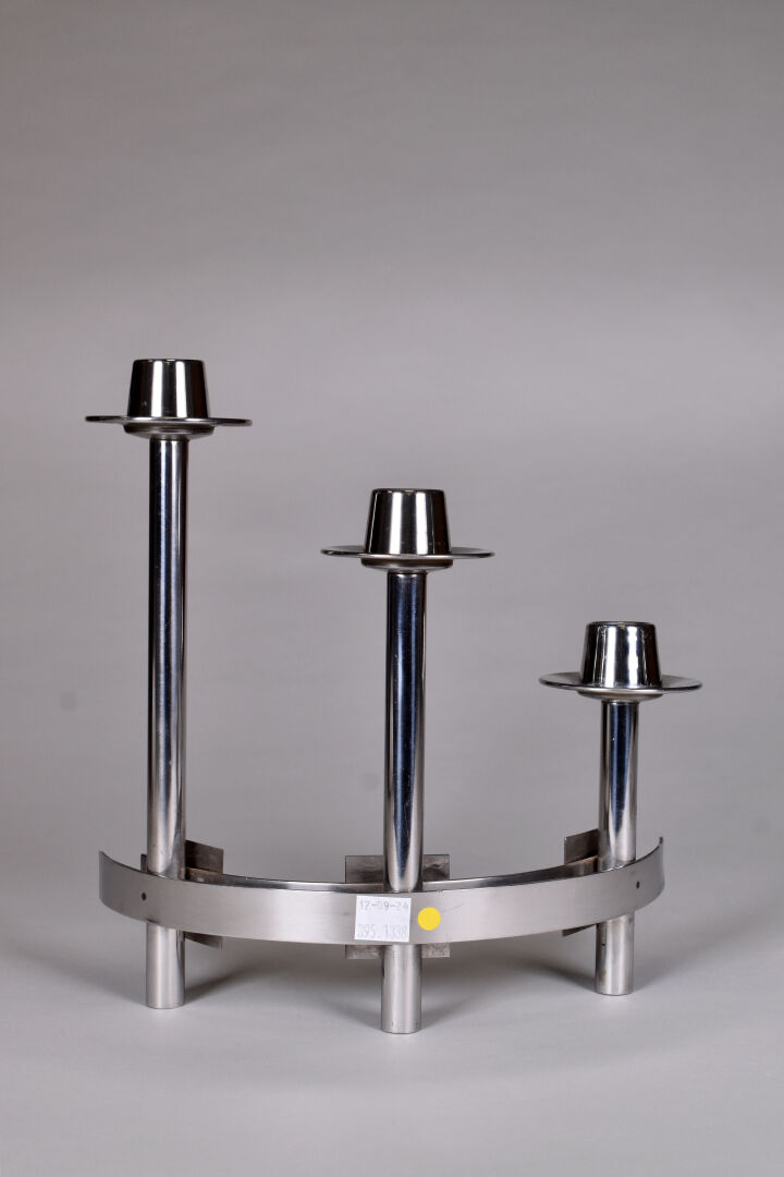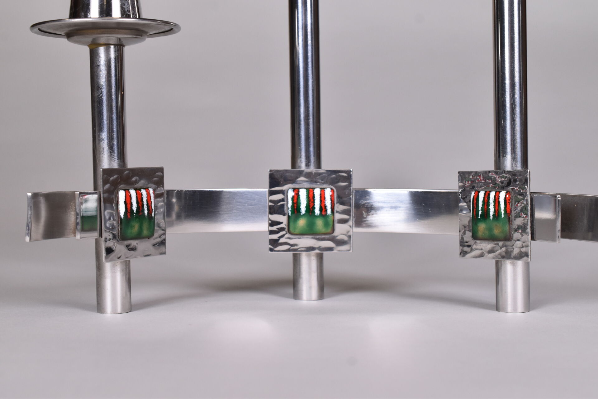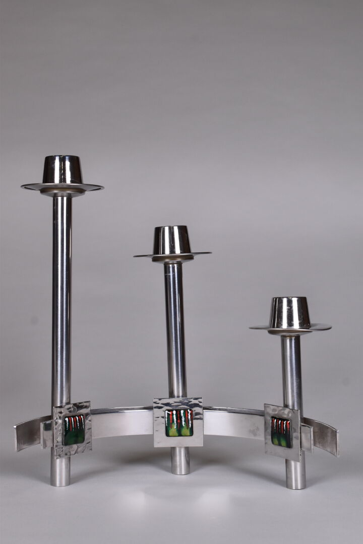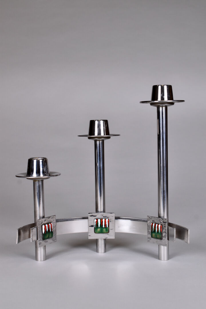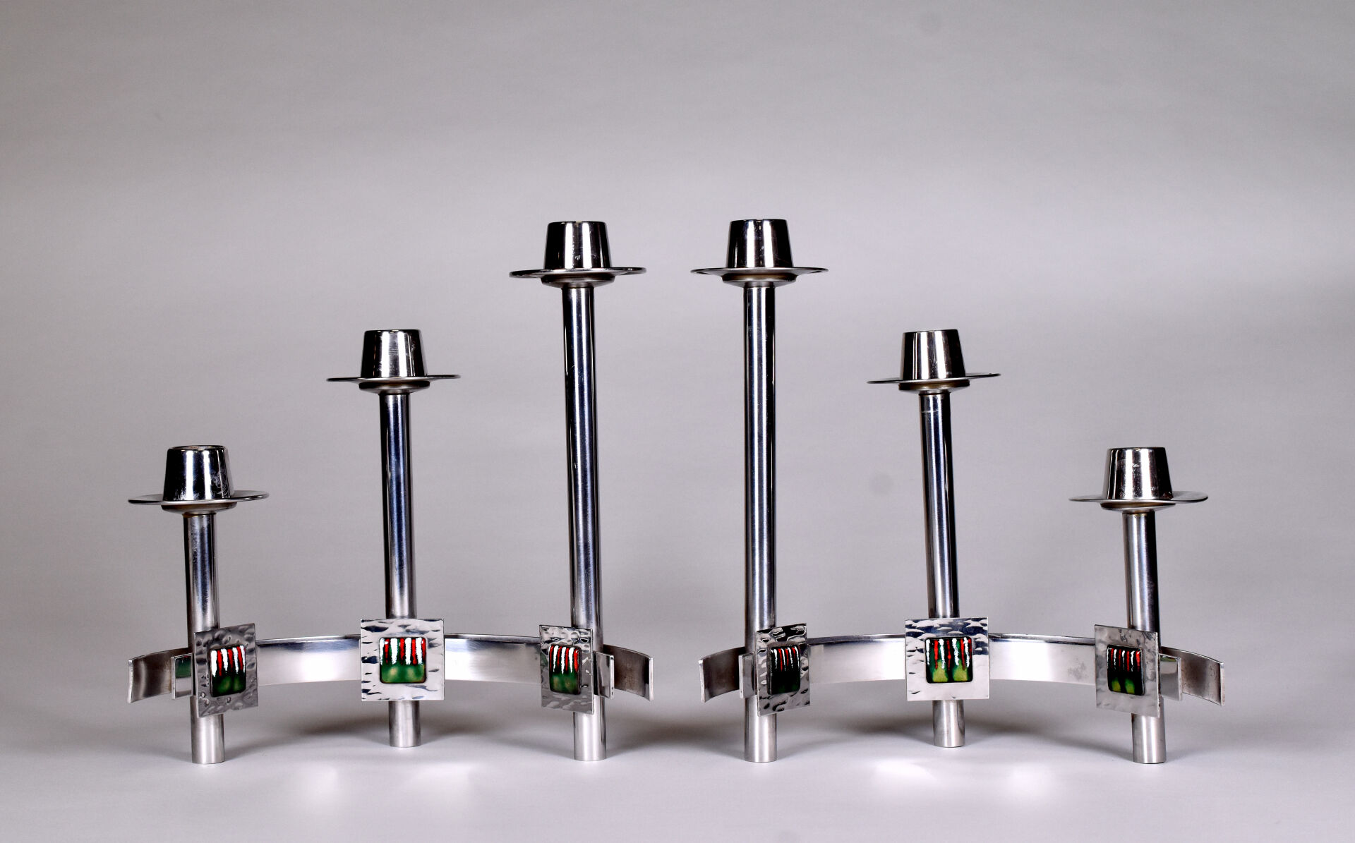 Paire de bougeoirs à 3 lumières en métal chromé ornés de trois pastilles émaillées rouge, blanc et vert. Seconde moitié du XXe siècle. Haut. : 26 cm – Larg. : 23,5 cm.