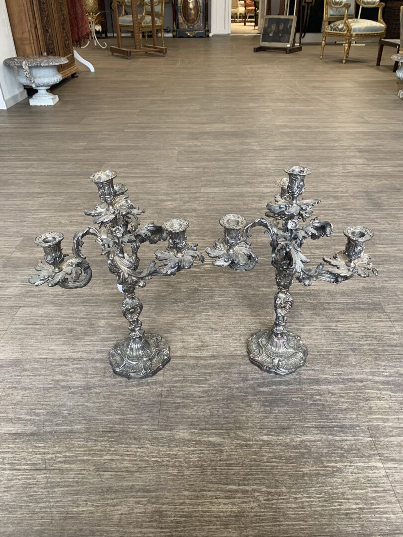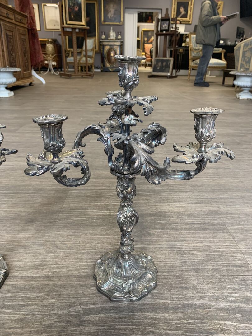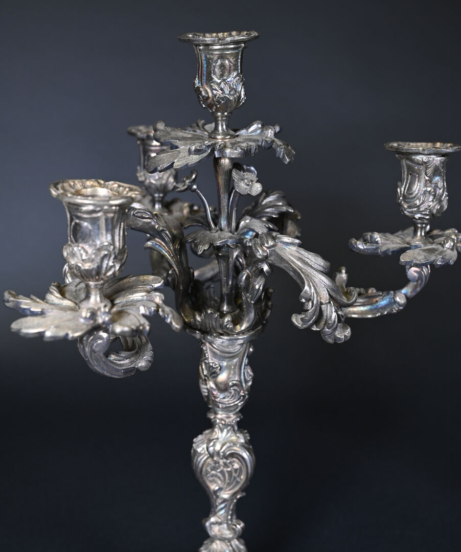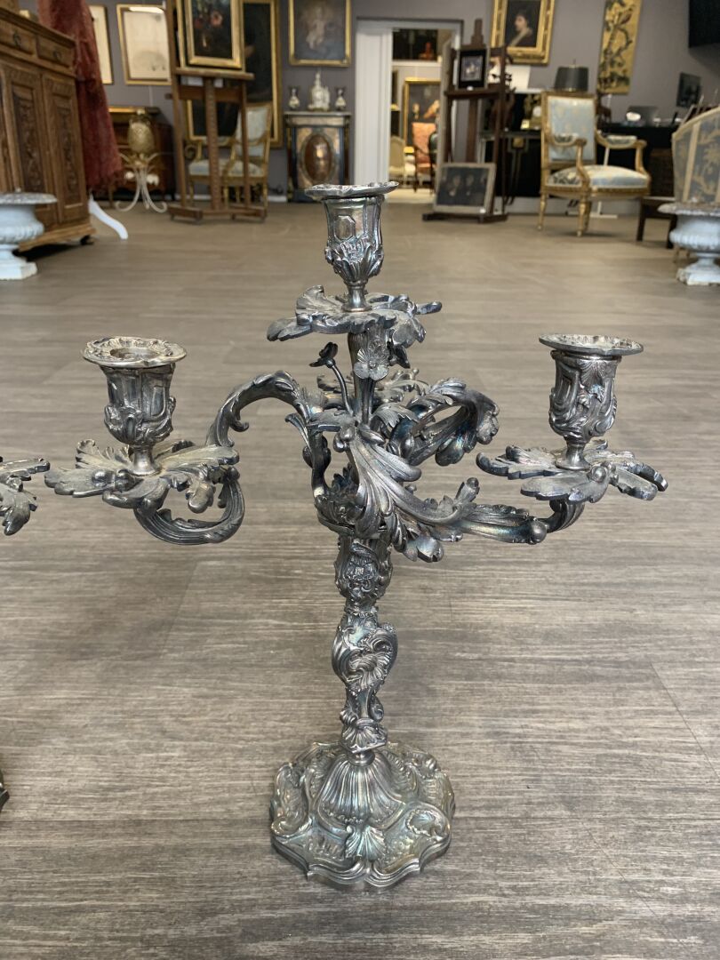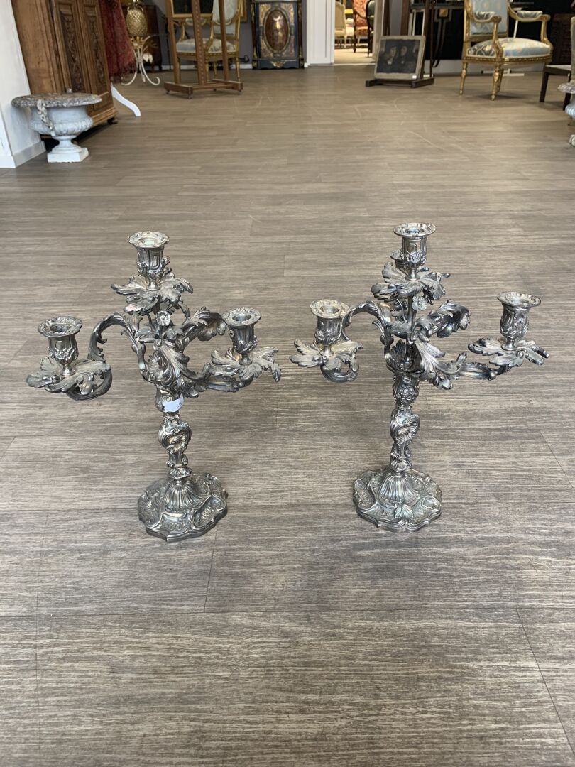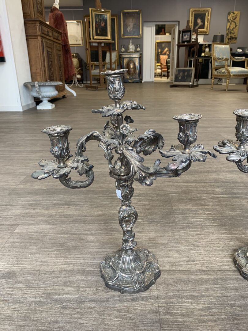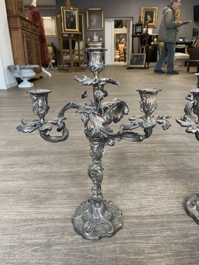 Paire de bougeoirs en bronze argenté à 3 bras et 4 lumières feuillagés (légèrement penchés, deux bras très légèrement déformés). Le fût à décor de rocailles. Style Louis XV, XIXe siècle. Haut. : 46 cm.