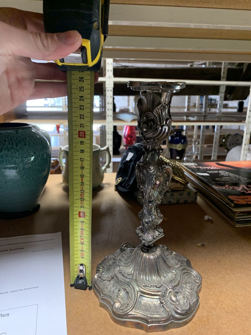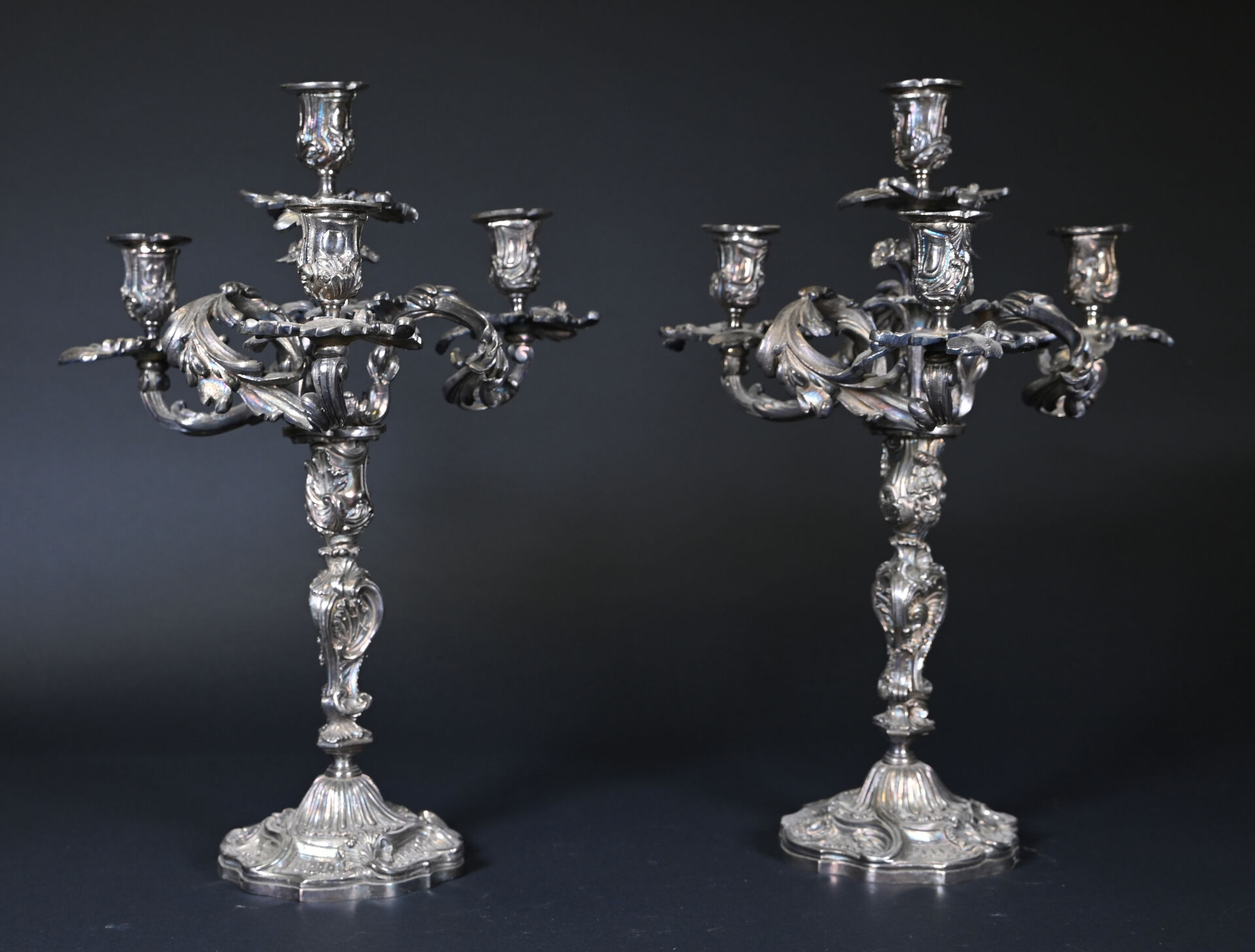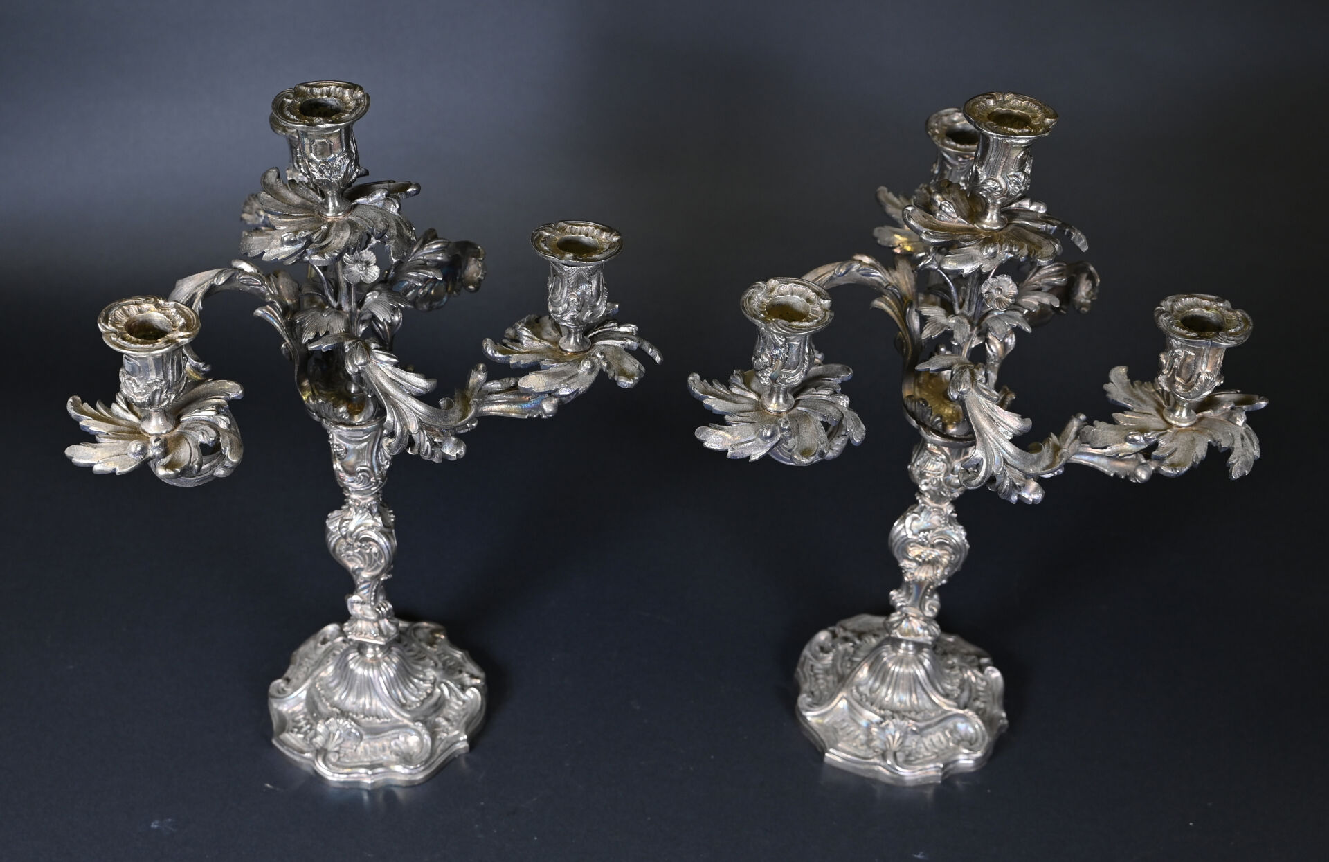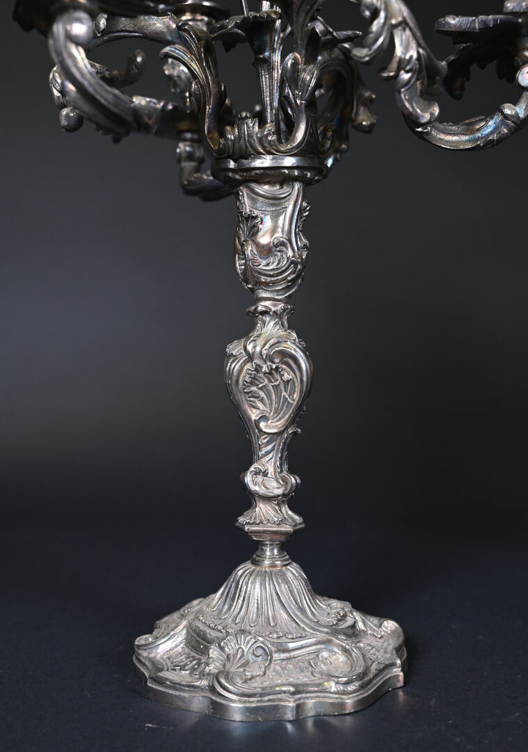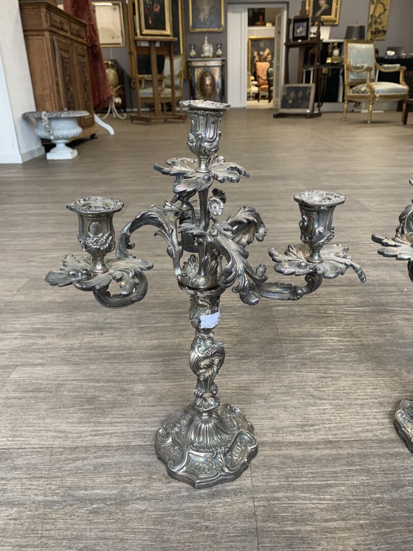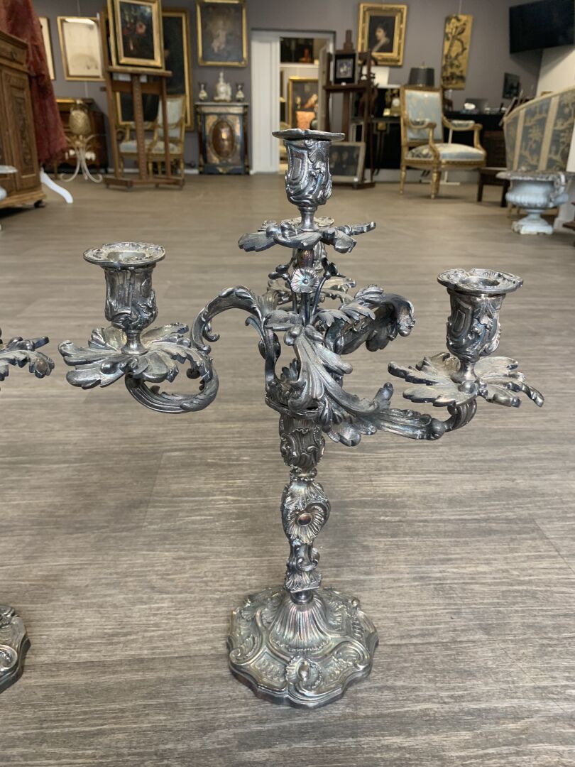 Paire de bougeoirs en bronze argenté à 3 bras et 4 lumières feuillagés (légèrement penchés, deux bras très légèrement déformés). Le fût à décor de rocailles. Style Louis XV, XIXe siècle. Haut. : 46 cm.