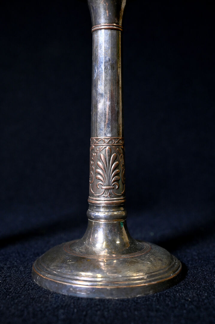Paire de bougeoirs en bronze argenté à décor de palmettes. XIXe siècle. Haut. : 24 cm.