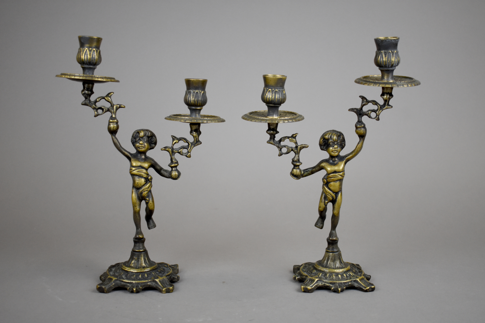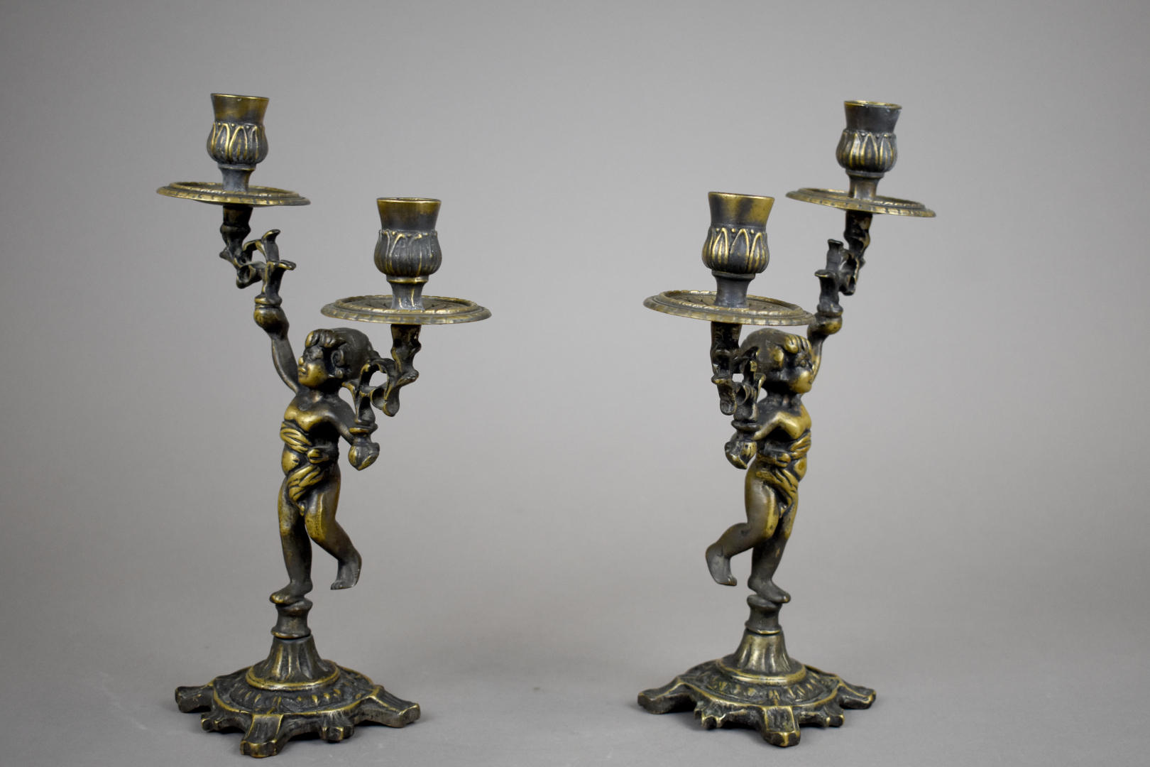 Paire de bougeoirs en bronze légèrement patiné brun. Le fût figurant des putti. Fin du XIXe ou début du XXe siècle. Haut. : 30 cm.