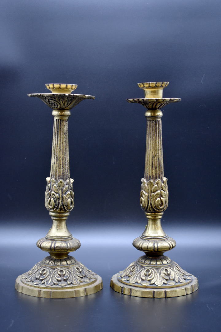 Paire de bougeoirs en bronze moulé d’acanthes. Haut. : 31 cm. On joint une paire de patères représentant des cassolettes.