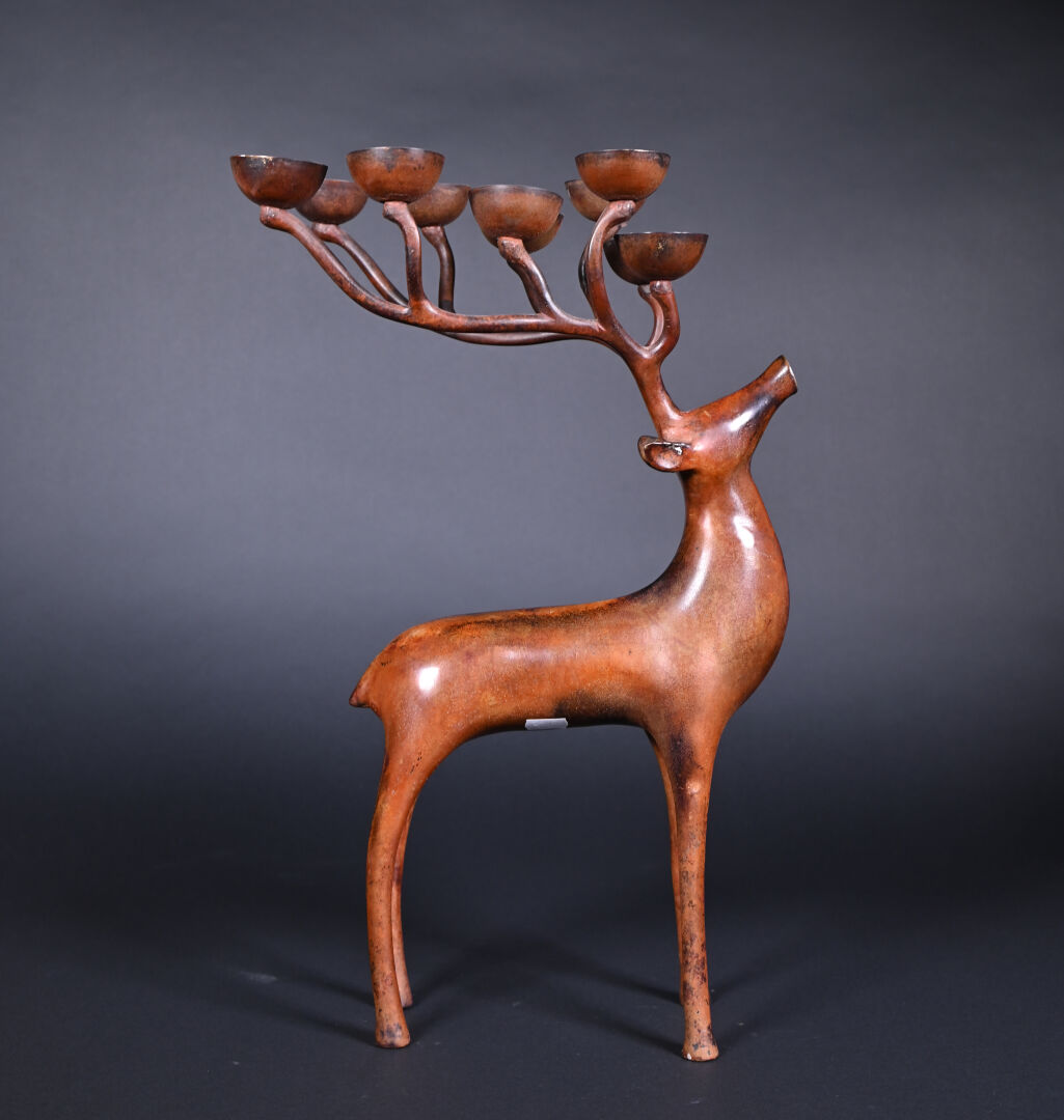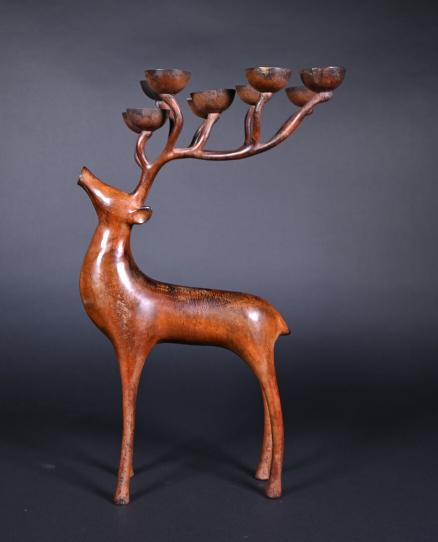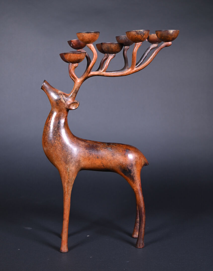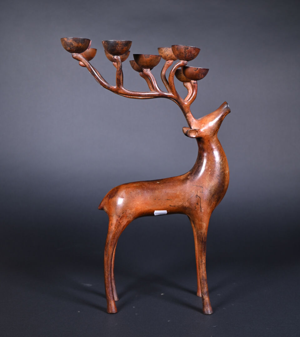 Paire de bougeoirs en bronze patiné médaille à 10 lumières représentant des cerfs, les bois abritant les bobèches. Seconde moitié du XXe siècle. Haut. : 53,5 cm.