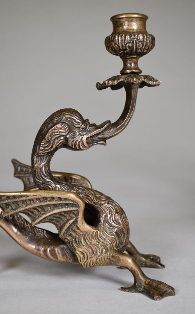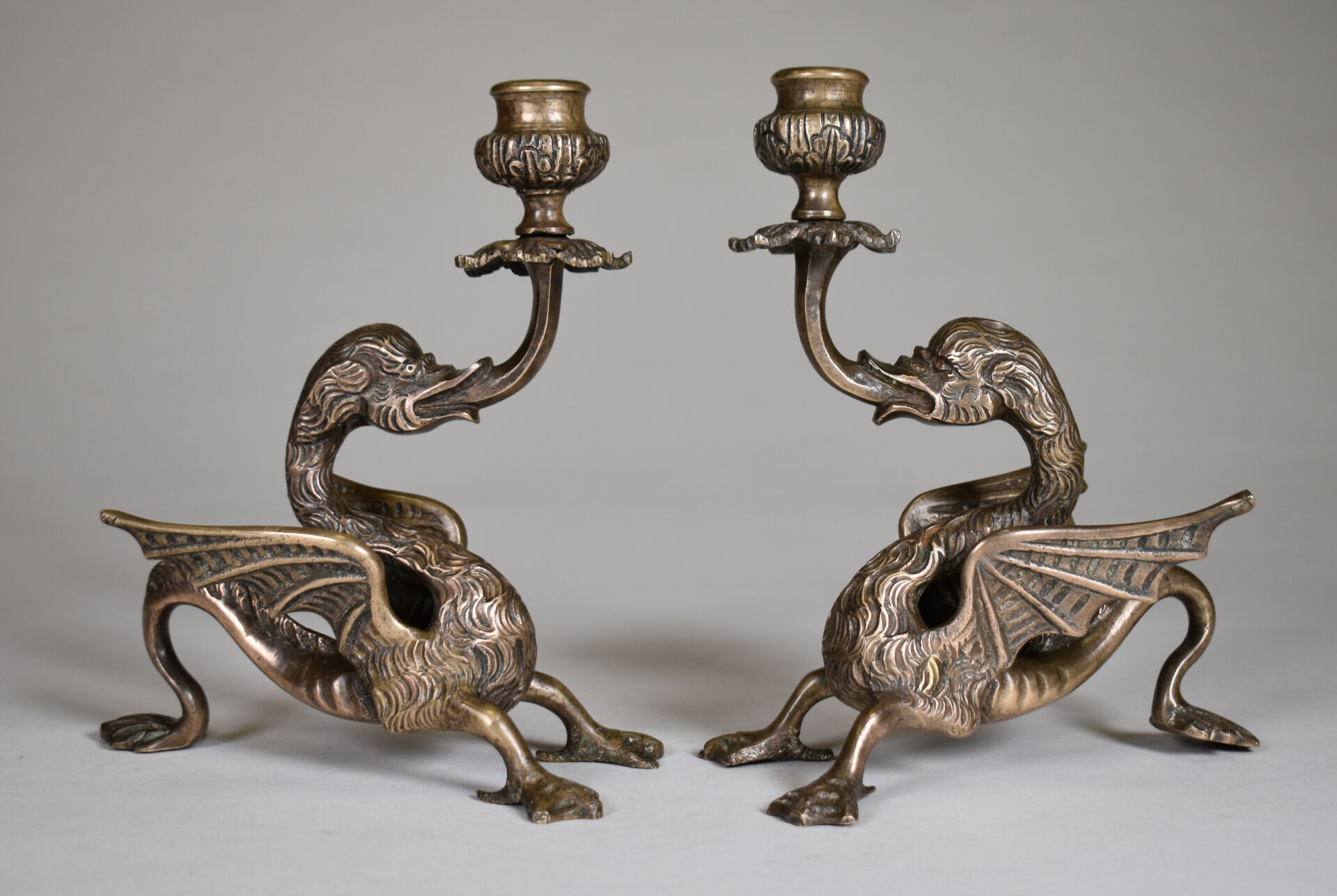 Paire de bougeoirs en bronze représentant des animaux fantastiques. Travail probablement étranger du début du XXe siècle. Haut. : 20 cm.