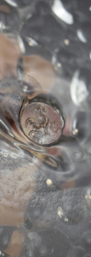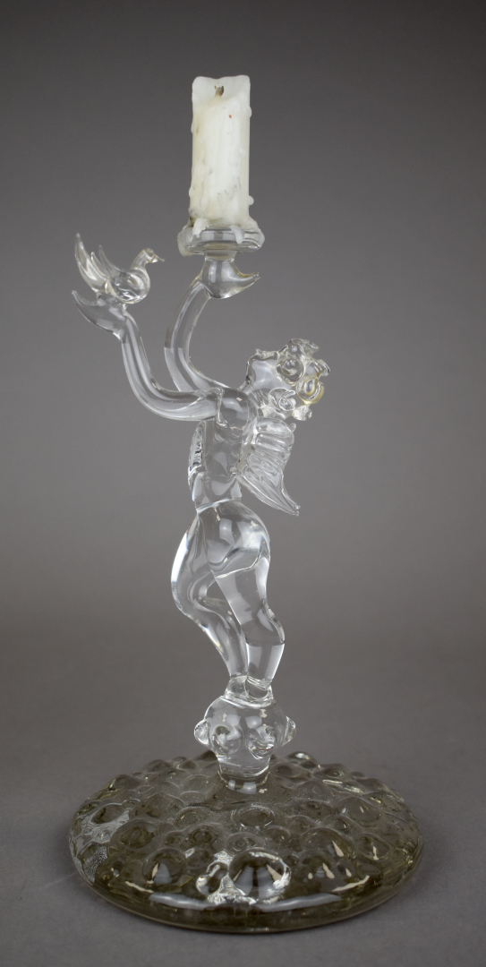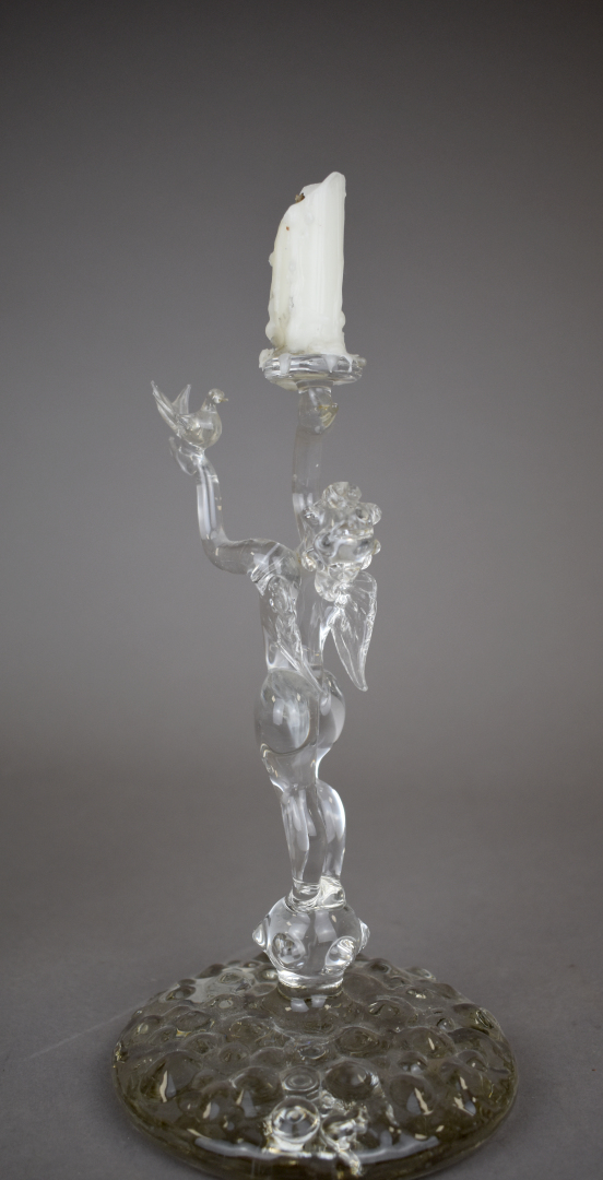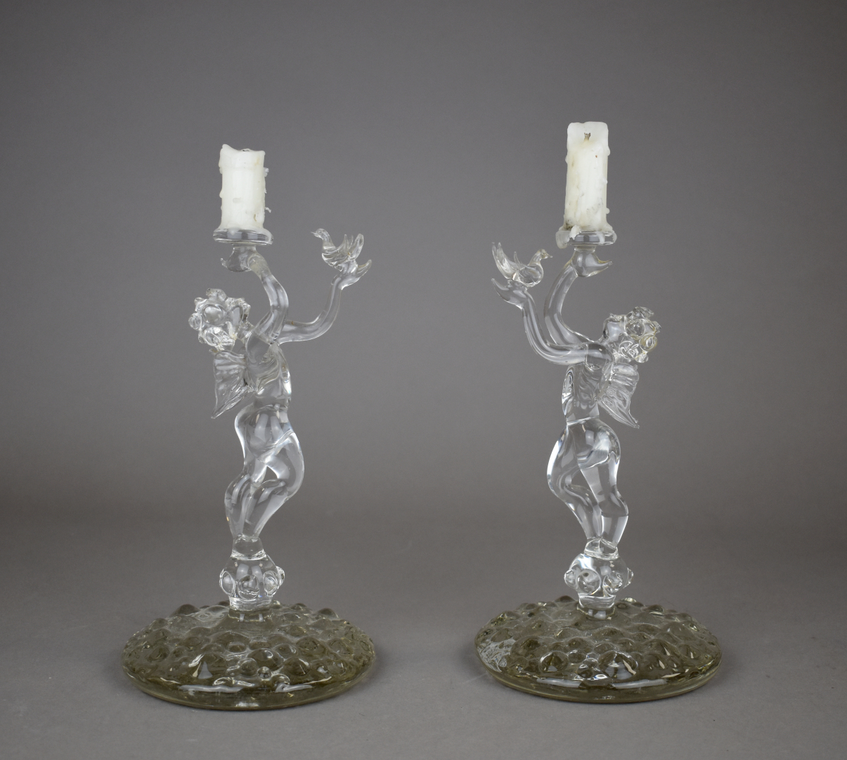 Paire de bougeoirs en cristal moulé. Le fût représentant un ange tenant une colombe. Marqués CG sous la base. Haut. : 22,5 cm.