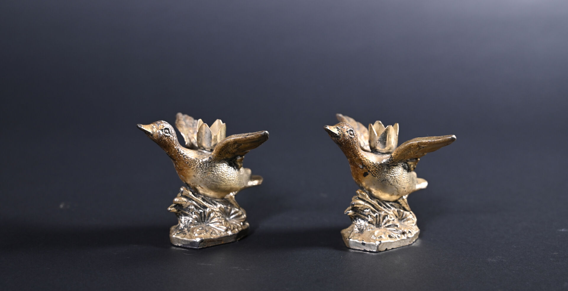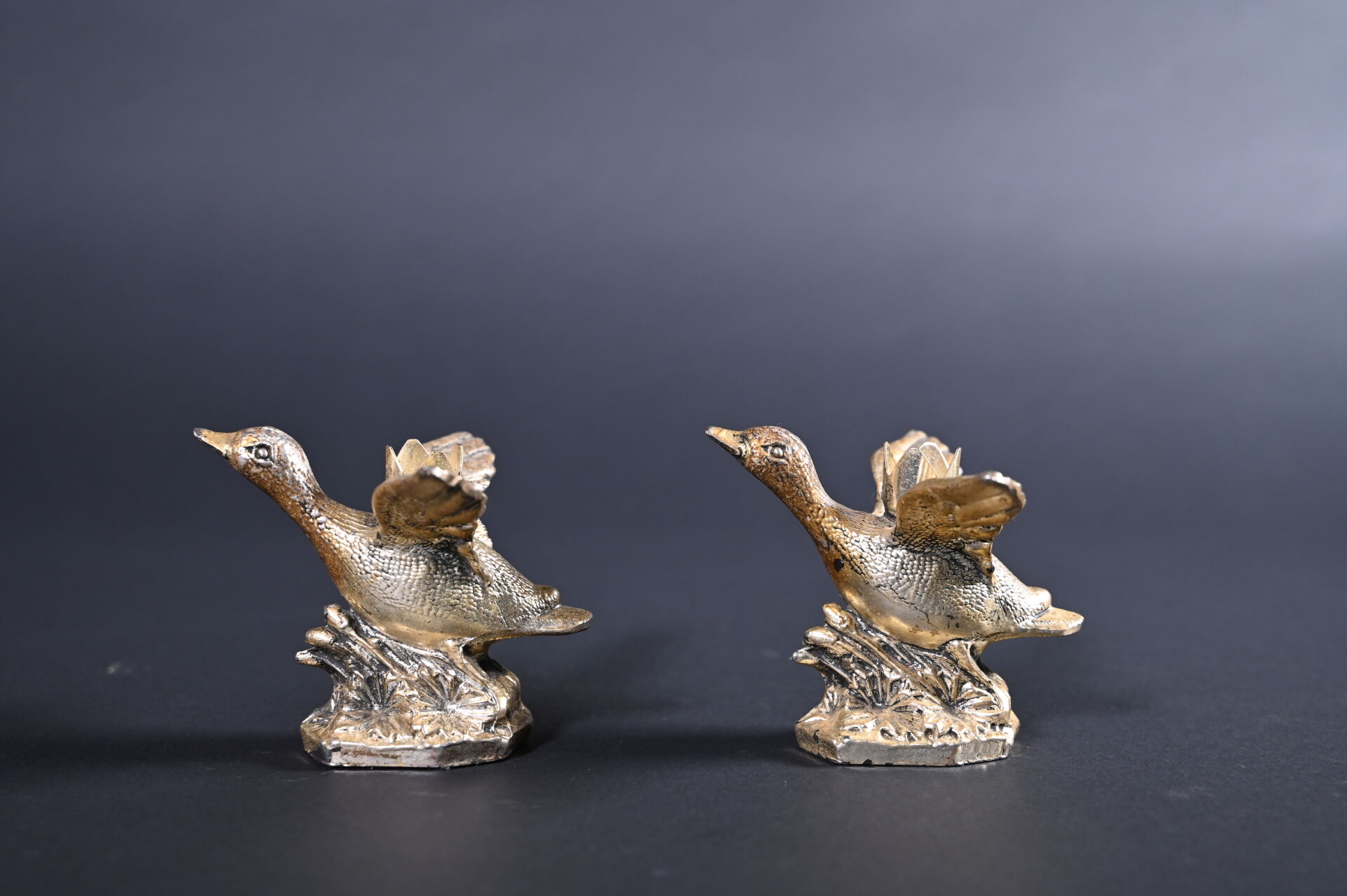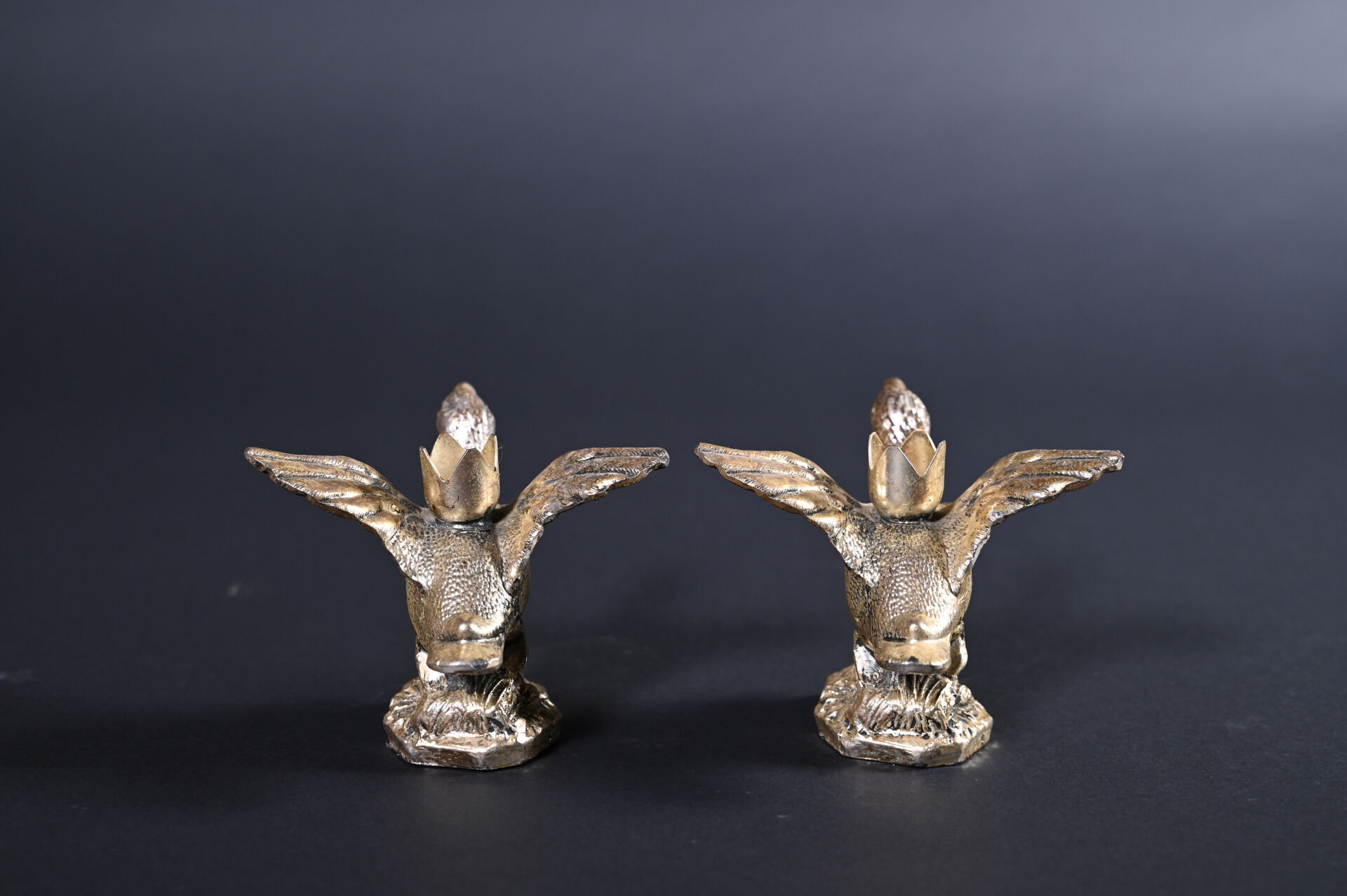 Paire de bougeoirs en métal argenté figurant des canards à l’envol. Marque au dos. Travail très probablement étranger. Haut. : 9,5 cm.