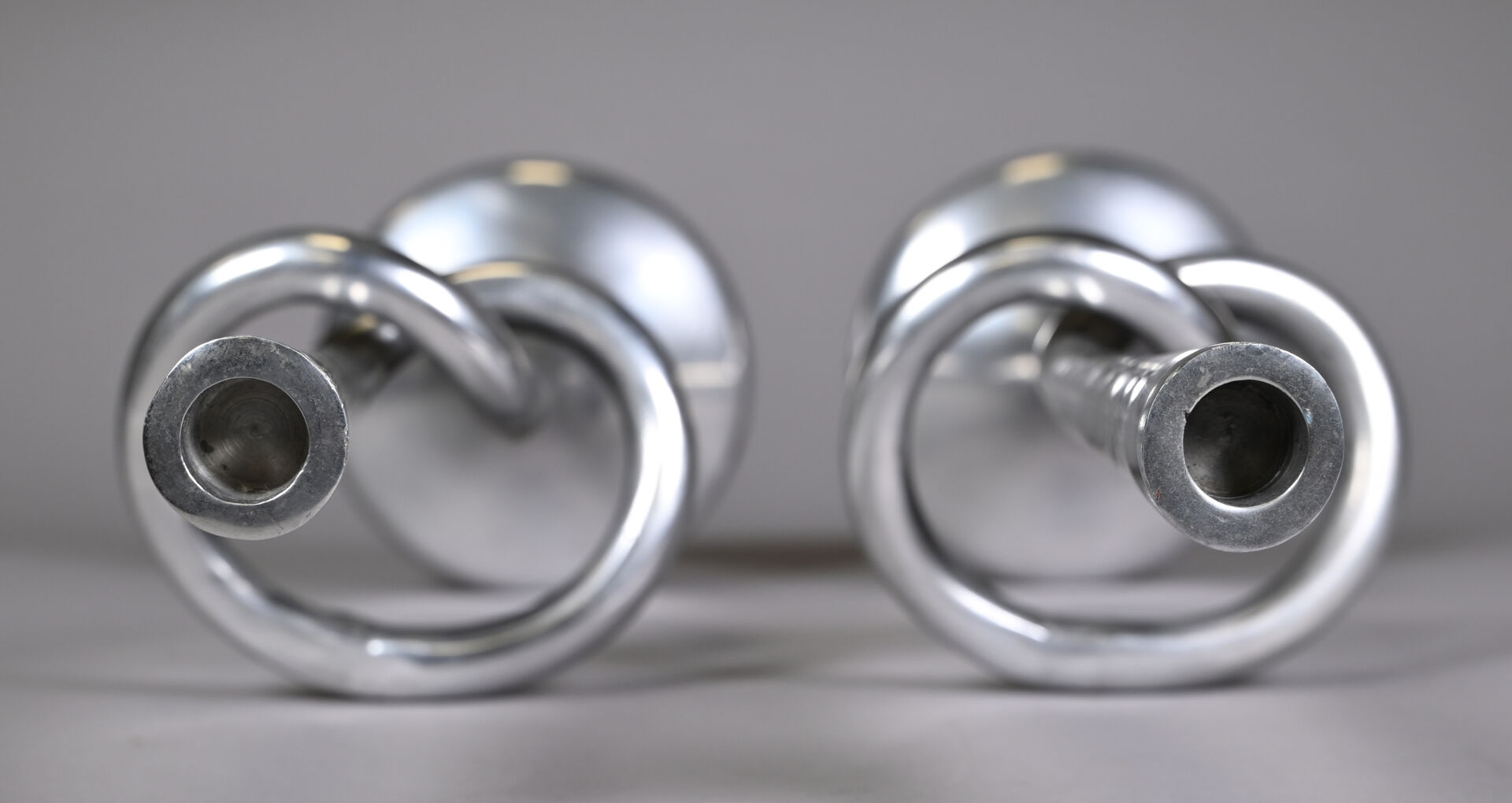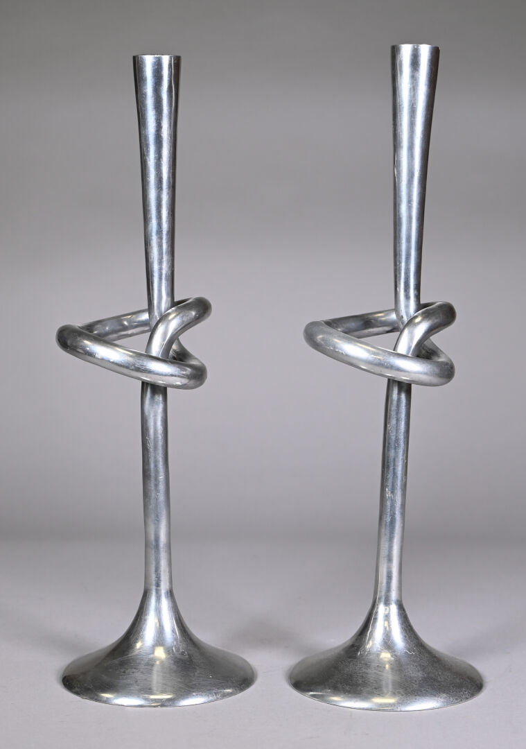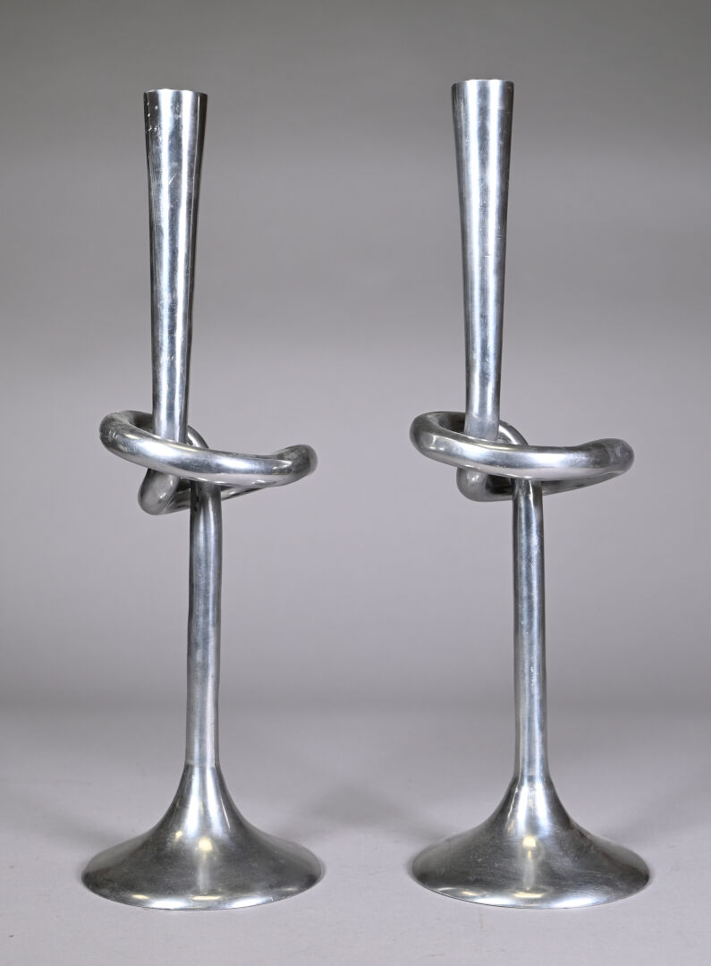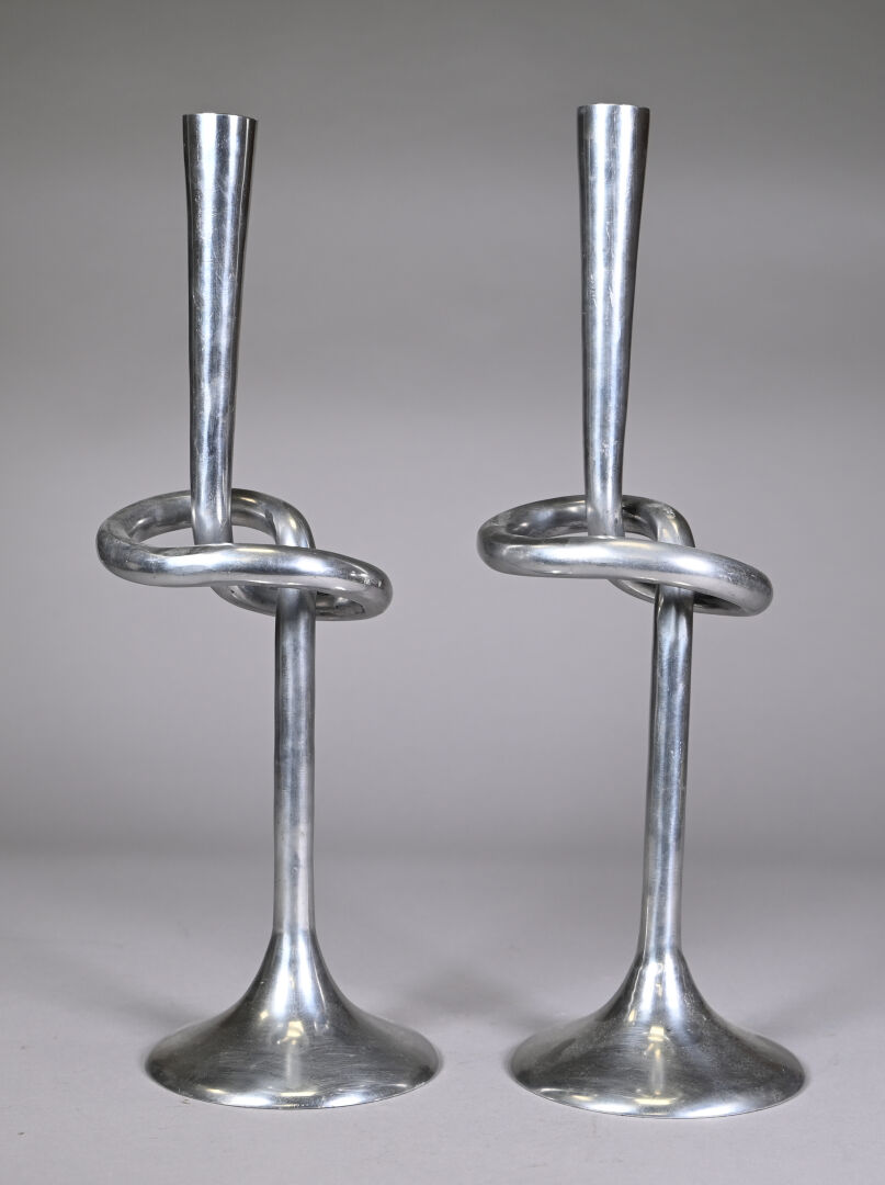 Paire de bougeoirs en métal chromé le fût noué. Travail des années 1970. Haut. : 45 cm.