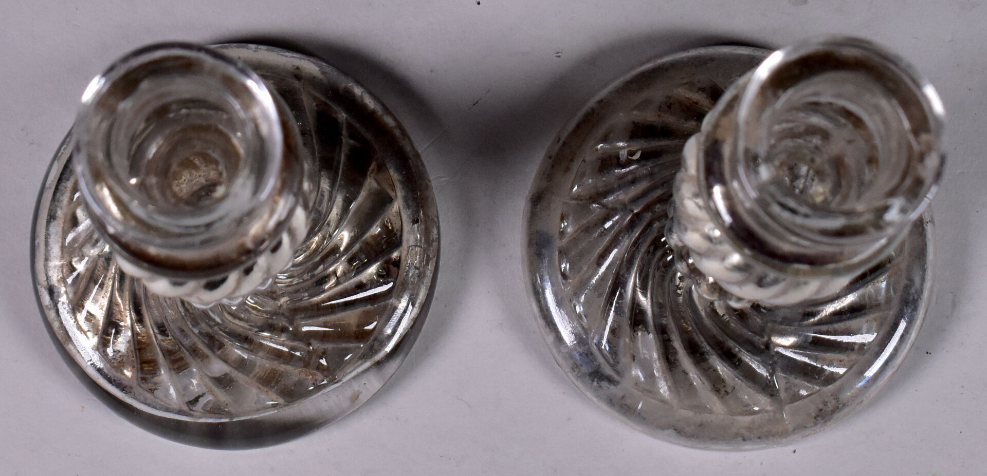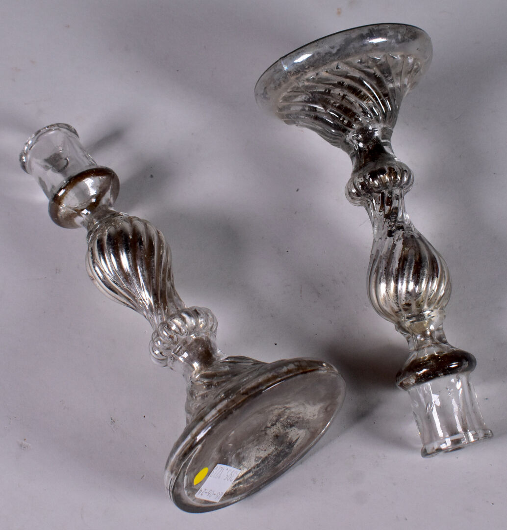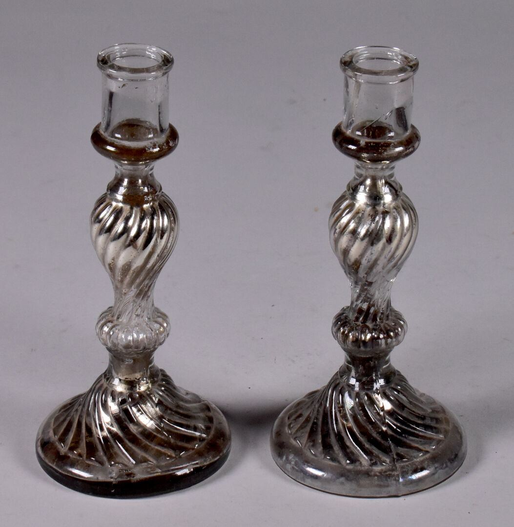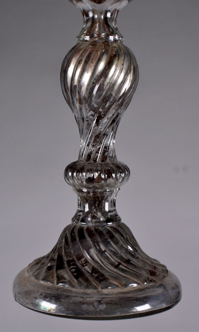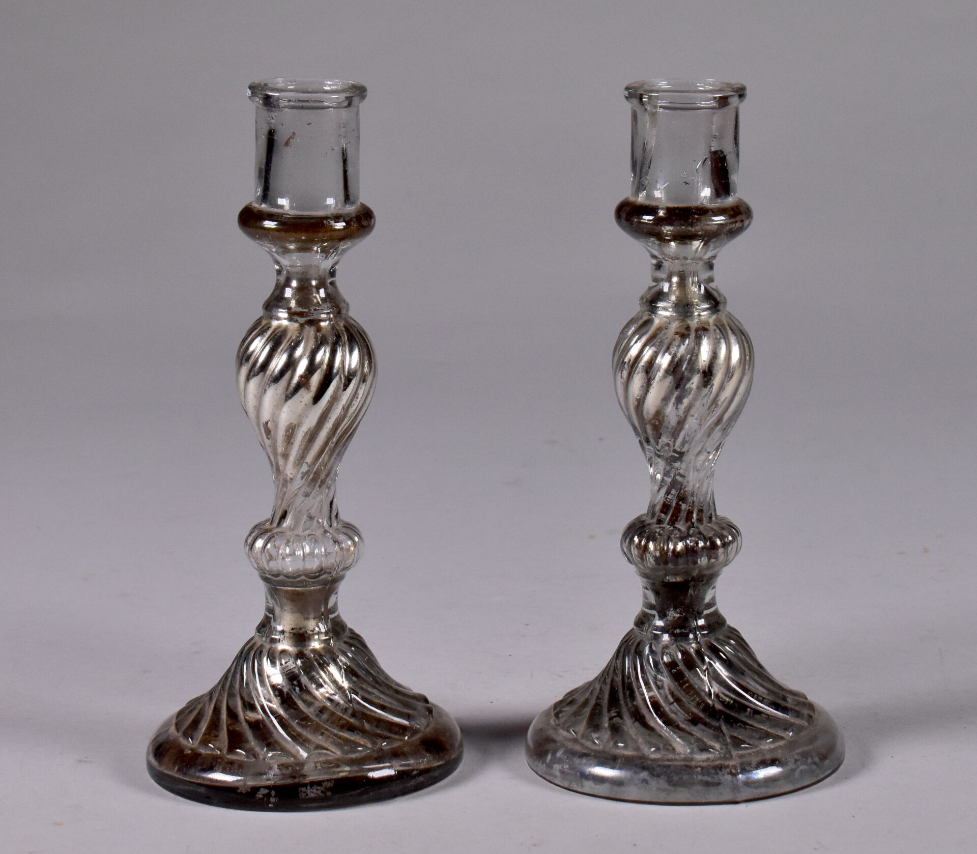Paire de bougeoirs en verre églomisé, le fût balustre à godrons. Haut. : 18,5 cm.