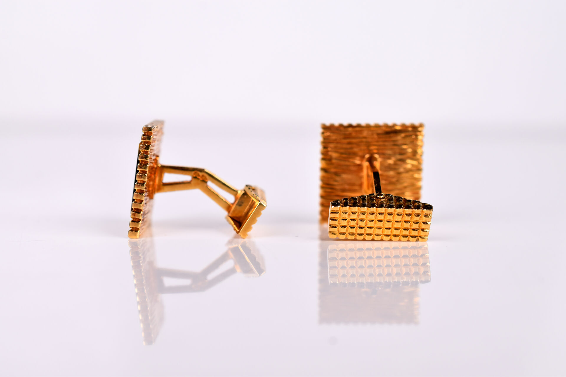 Paire de boutons de manchettes en or jaune 18K 750/1000e à plateau carré orné d’oeil de tigre dans un entourage stylisé. Poids brut. : 13 g.