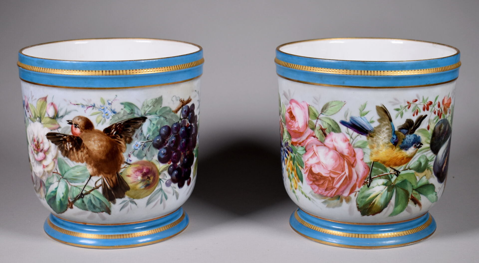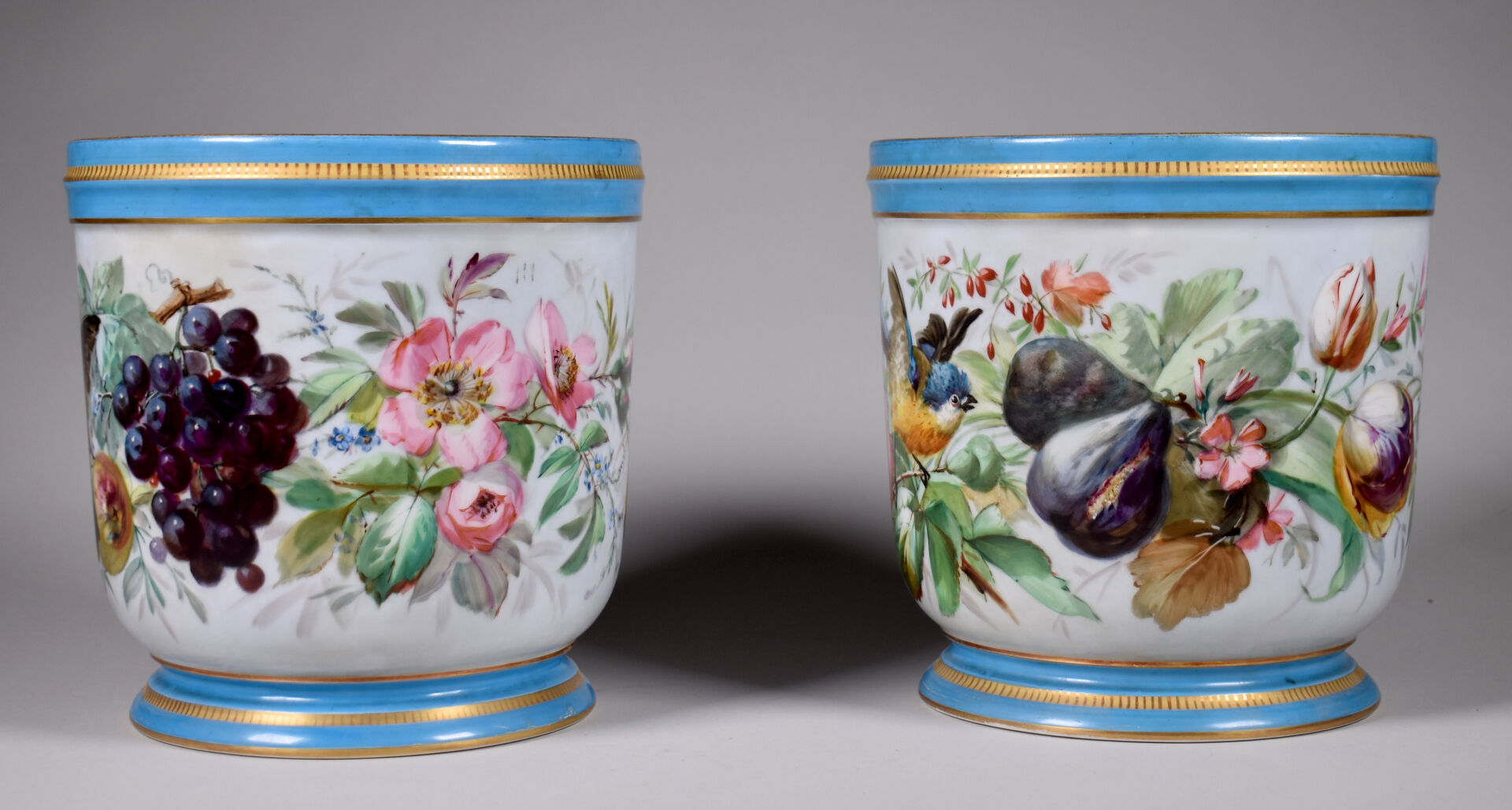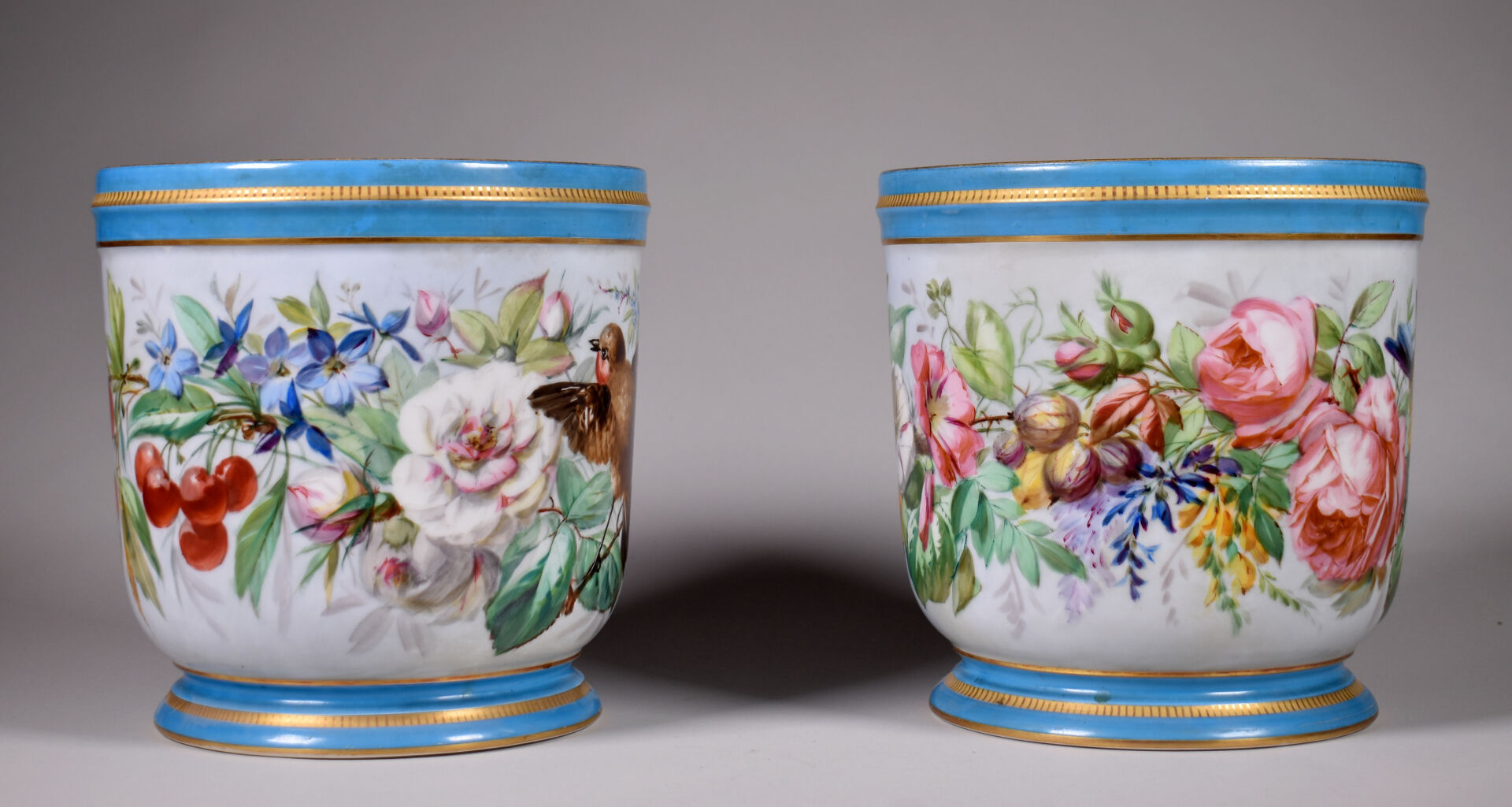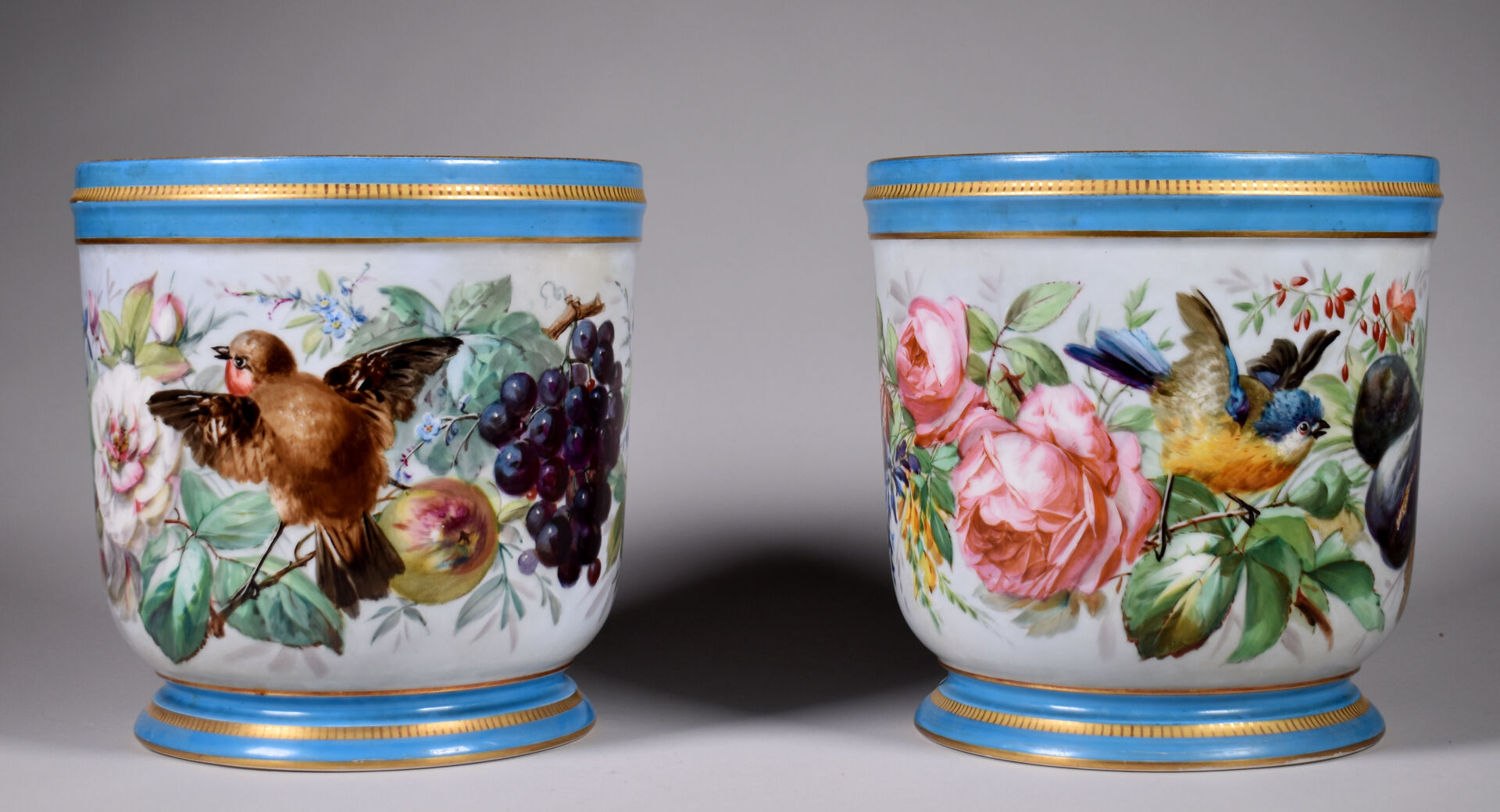 Paire de cache-pots en porcelaine de Paris à décor émaillé en polychromie de fleurs et oiseaux. Porcelaine de Paris, époque Napoléon III. Haut. : 20,5 cm.