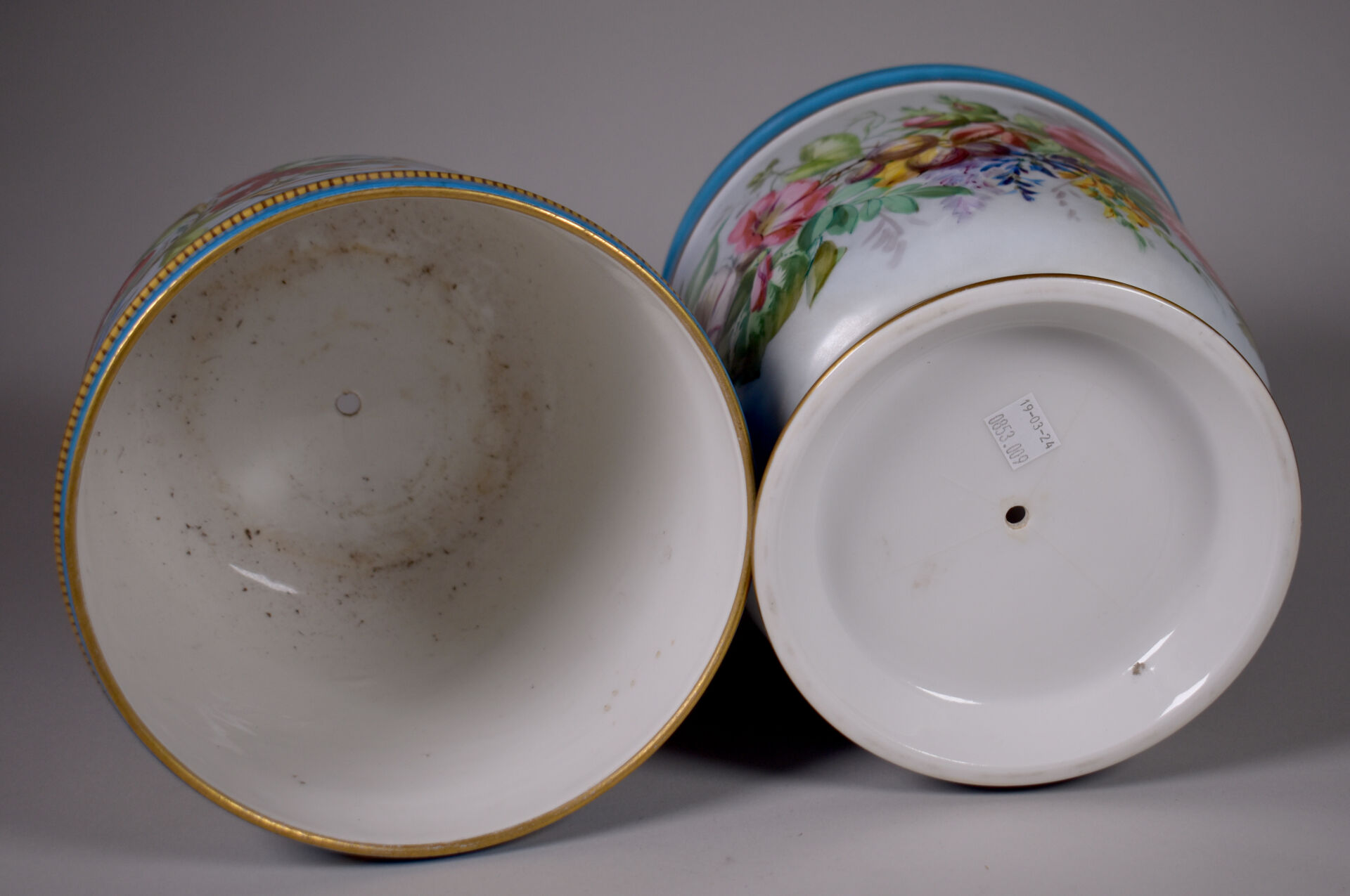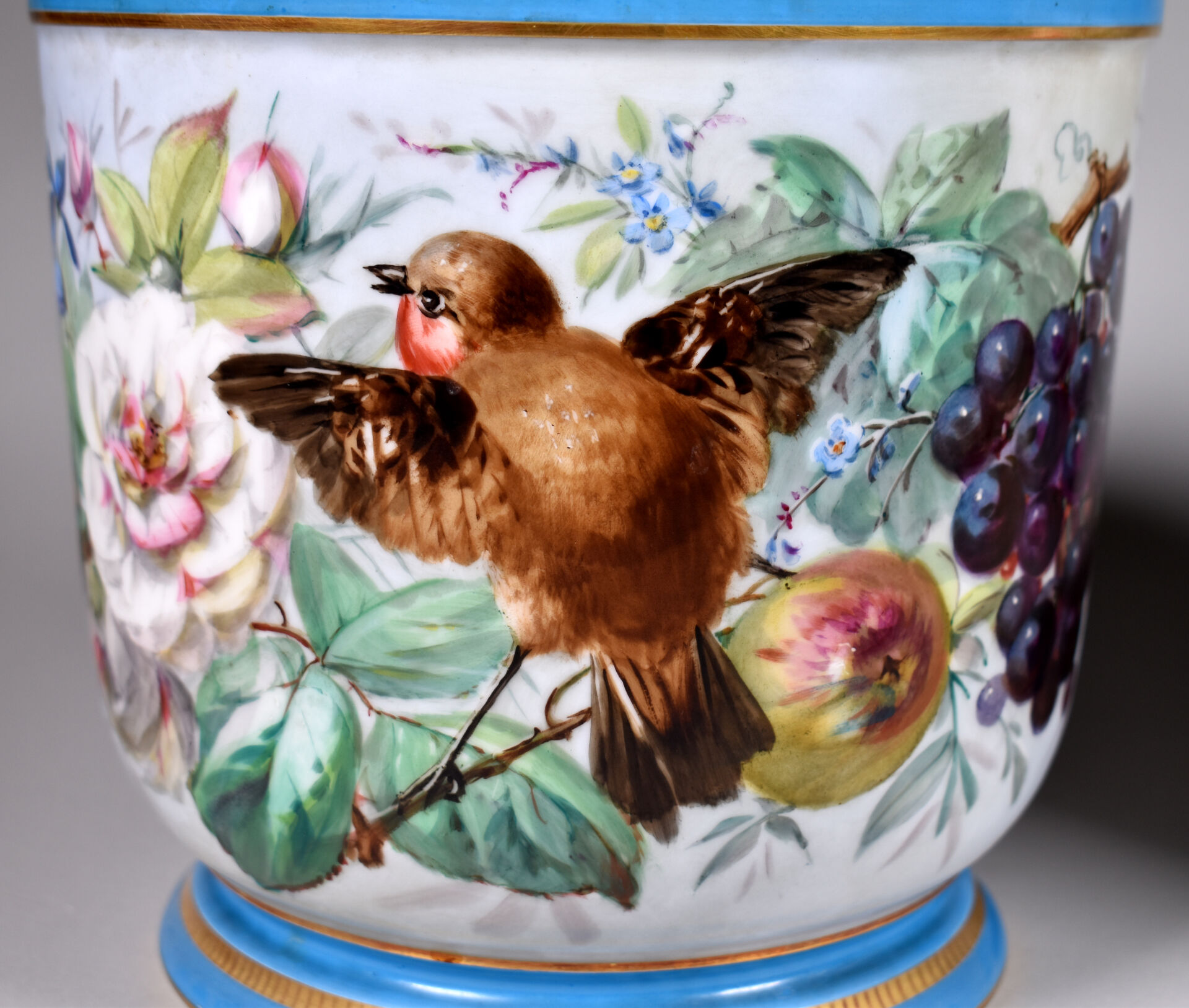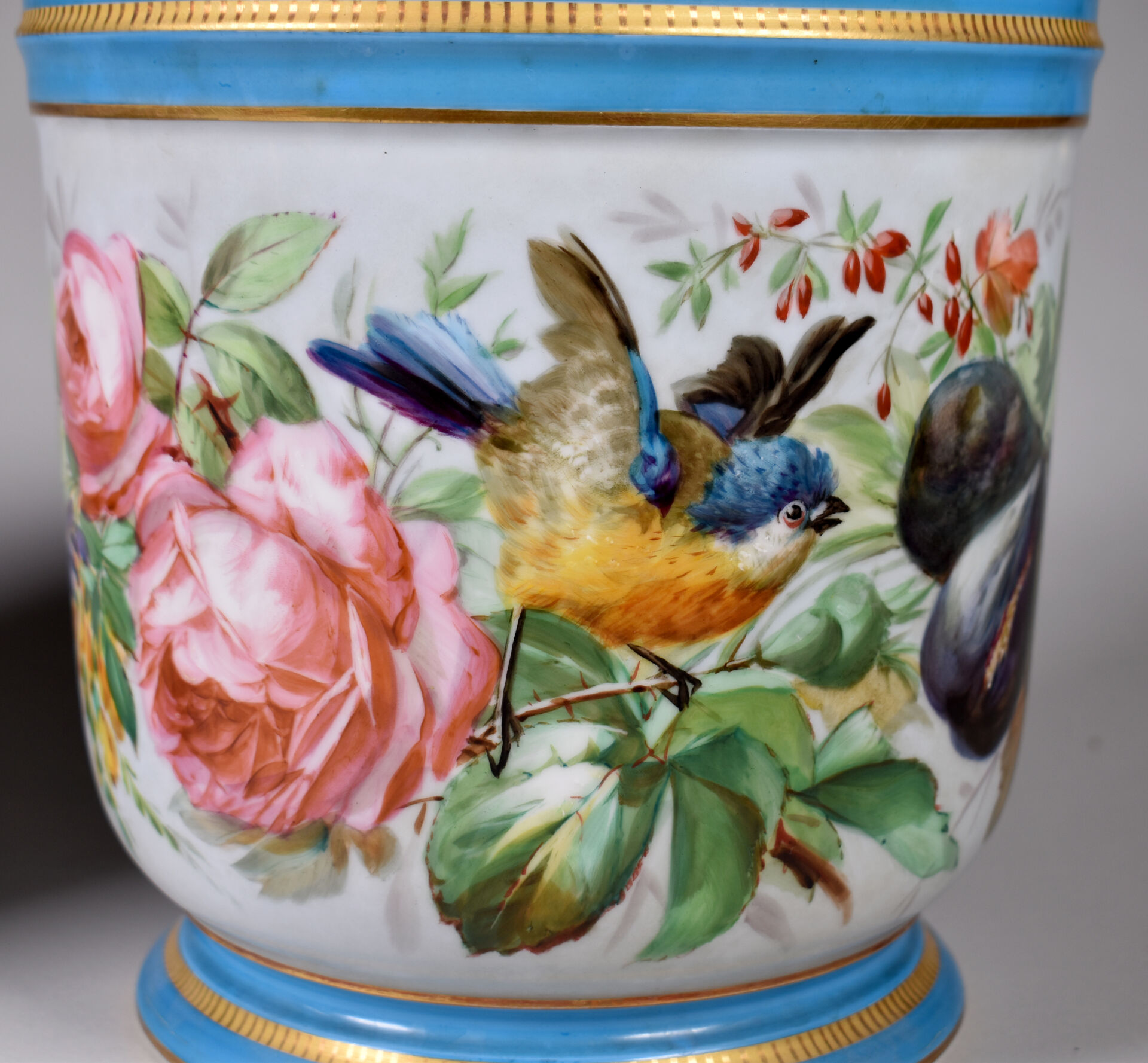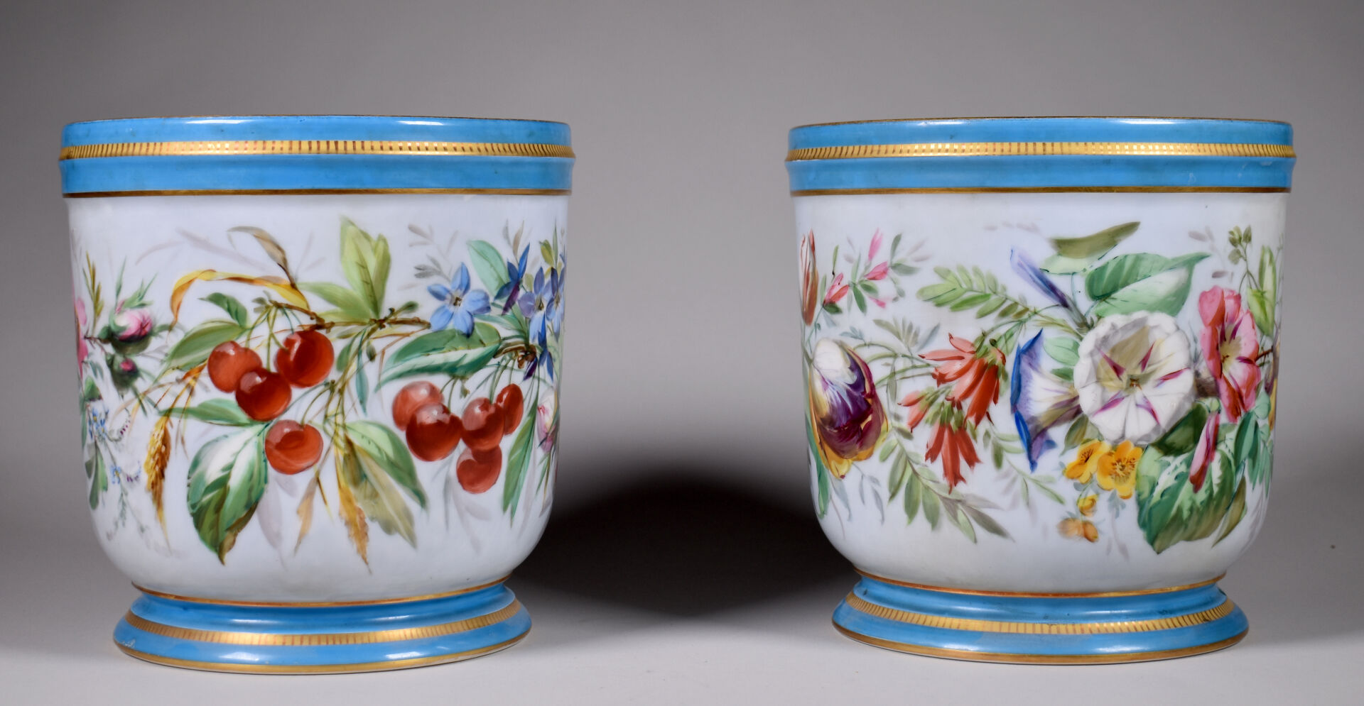 Paire de cache-pots en porcelaine de Paris à décor émaillé en polychromie de fleurs et oiseaux. Porcelaine de Paris, époque Napoléon III. Haut. : 20,5 cm.
