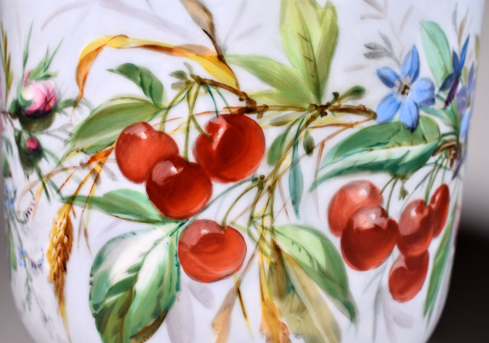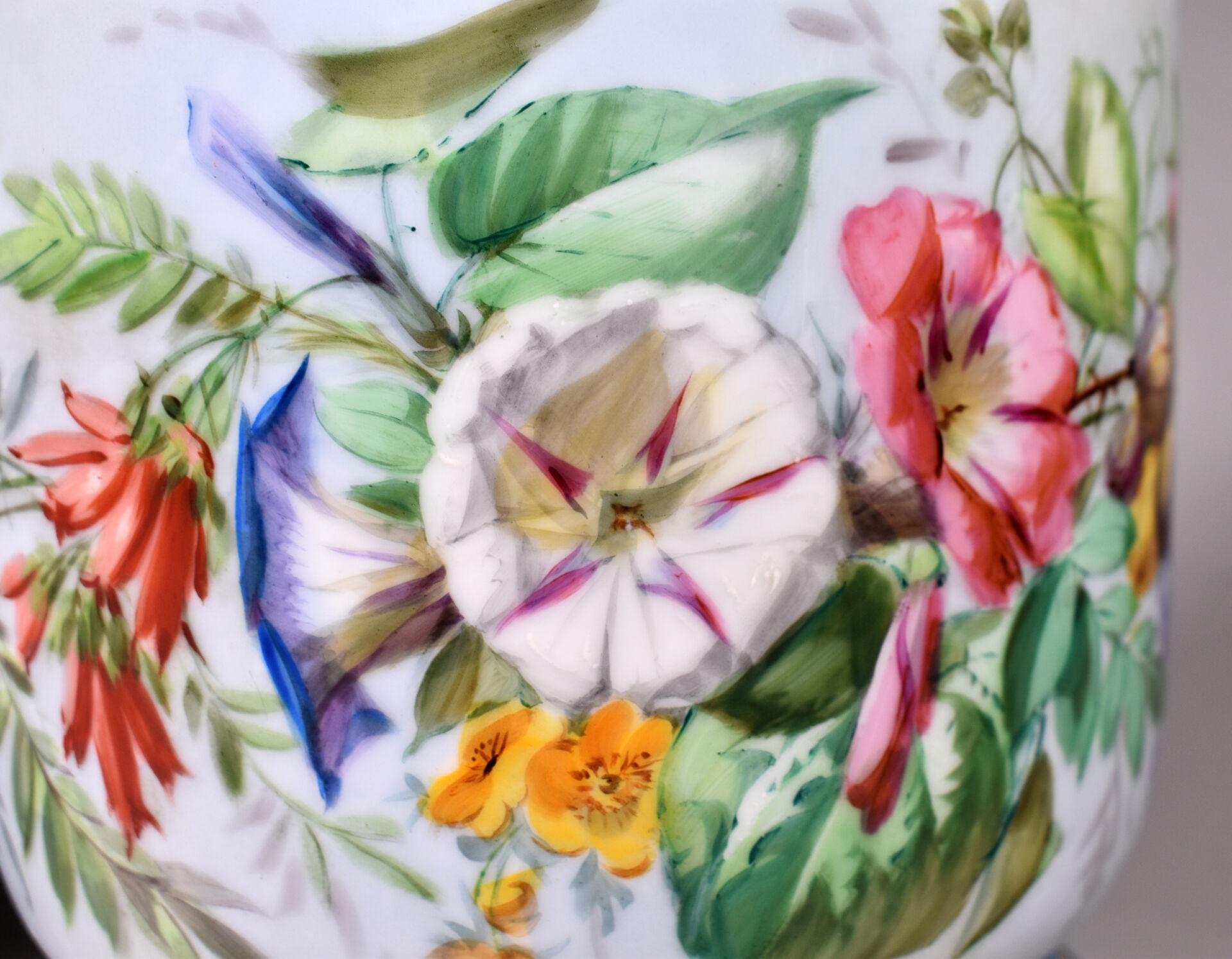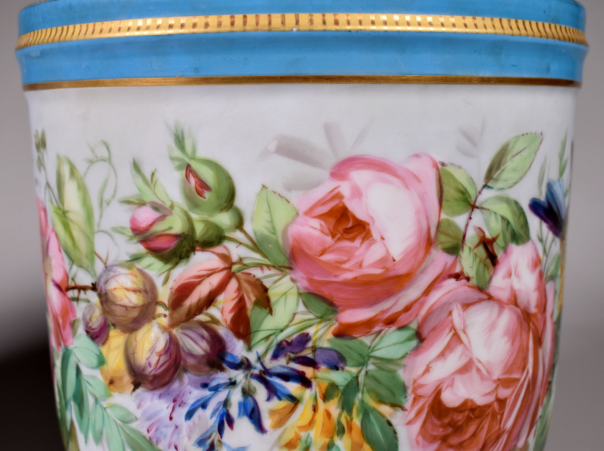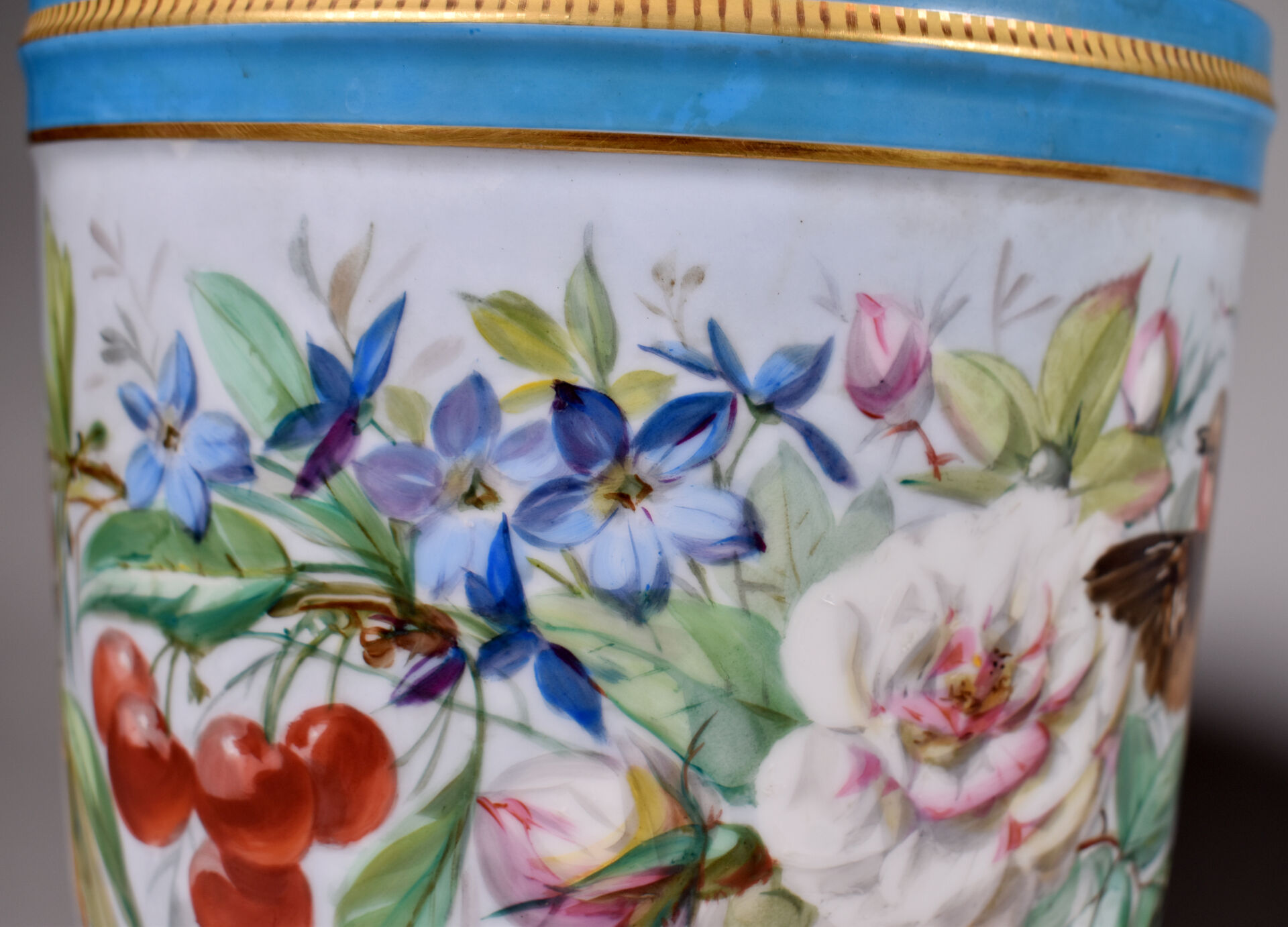 Paire de cache-pots en porcelaine de Paris à décor émaillé en polychromie de fleurs et oiseaux. Porcelaine de Paris, époque Napoléon III. Haut. : 20,5 cm.
