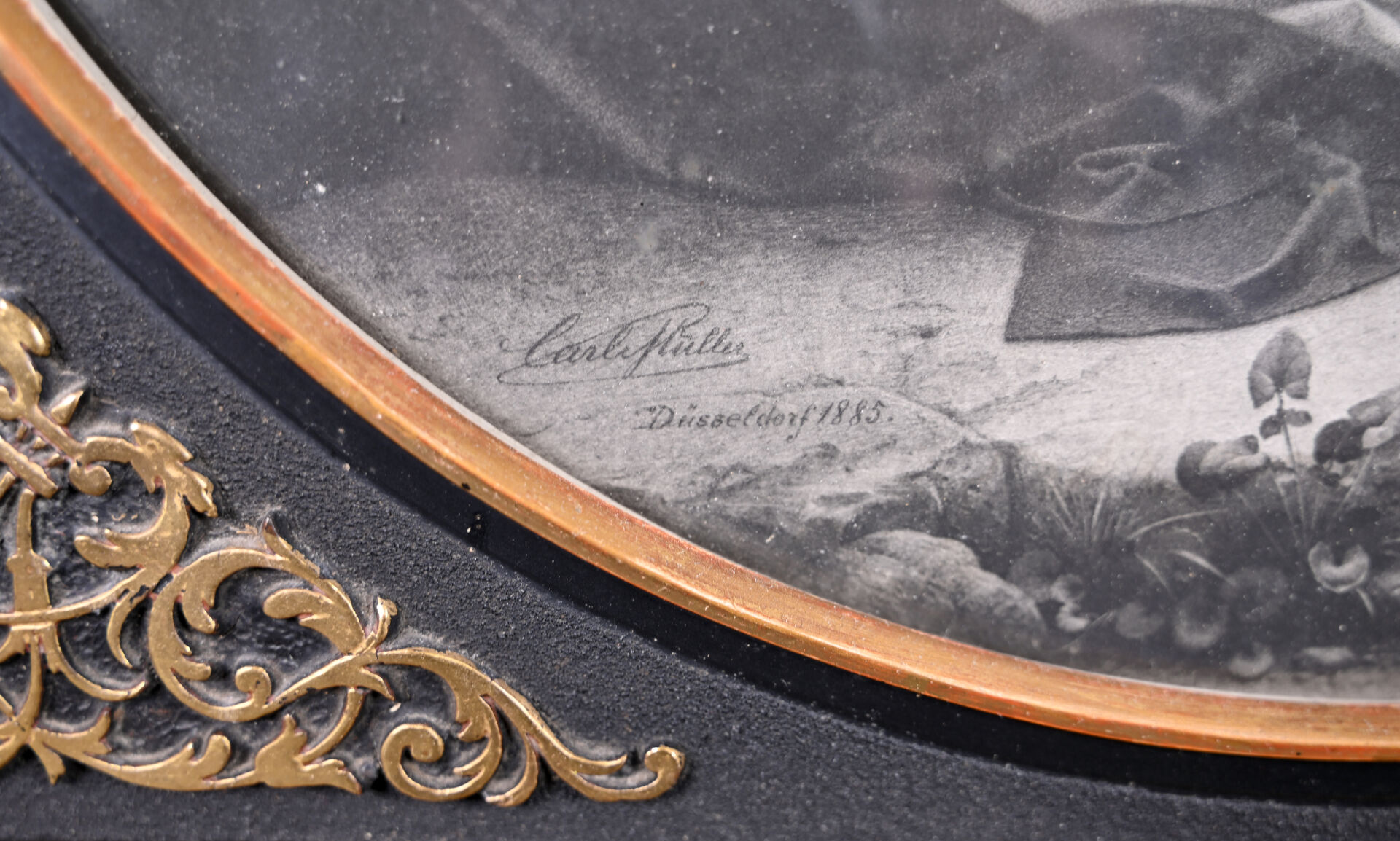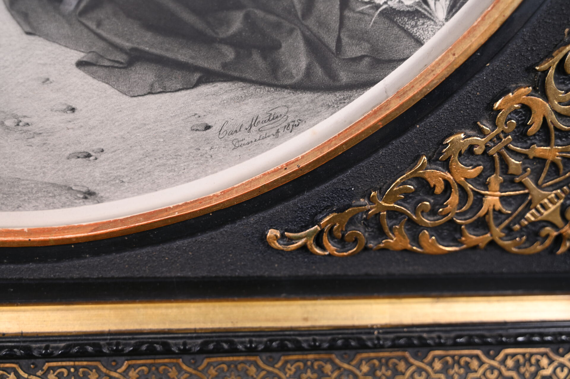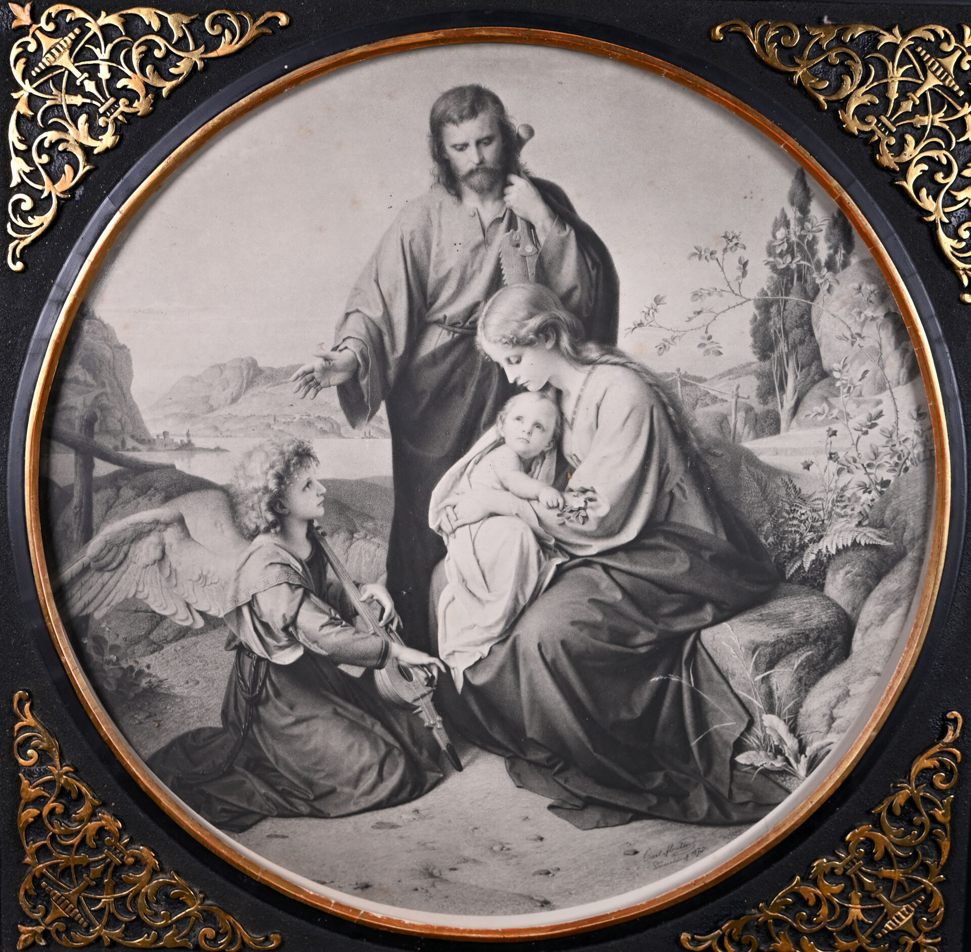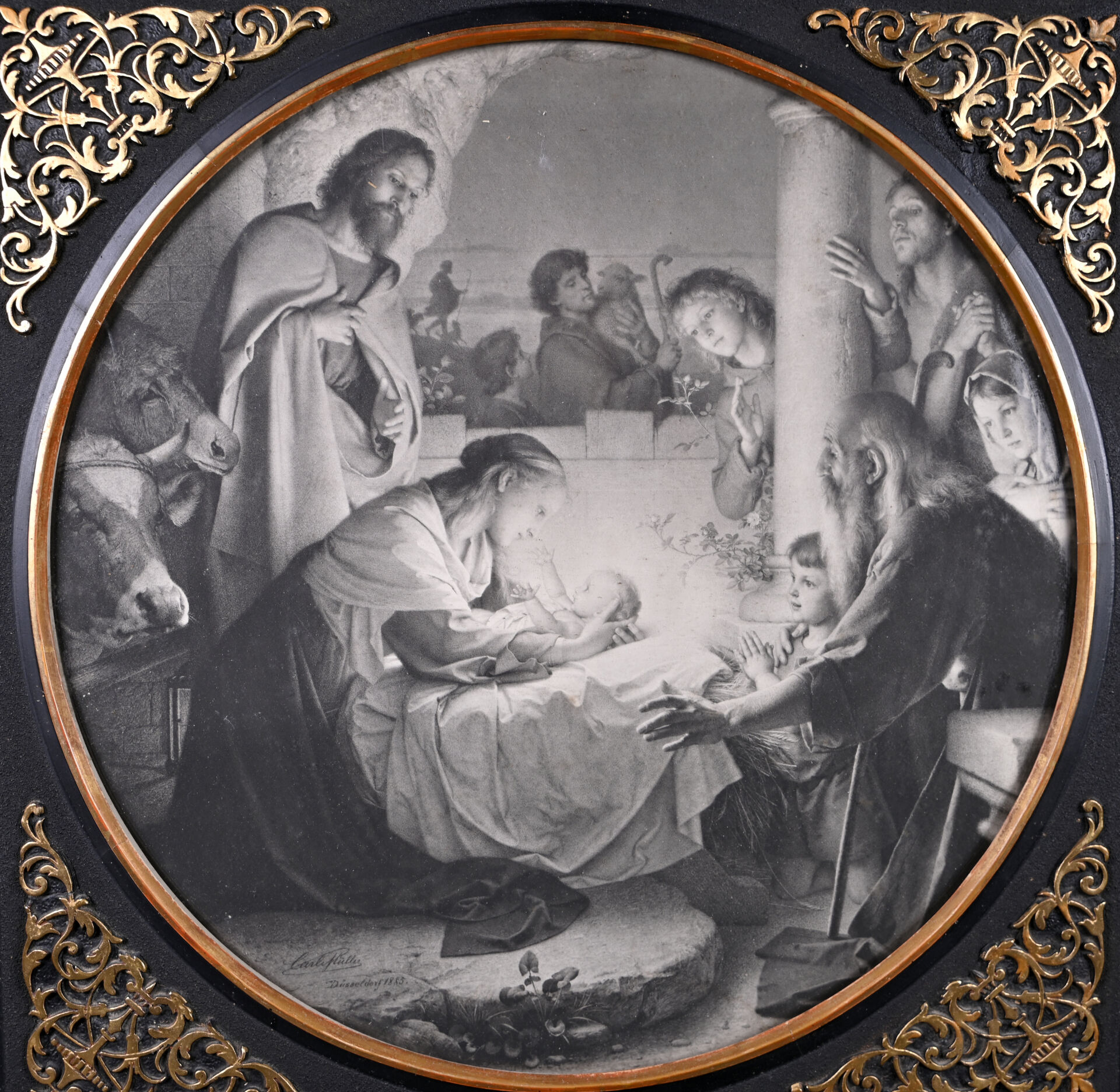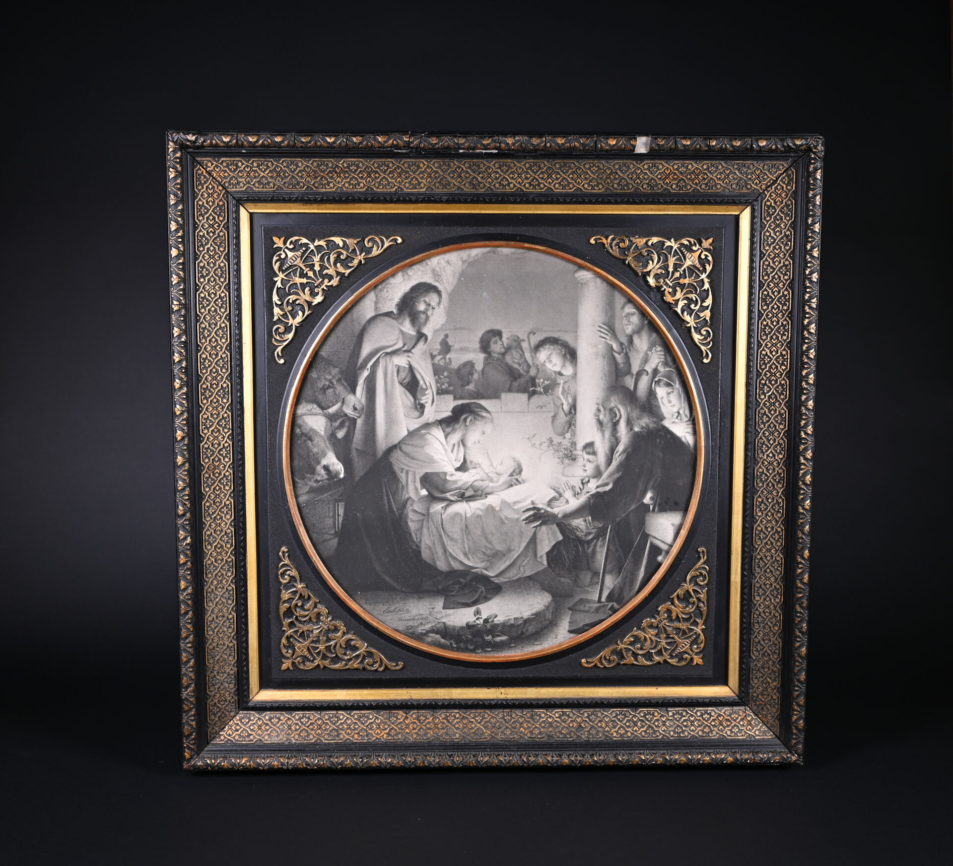 Paire de cadres en bois et stuc doré et bois noirci à vue ronde. A l’intérieur deux gravures représentant la nativité et la Saint famille avec un ange musicien (usures). Epoque Napoléon III. 62,5 x 62,5 cm.