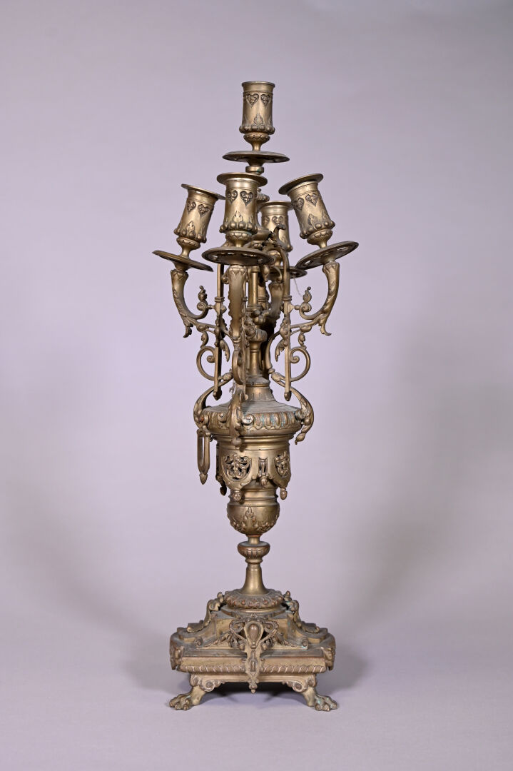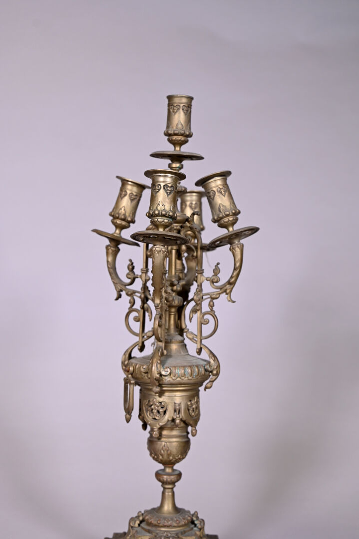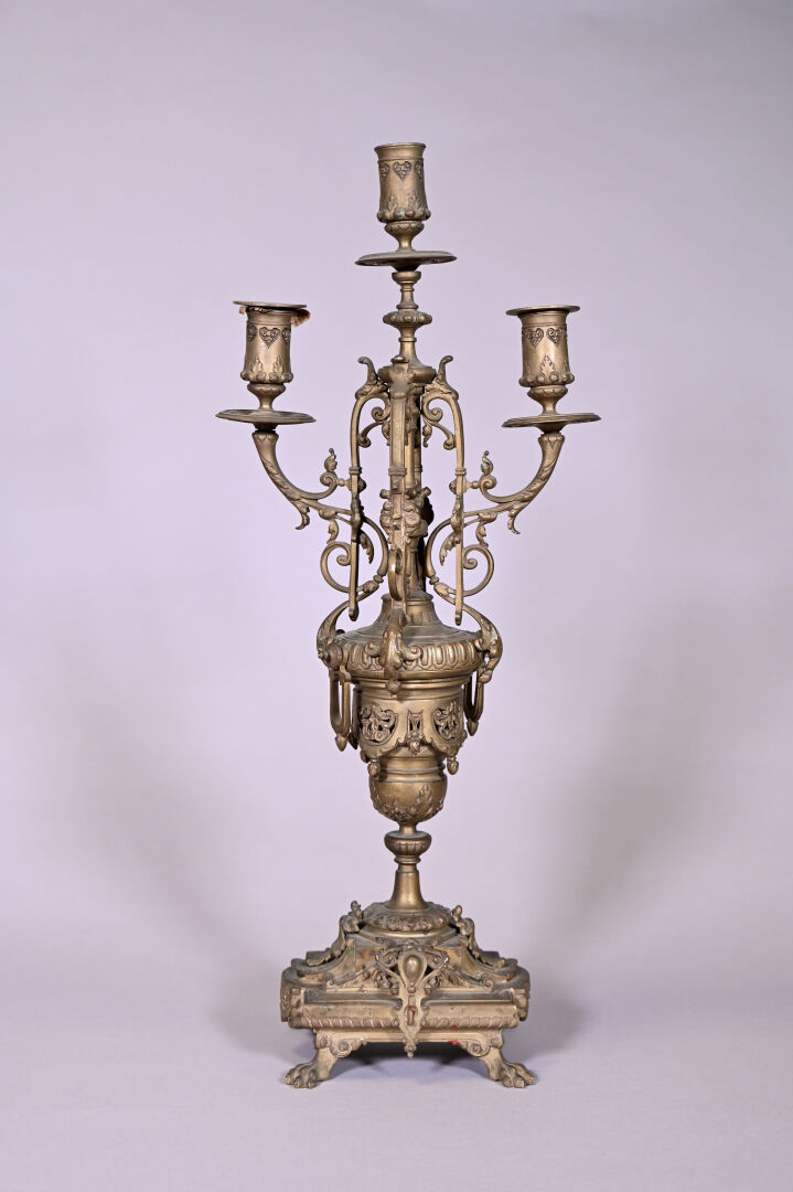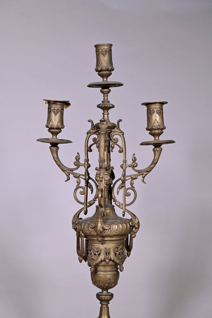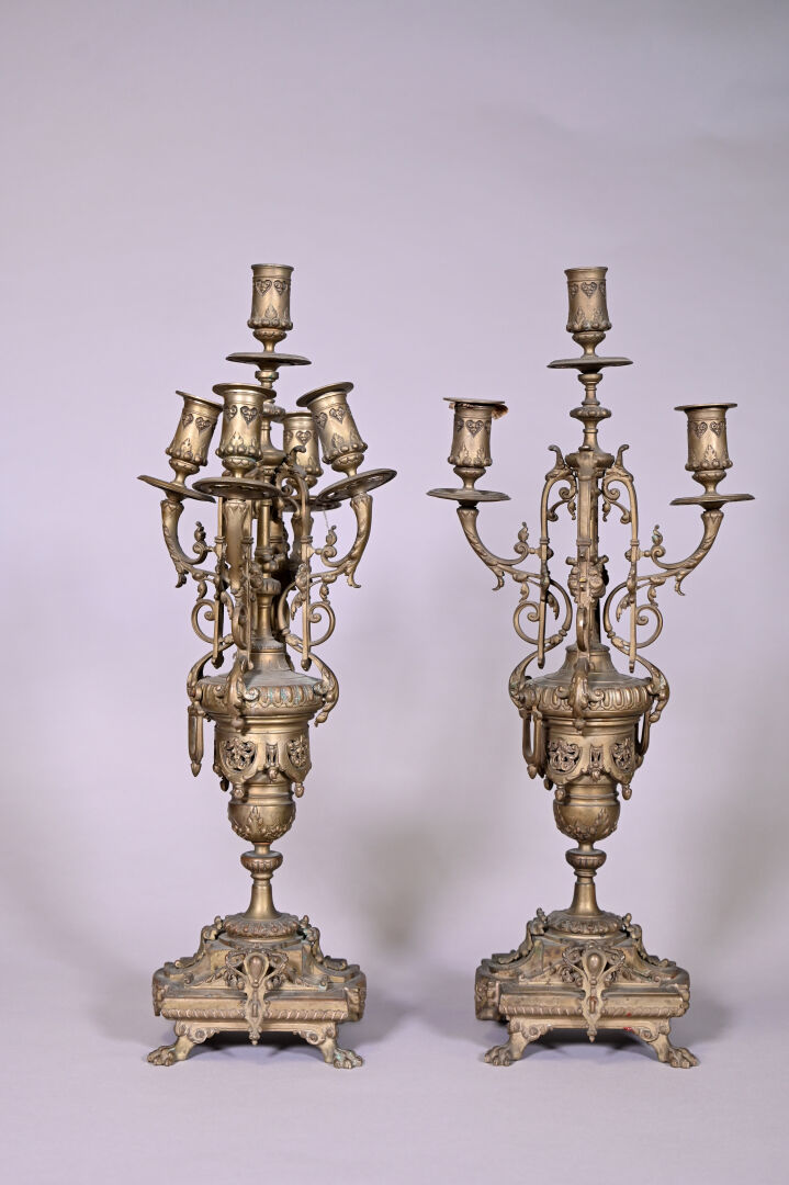 Paire de candélabres en bronze anciennement doré à 4 bras et cinq lumières (un avec deux bras manquants) pietement griffe (usures, déformations). Style Henri II. On joint un chandelier en bronze à larges cannelures (déformations). Style Louis XVI. Haut. : 61 cm et Haut. : 27 cm.
