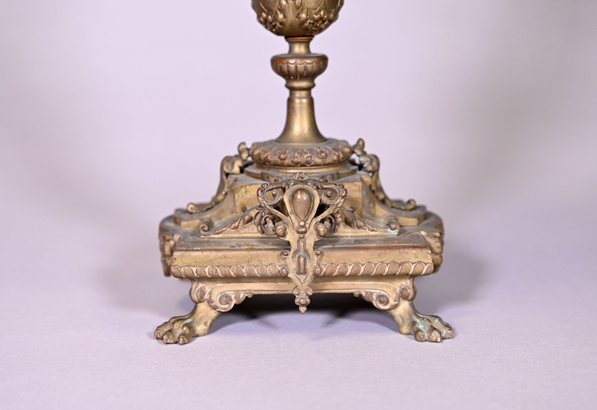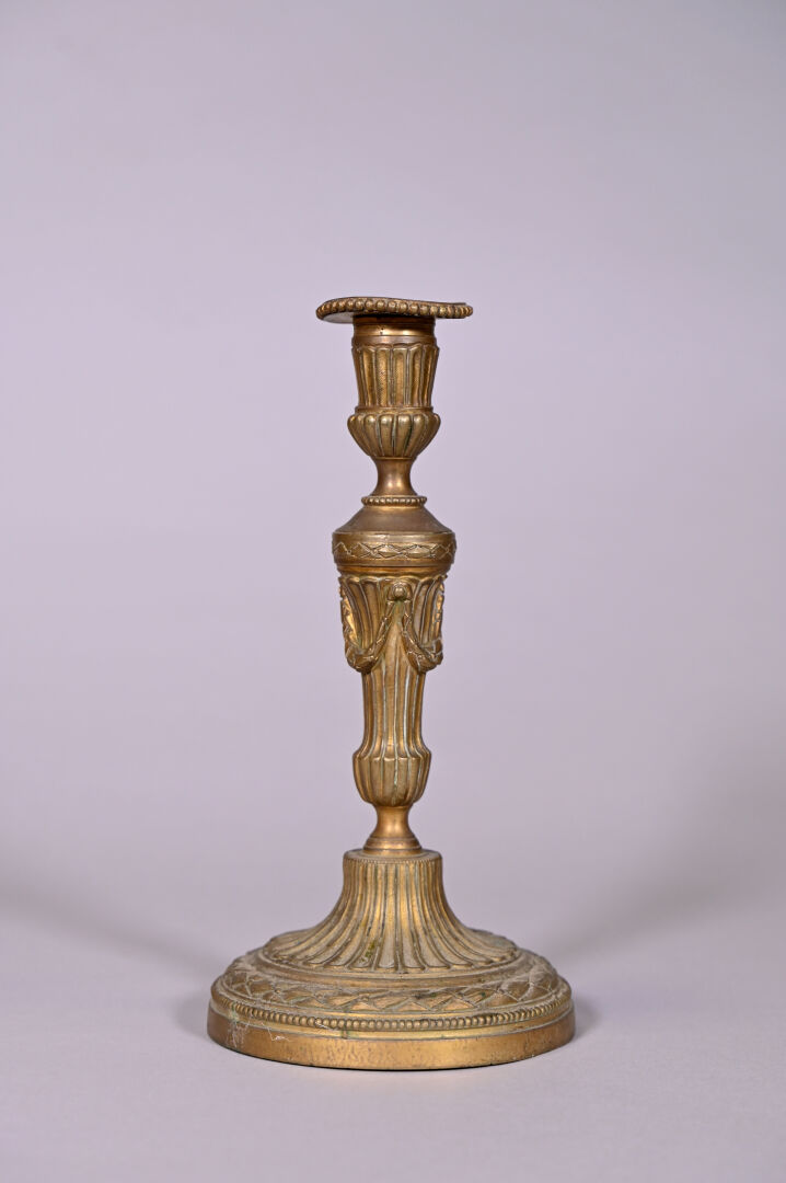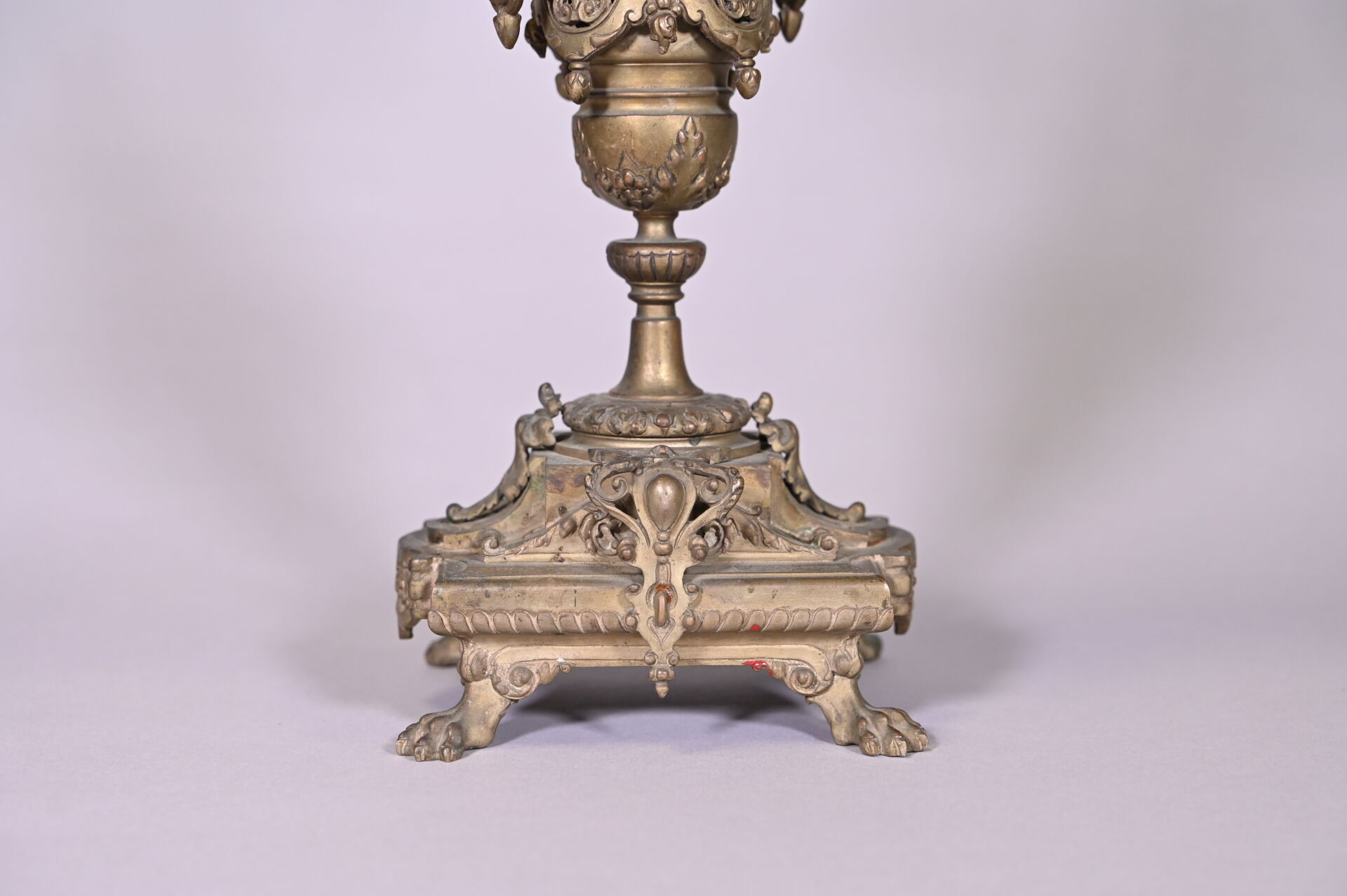 Paire de candélabres en bronze anciennement doré à 4 bras et cinq lumières (un avec deux bras manquants) pietement griffe (usures, déformations). Style Henri II. On joint un chandelier en bronze à larges cannelures (déformations). Style Louis XVI. Haut. : 61 cm et Haut. : 27 cm.