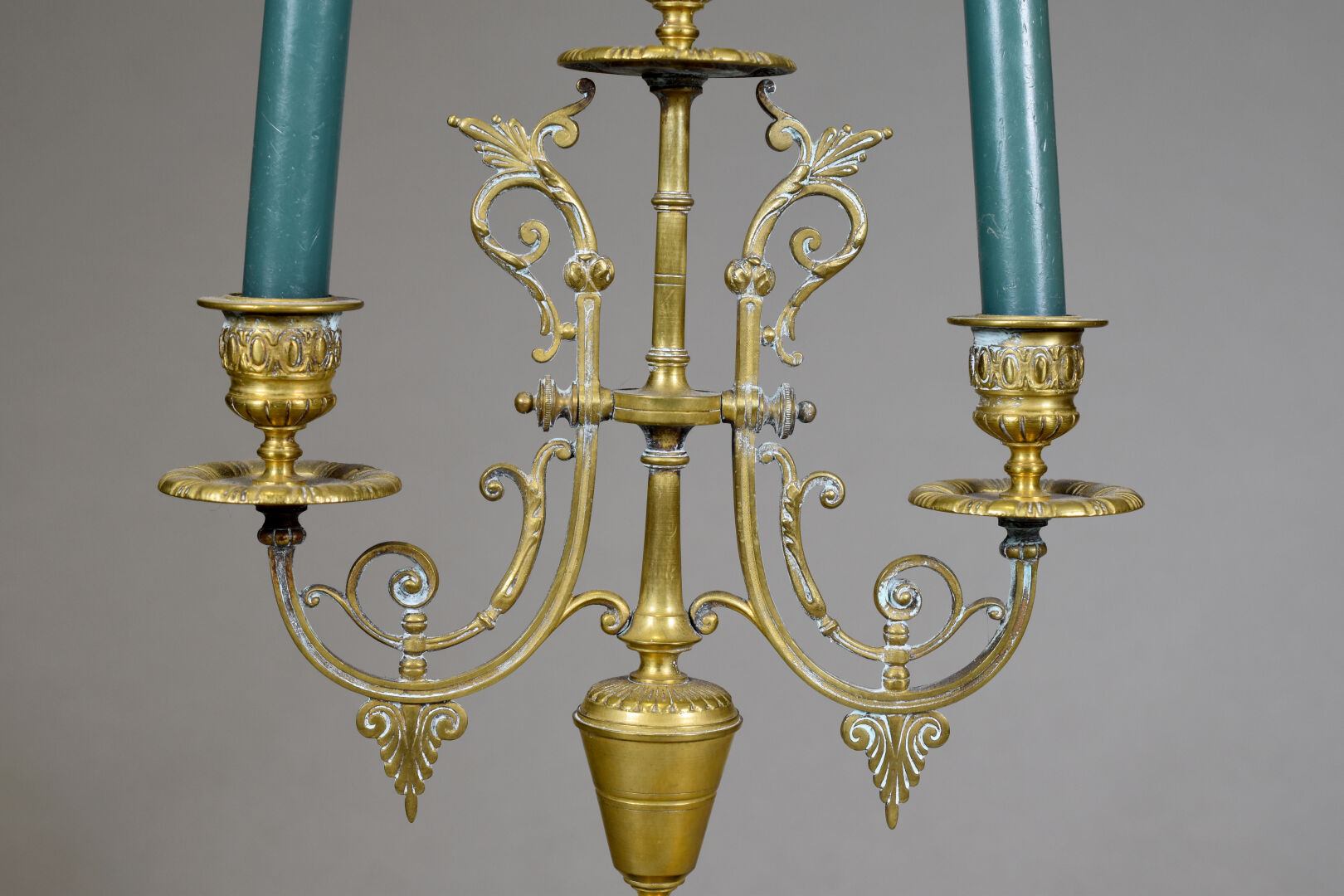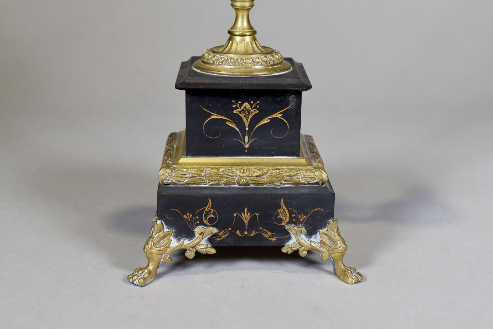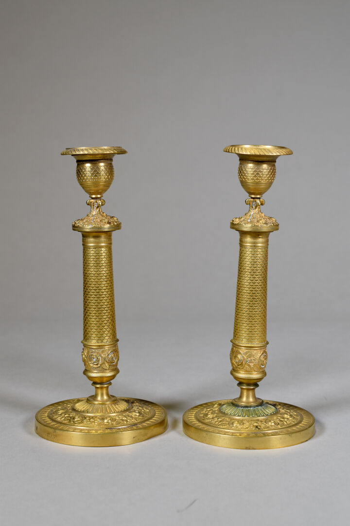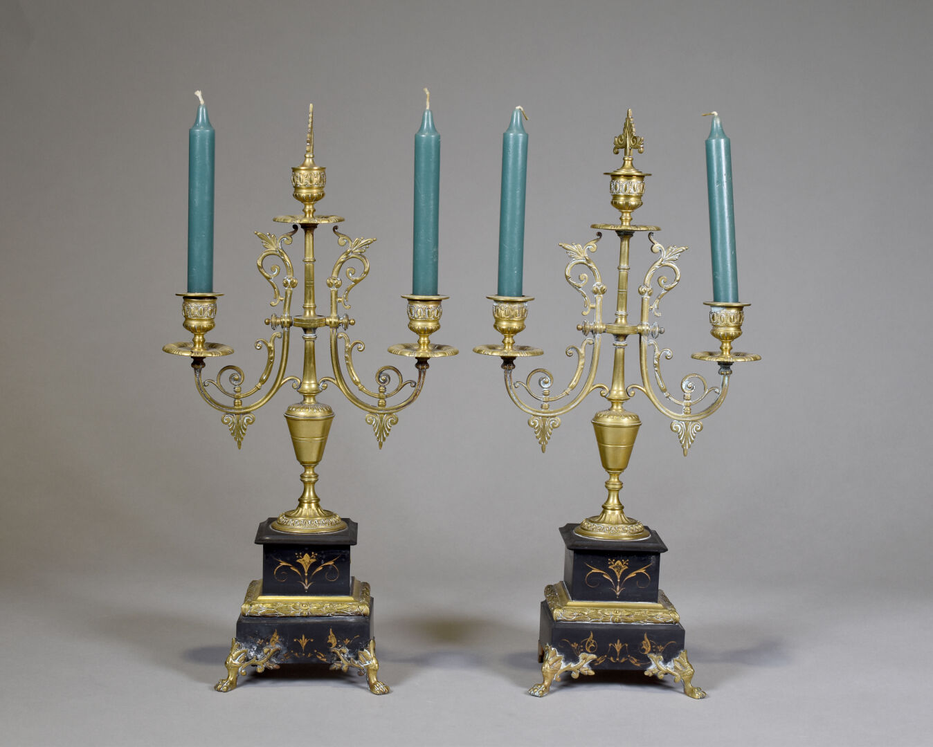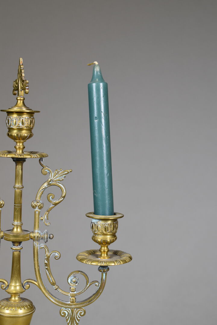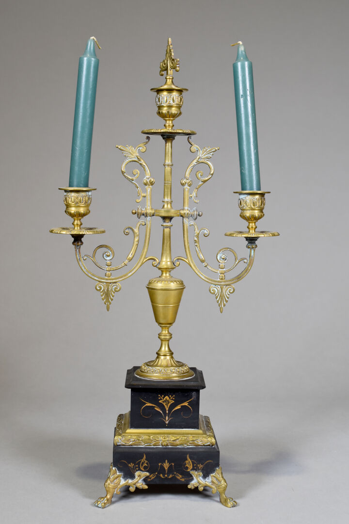 Paire de candélabres en bronze et laiton à deux bras et trois lumières, la base en marbre noir, pieds antérieurs griffes. Époque Napoléon III. Haut. : 47.5 cm. On joint une paire de bougeoirs à décor d’écailles (quelques enfoncements). Fin XIXe – début XXè siècle. Haut. : 23 cm.