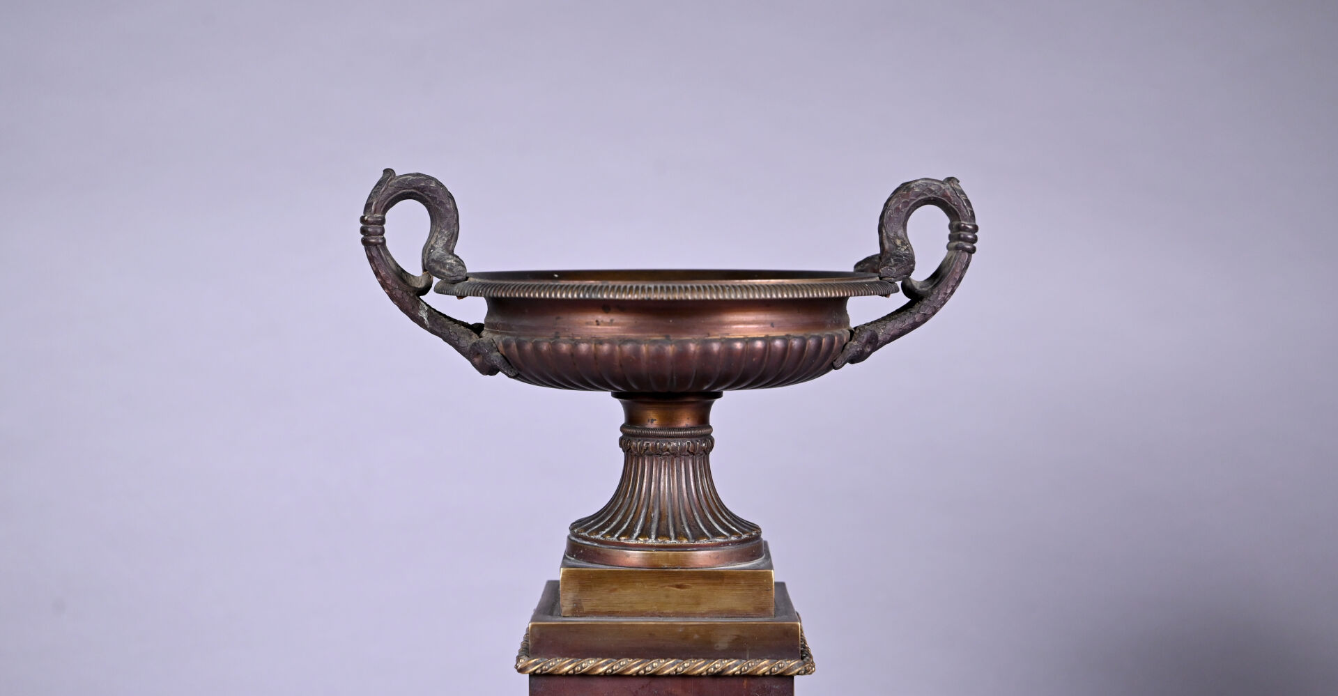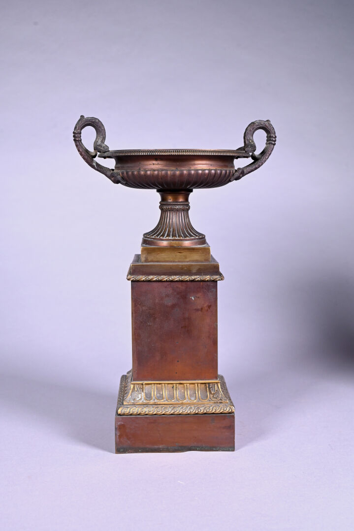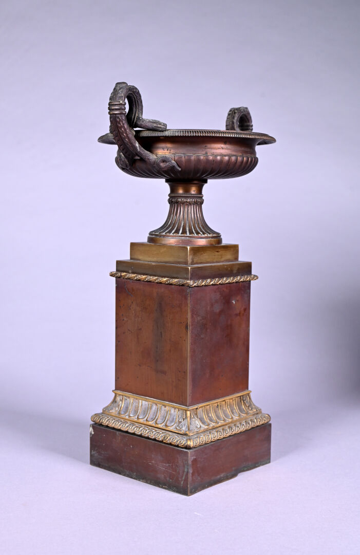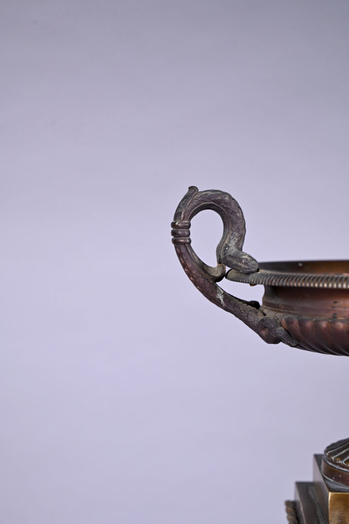 Paire de cassolettes en bronze à patines brun, médaille et doré (quelques enfoncements). Les anses formées de serpents. Style Louis XVI. Haut. : 33 cm.